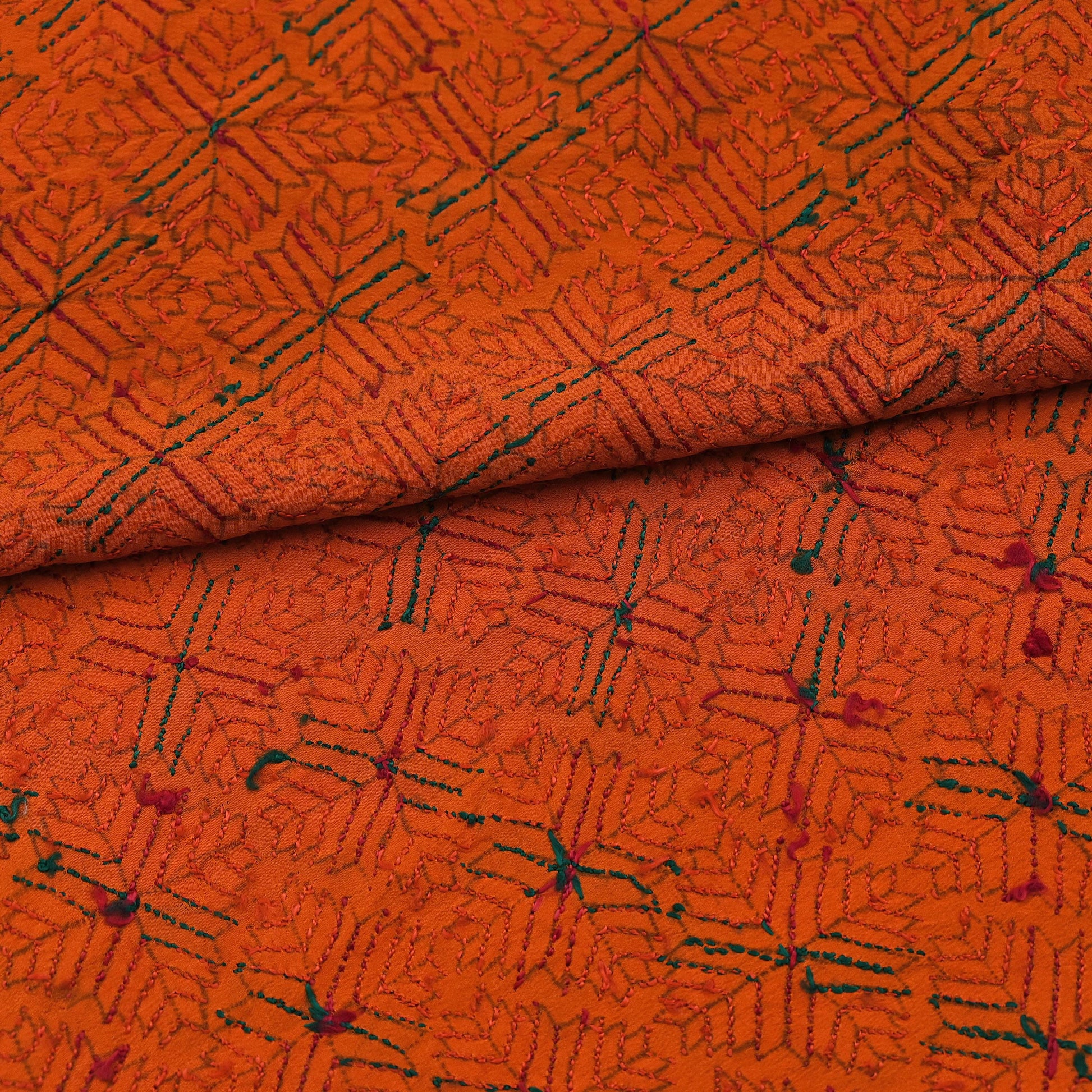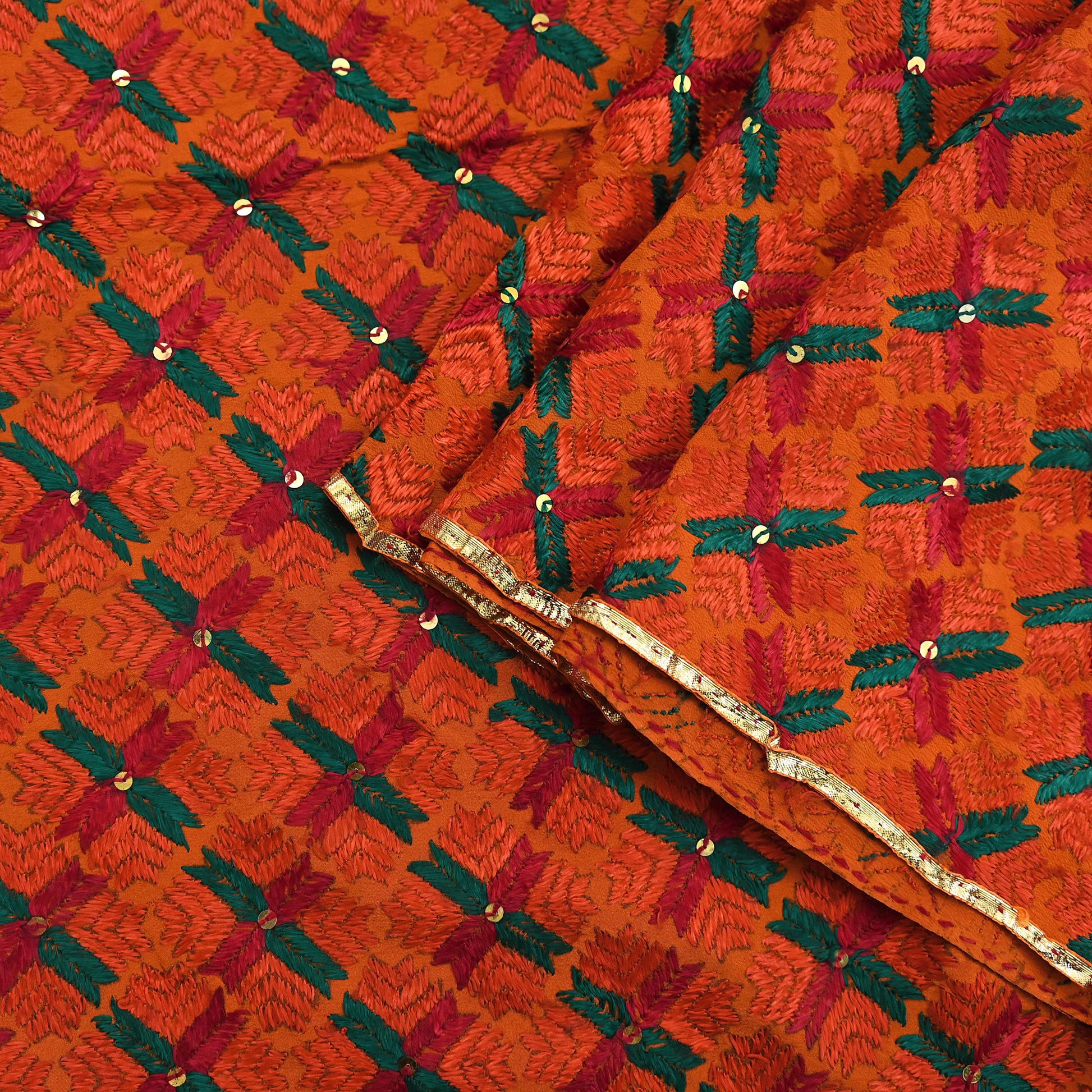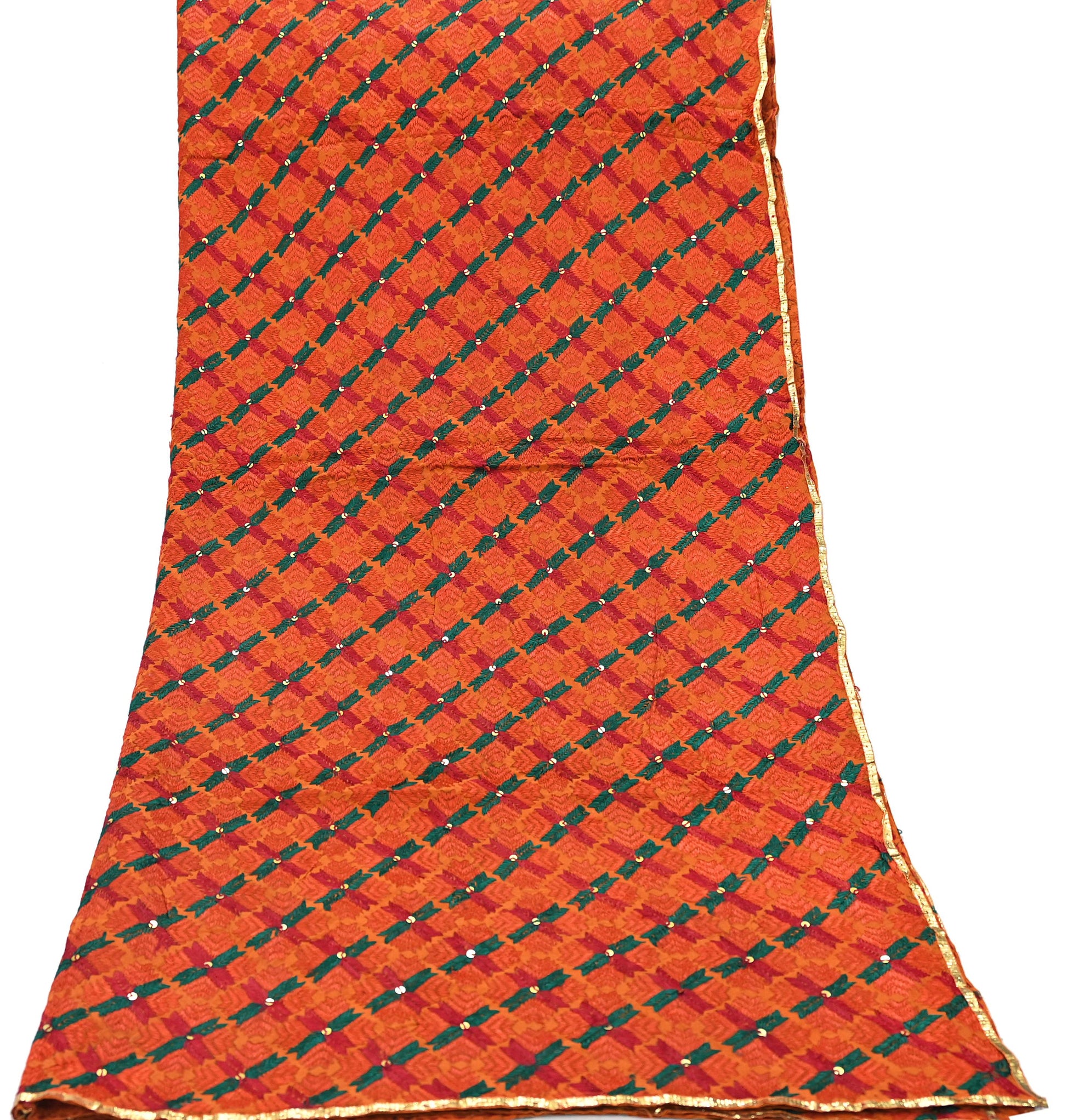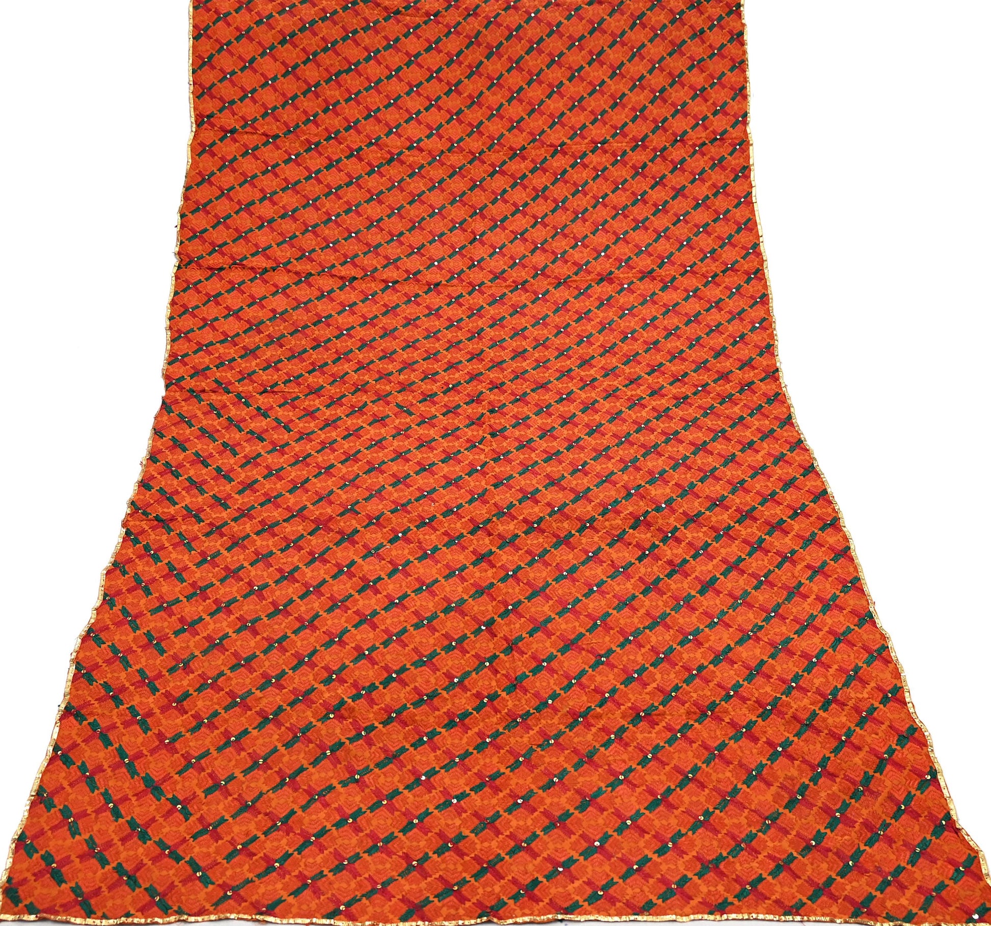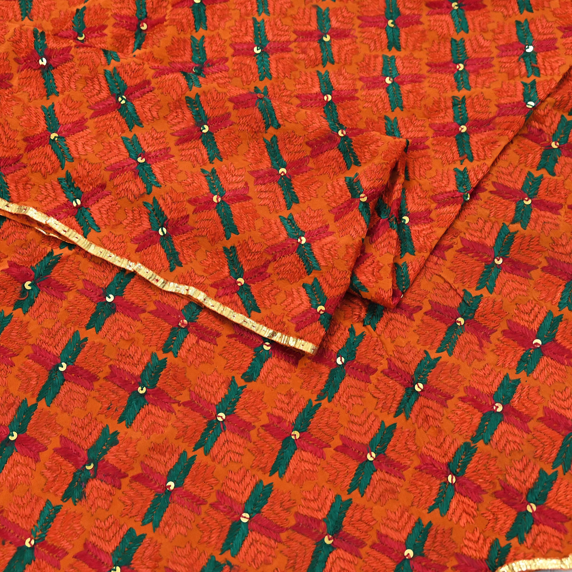 Stunning Very Heavy Hand Embroidered Bagh Phulkari OrangeColored Pure Crepe silk Dupatta/Stole. Dupatta Has Floral Design With Orange, Green & Red Thread Work Is The Highlight Of The Dupatta. Golden Sequins Work. Golden Gota lace work on borders. The Thick Stitches Of Phulkari Make The Pattern All The More Emphasized. Further Enhancing The Beauty Of The Dupatta. A very traditional dupatta with beautiful craftsmanship which I am sure you will truly appreciate.