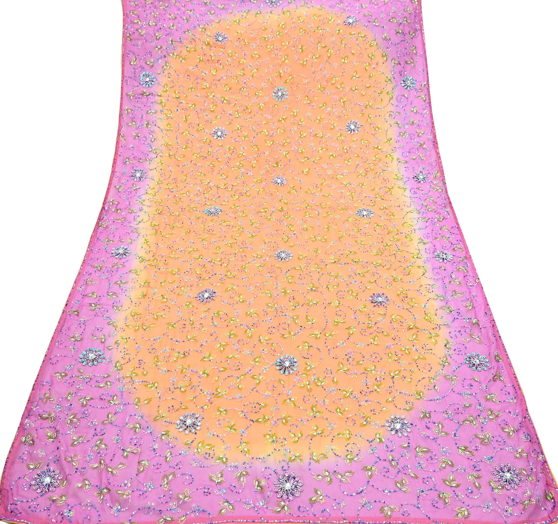 Indian Vintage Orange & Pink Dupatta Pure Georgette silk Long Stole Hand Embroidered Scarves Stole Veil Wrap Sequins