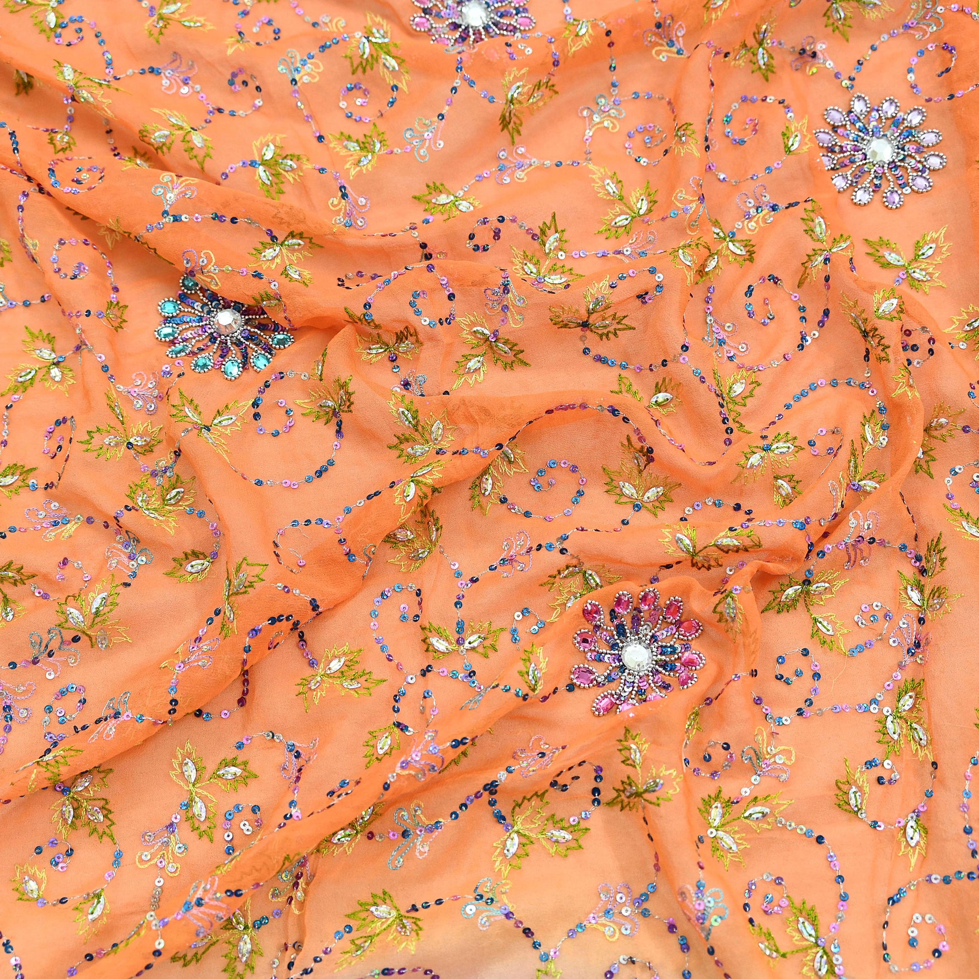 Stunning Beautiful Look Dupatta Hand Embroidered Pure Georgette Silk Dupatta/Stole In Orange & Pink Color Fabric. This one of a kind item is difficult to express in words. Border feature is floral design embroidered Multi Sequins, Pink & Silver Beaded/ Stones, Silver Zari work embellished work is the highlight of the dupatta. Also you can see similar work with floral pattern in center part adds to its beauty. Sequins work is giving a fabulous look to the dupatta. Awesome one !!!