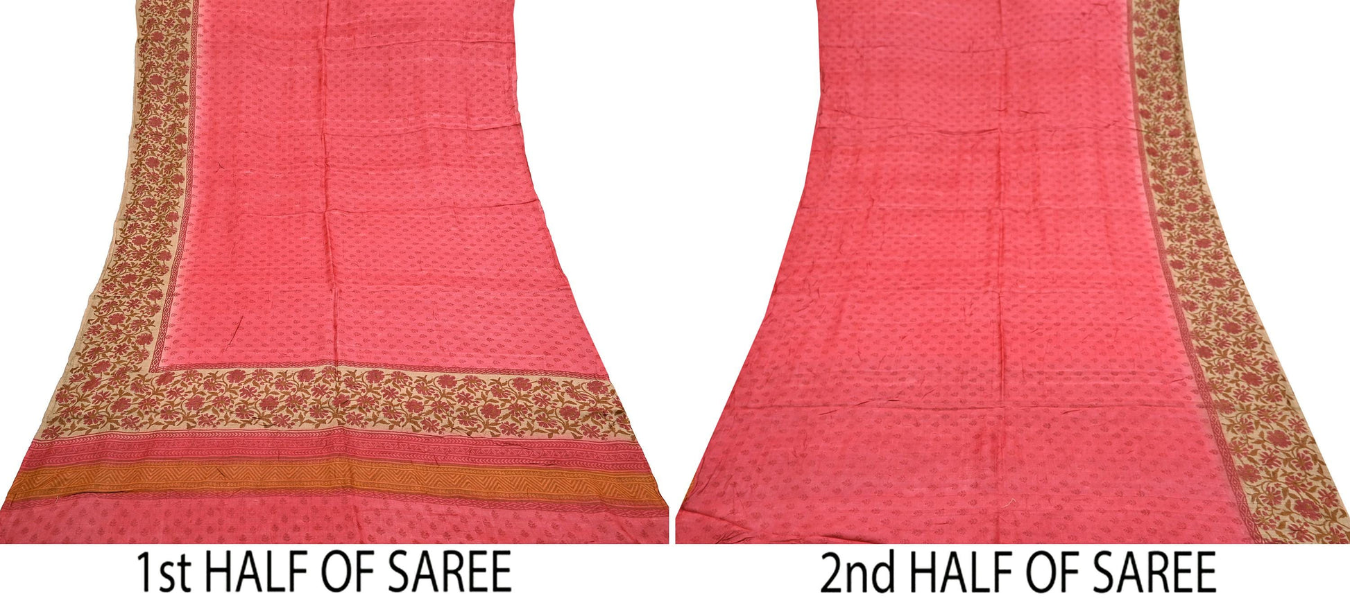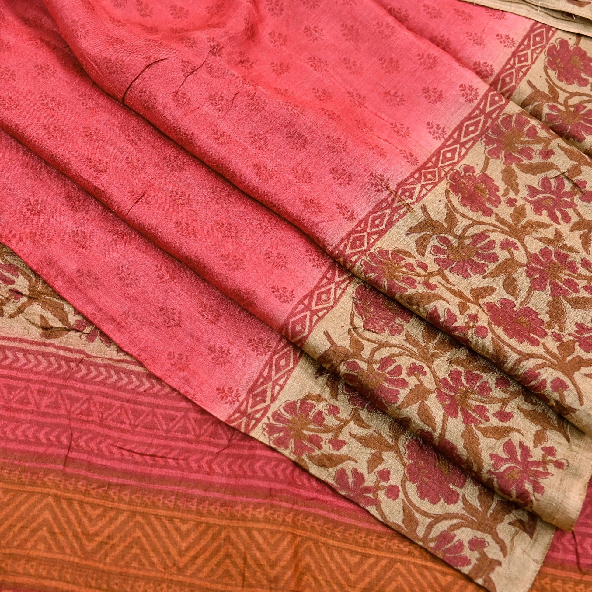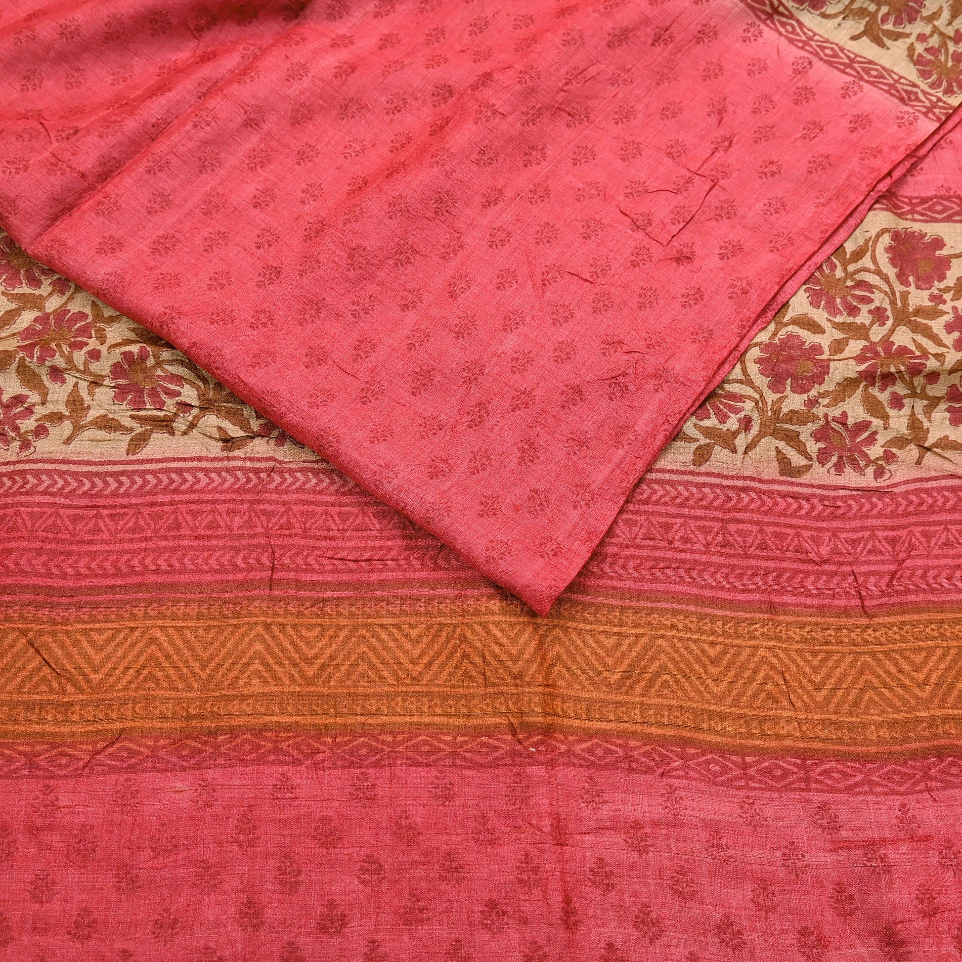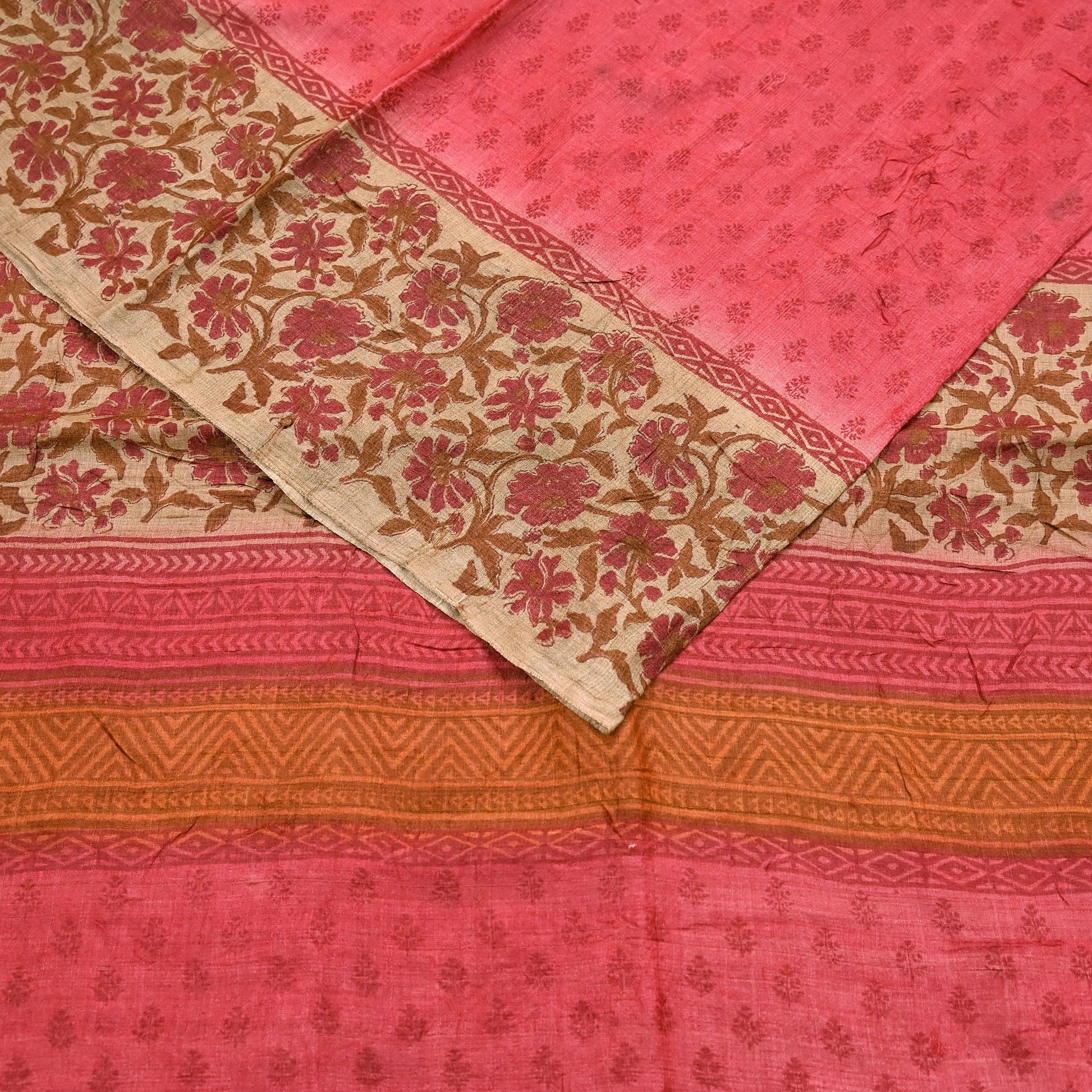 Indian Vintage Peach & Beige Saree Pure Khadi Silk Handloom Printed Sari Fabric 5yd Ethnic Wear Sari Floral Designs Dress making Crafting