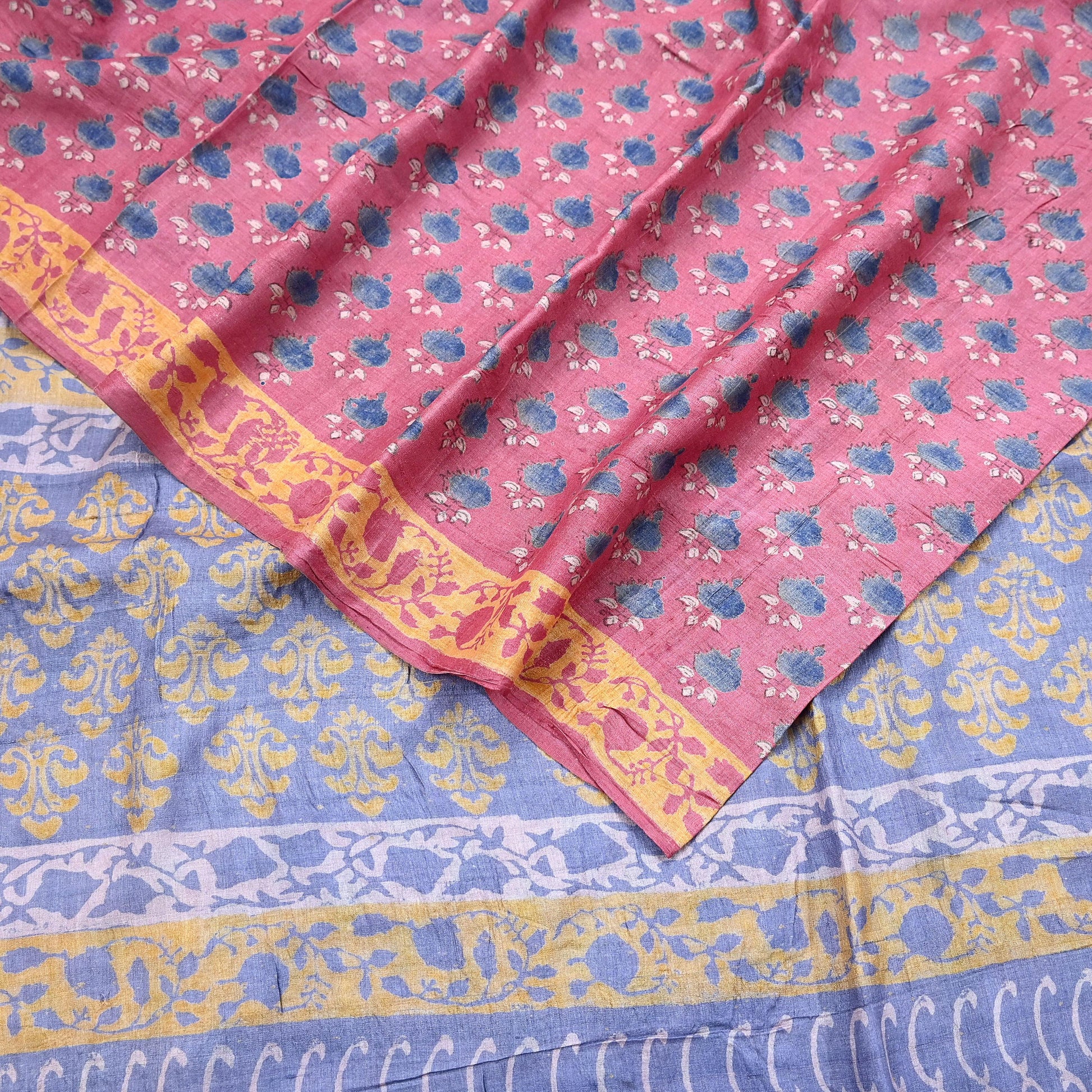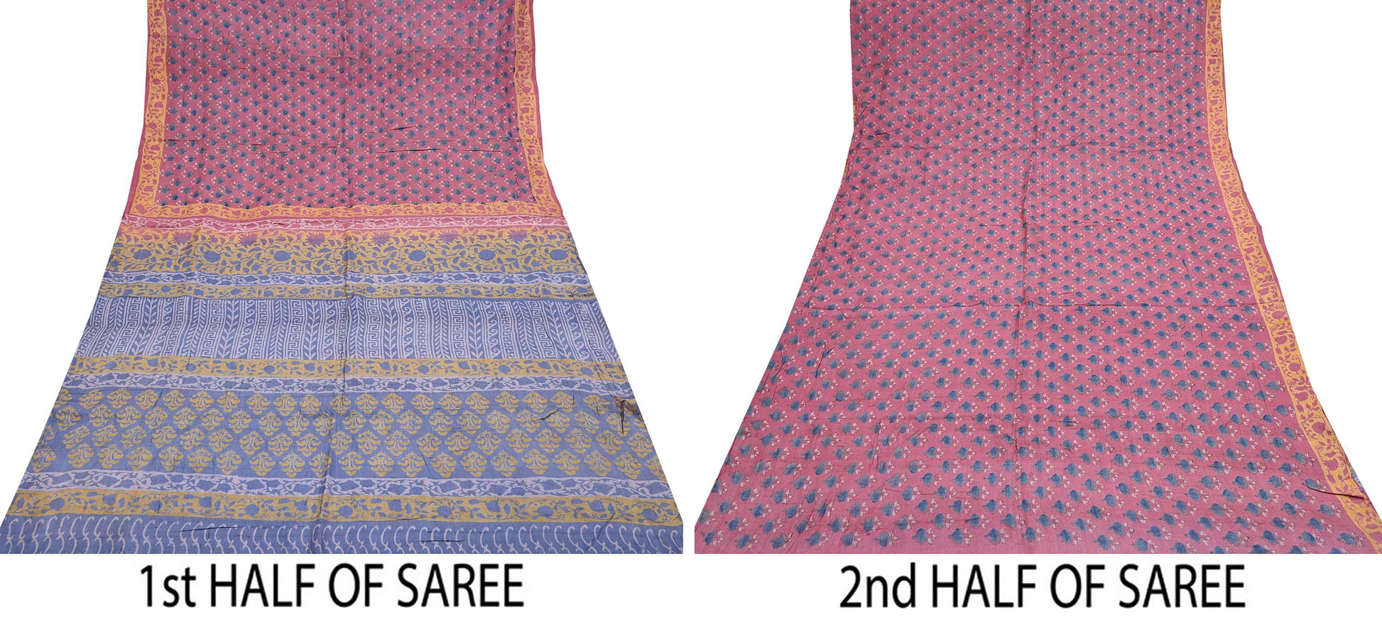 Indian Vintage Peach & Gray Saree Pure Khadi Silk Handloom Printed Sari Fabric 5yard Ethnic Wear Sari Floral