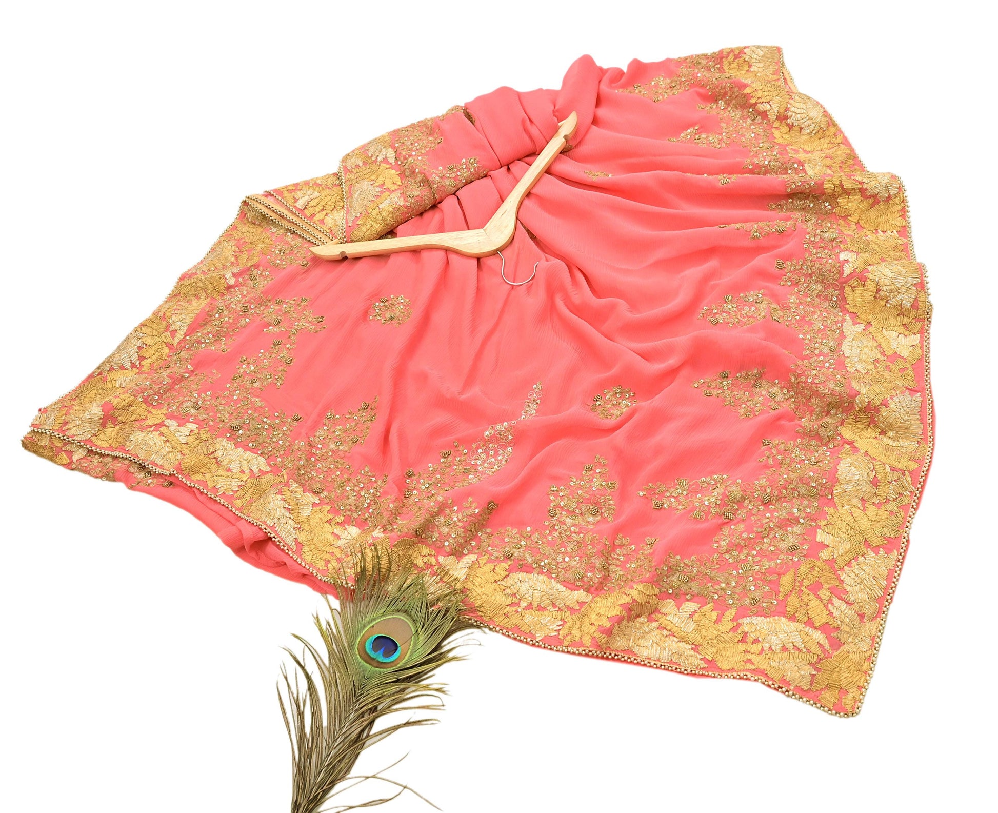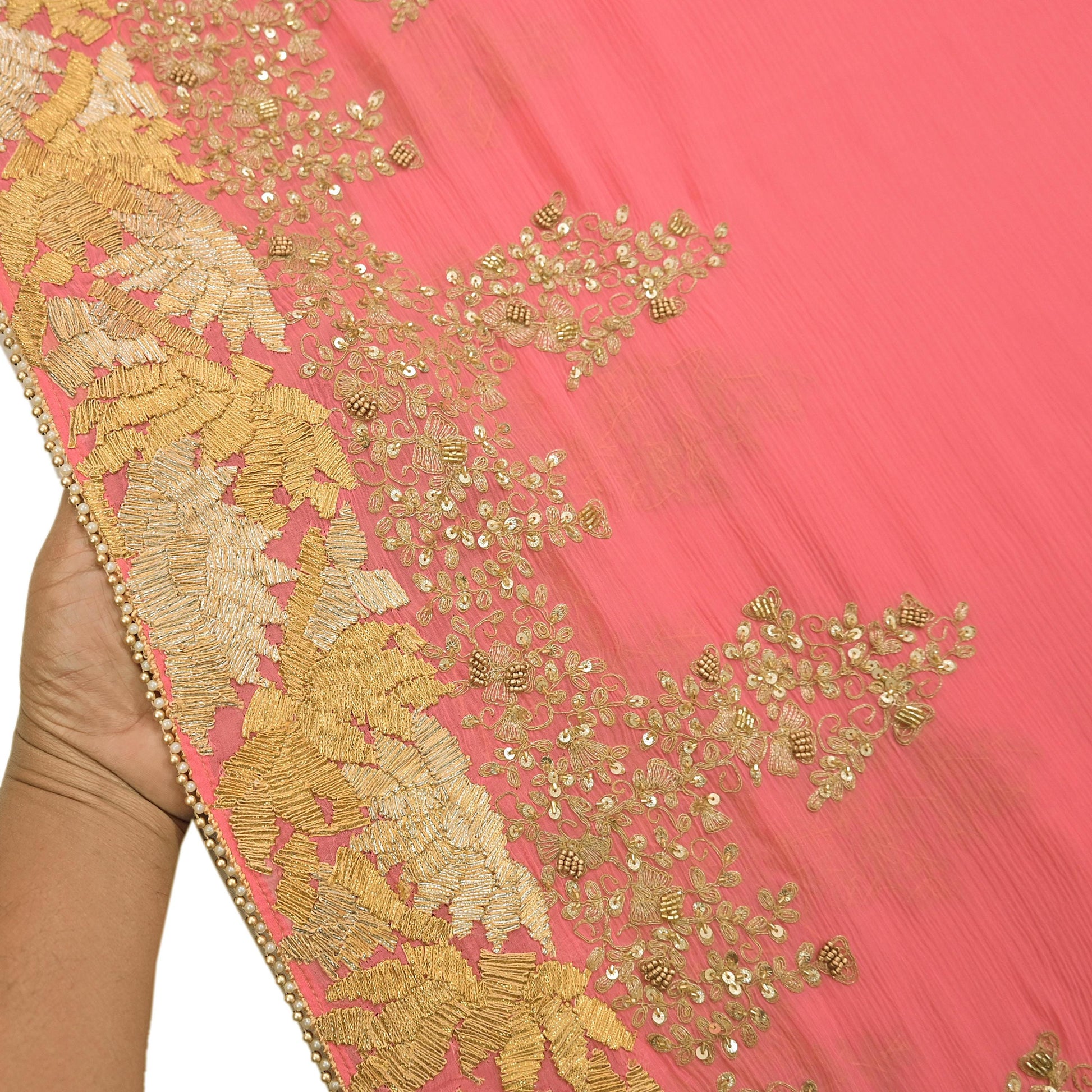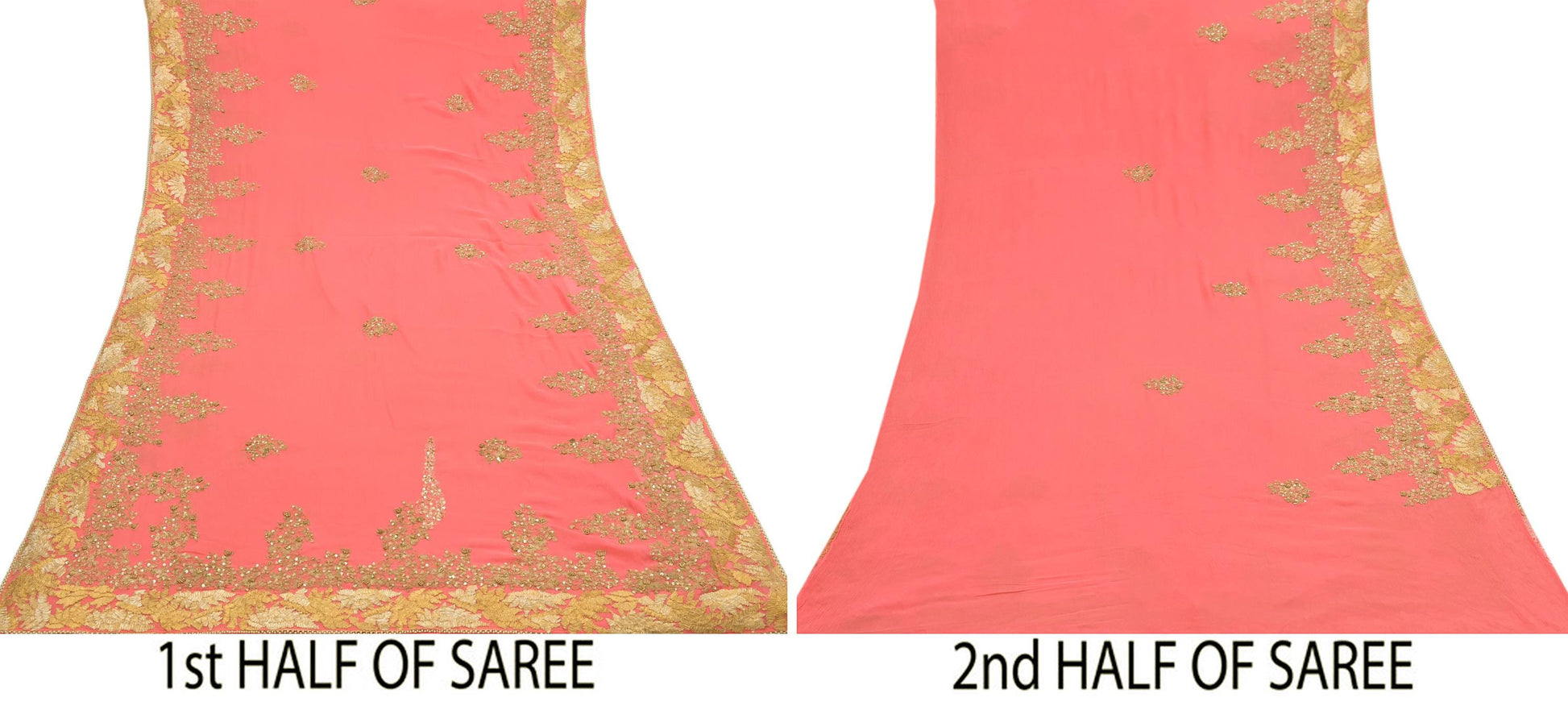 Indian Vintage Peach Saree Pure Chiffon Silk Pre-owned Hand Beaded Abu jani Designer Sari Fabric 5-Yards Soft Ethnic Bollywood Party sarees
