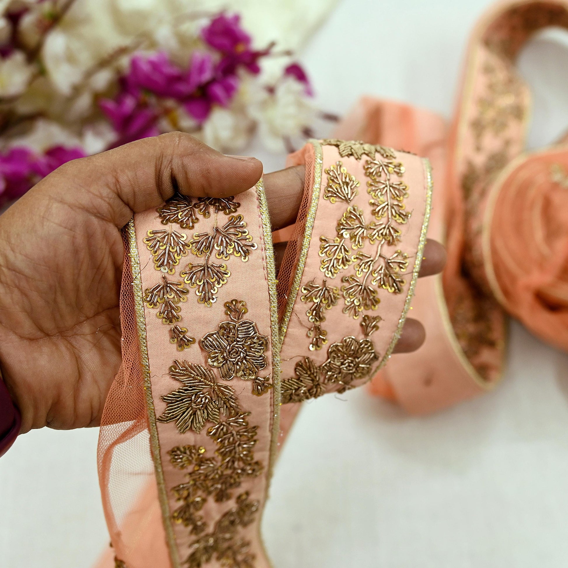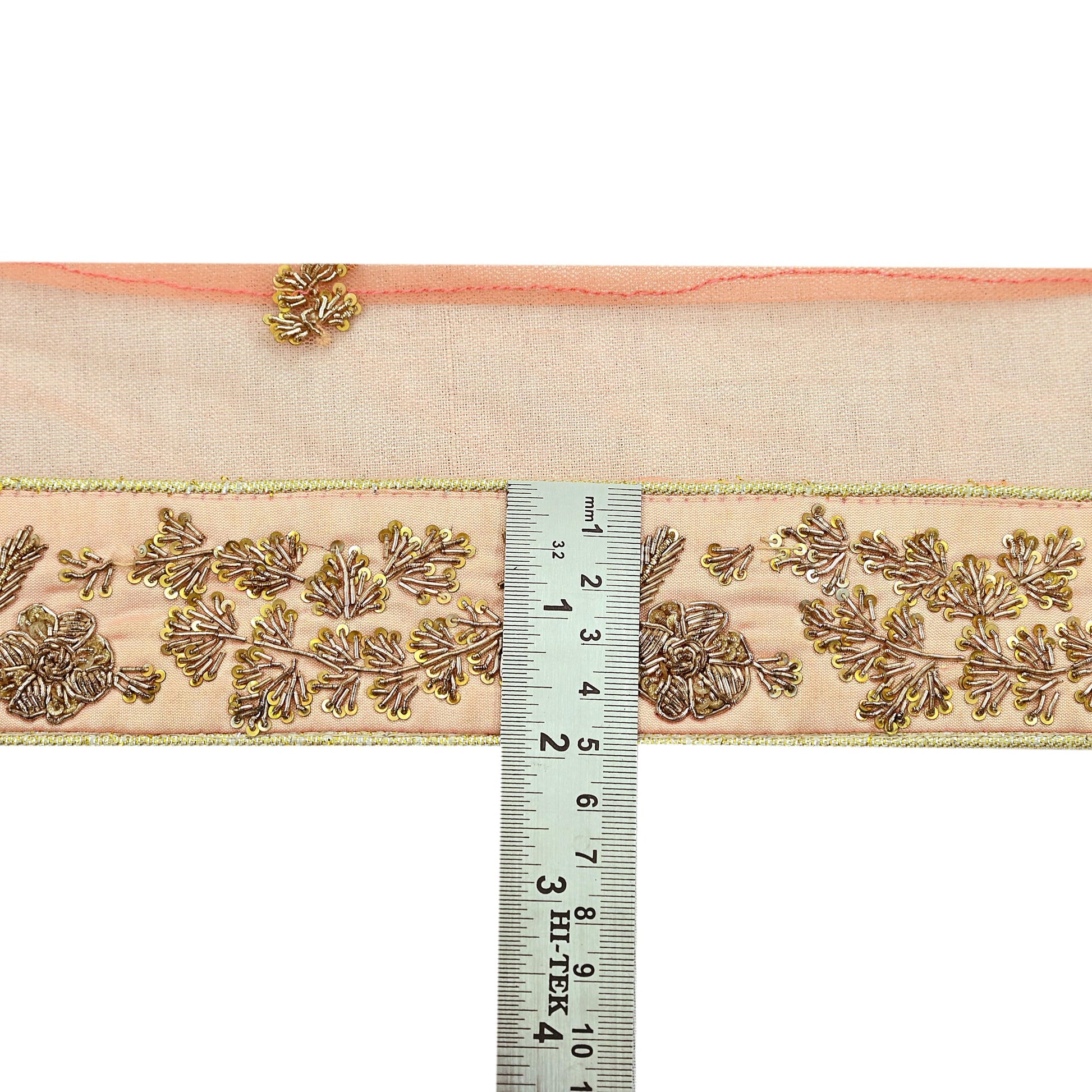 Indian Vintage Peach Sari Border Hand Embroidered 1yd Craft Trim Lace Sewing Net/Mess Ribbon Recycled Sari Border Zardozi/ Dabka Zari
