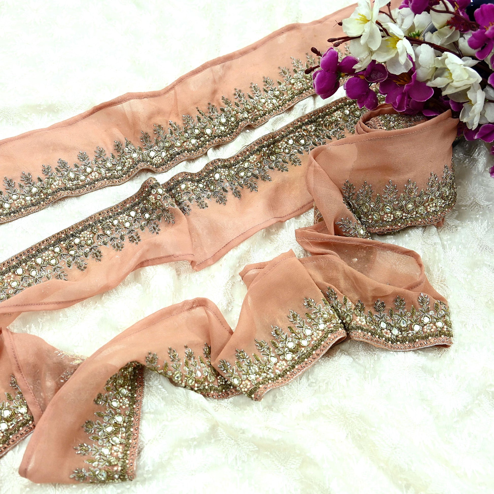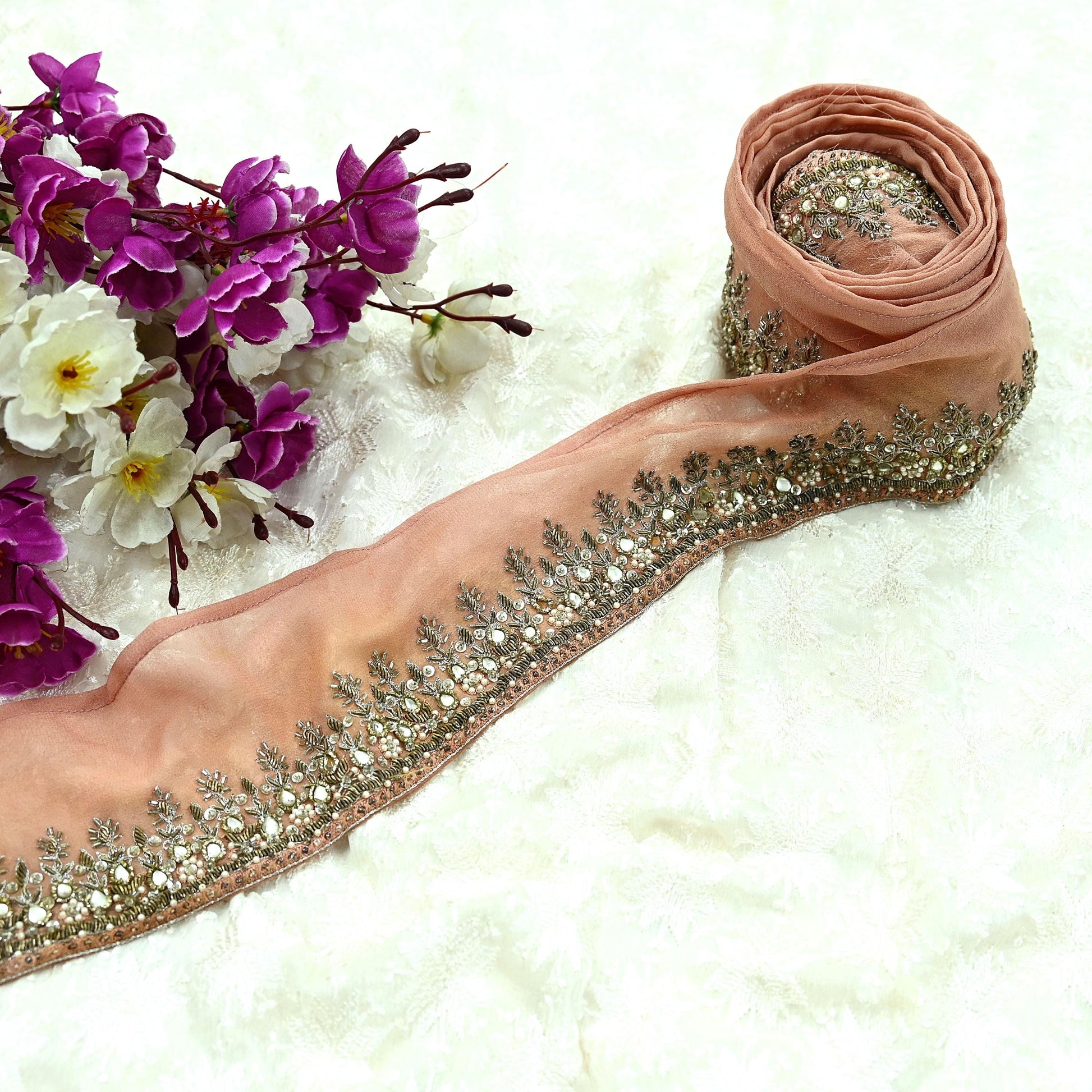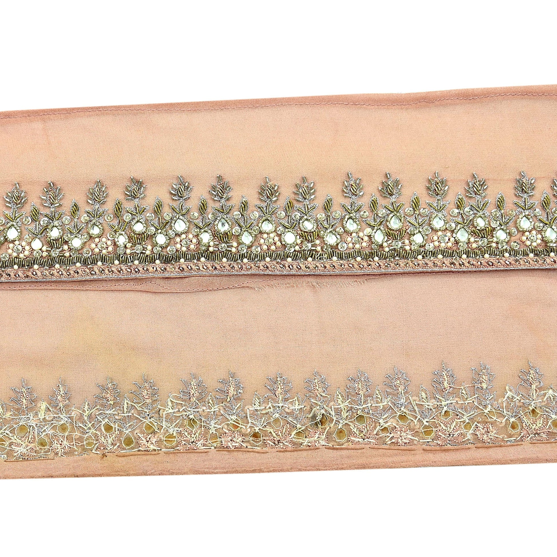 Indian Vintage Peach Sari Border Hand Embroidered Craft Trim Lace Sewing Pure Georgette Silk Ribbon Recycled Zardozi