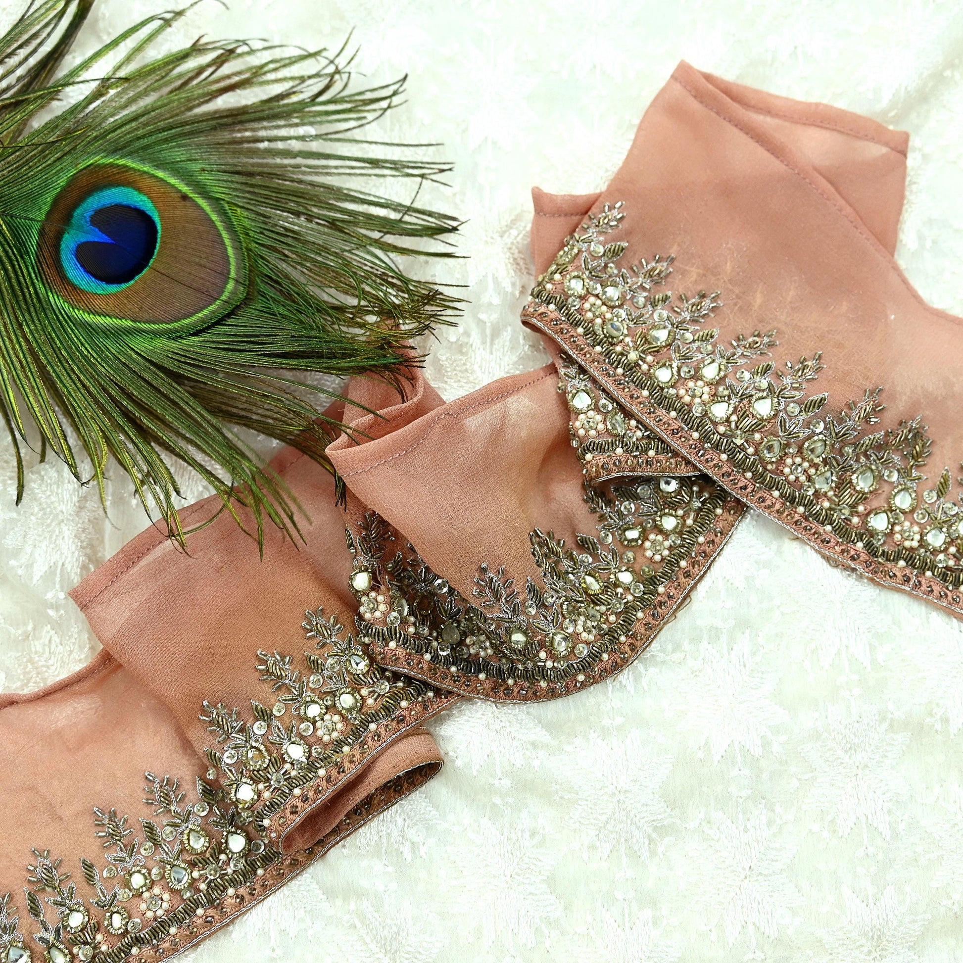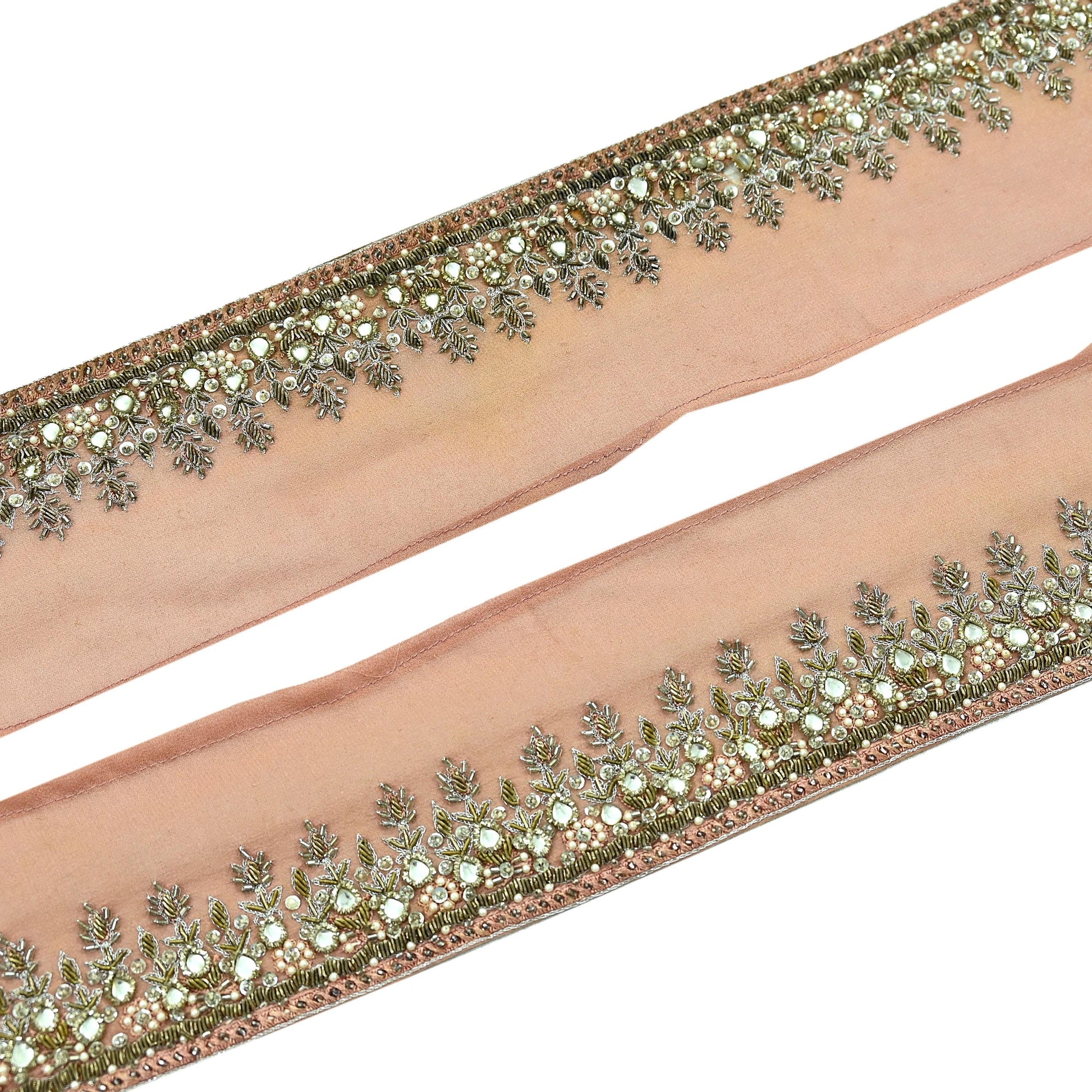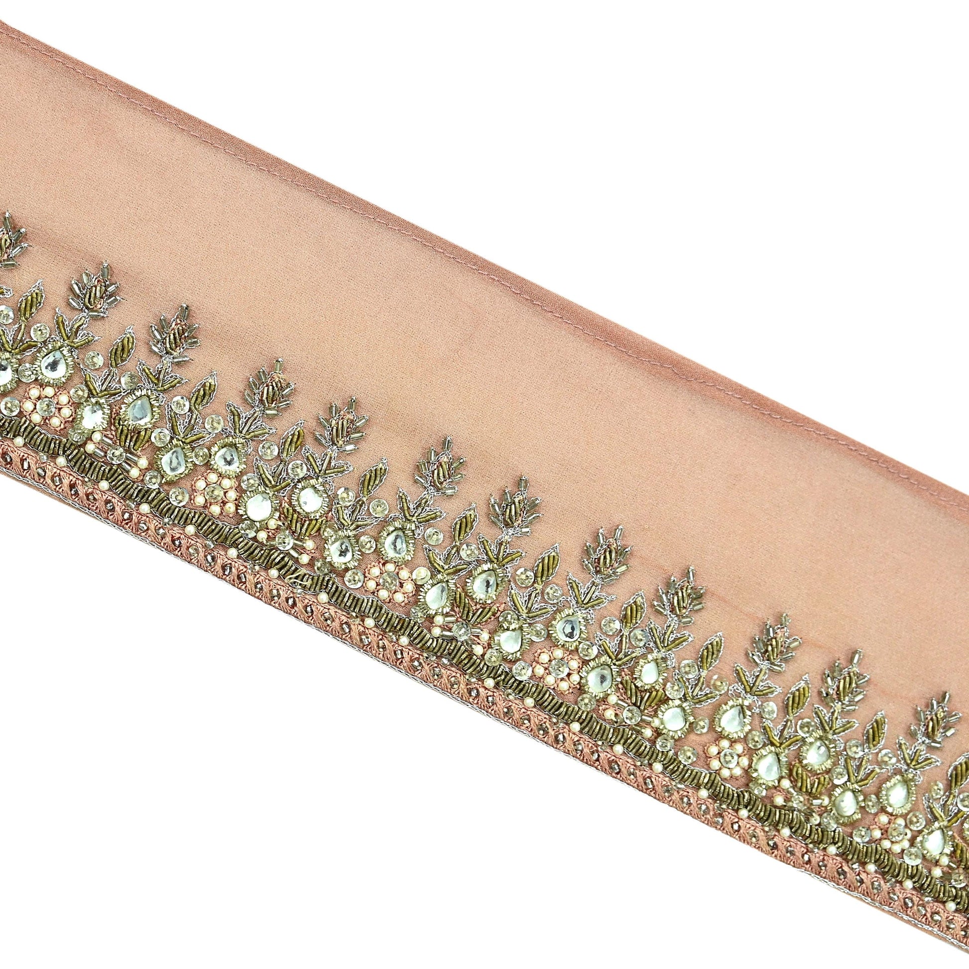 Indian Vintage Peach Sari Border Hand Embroidered Craft Trim Lace Sewing Pure Georgette Silk Ribbon Recycled Zardozi