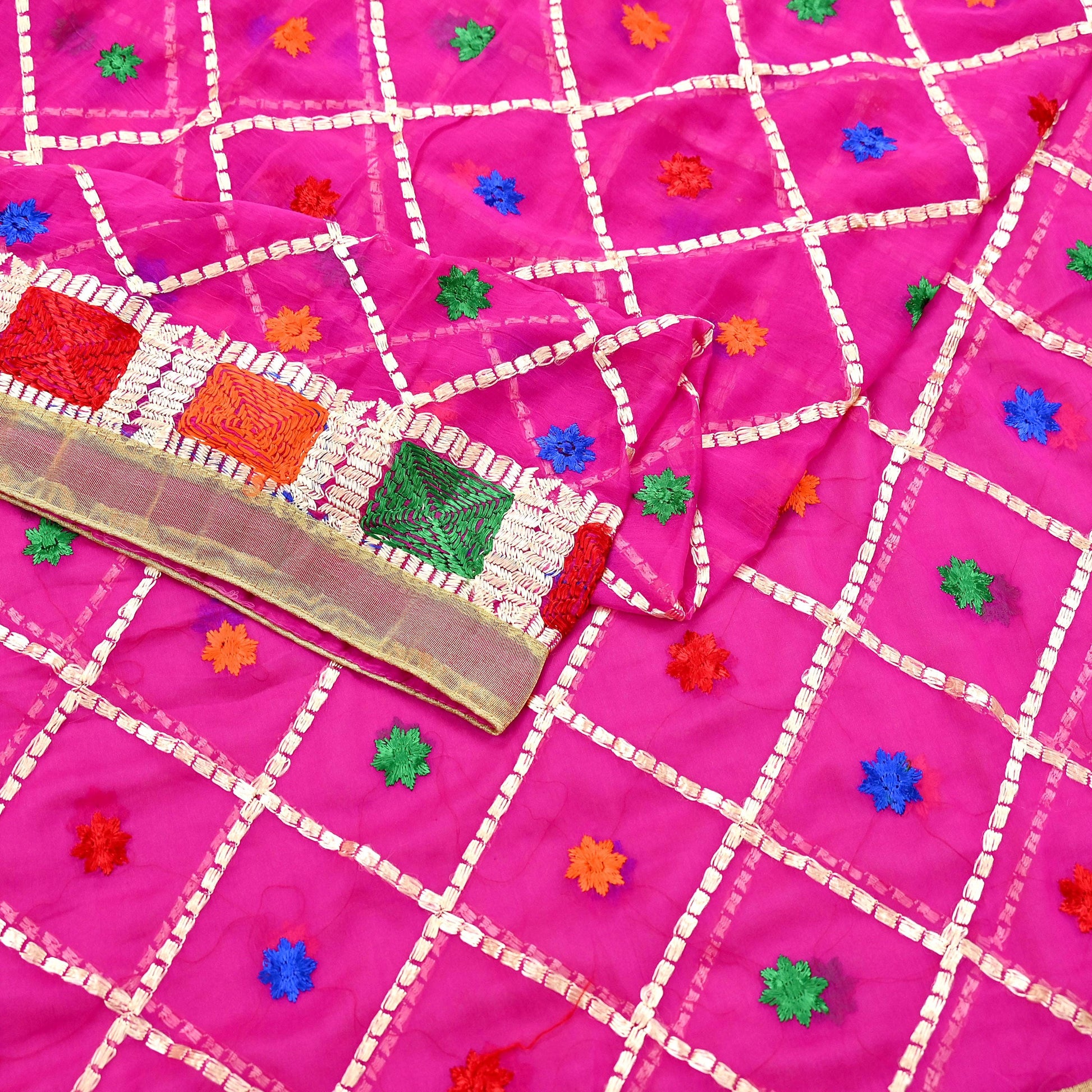 Indian Vintage Pink Dupatta Long Stole Pure Chiffon Silk Hand Embroidered Bagh Phulkari Stole Scarves Golden Lace