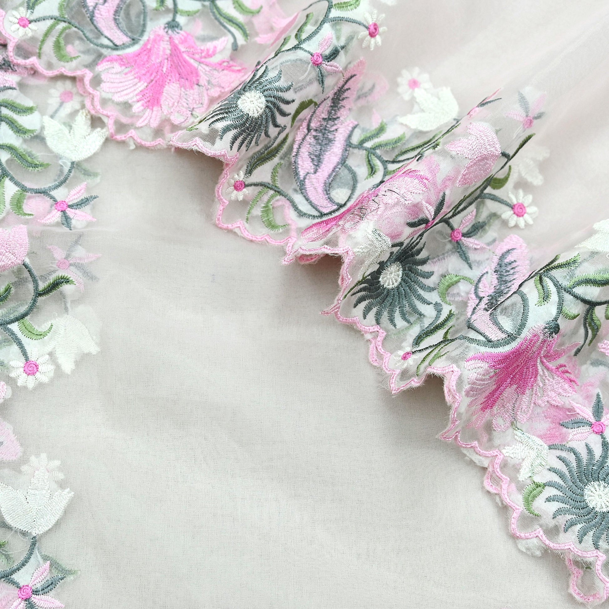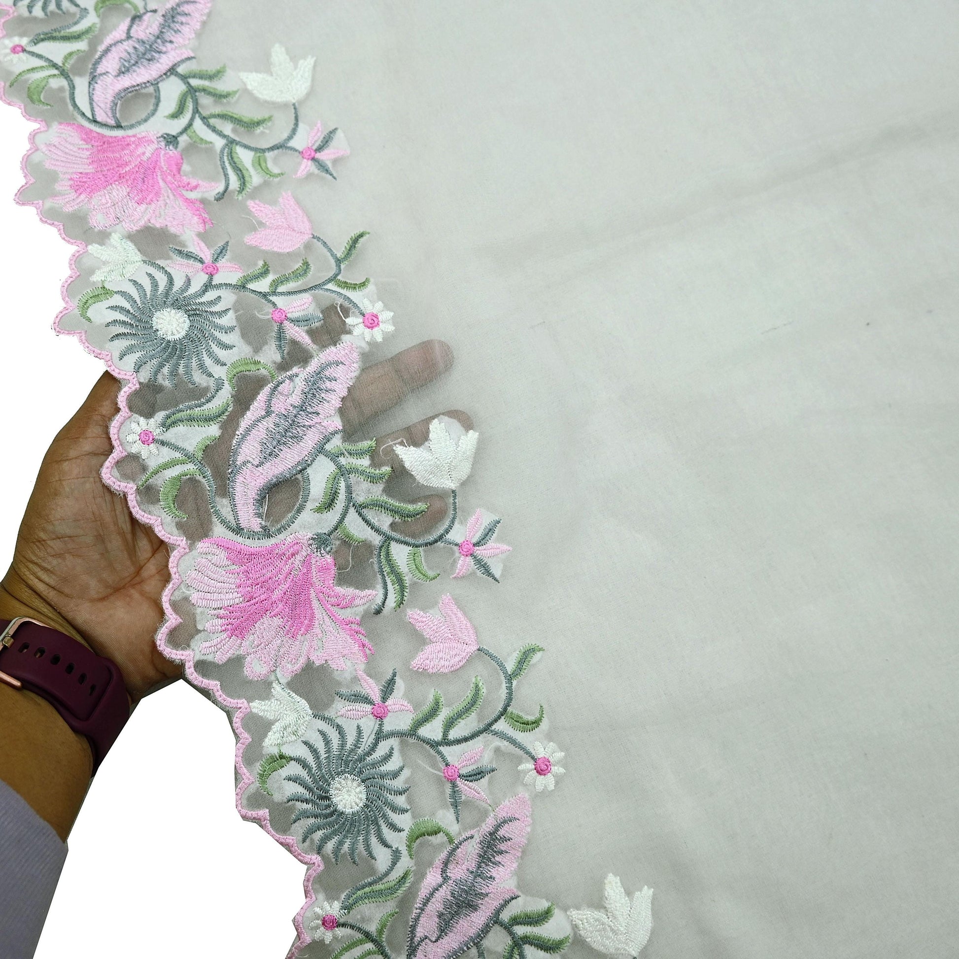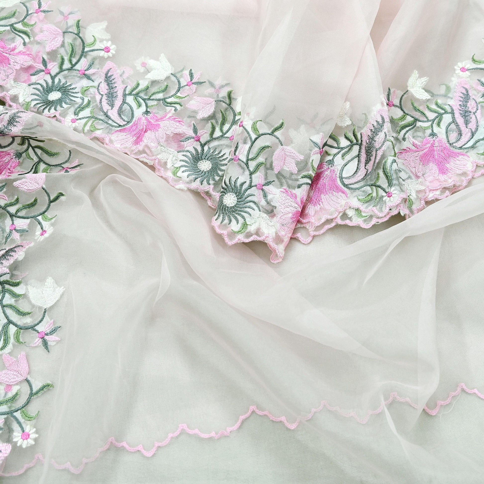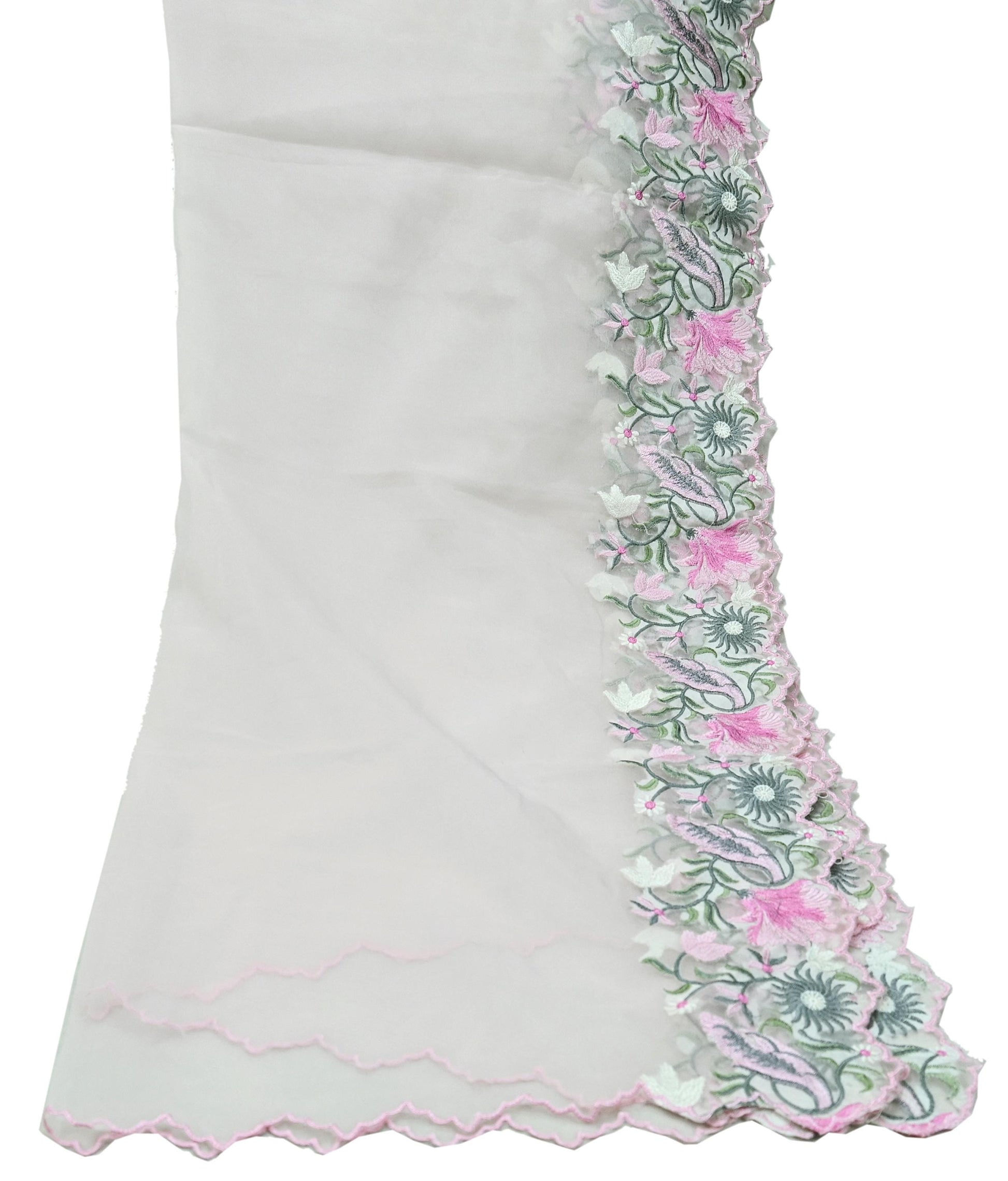 *Dupatta Has Floral Design. With Green, Gray, Pink & White Woven Thread Work.
