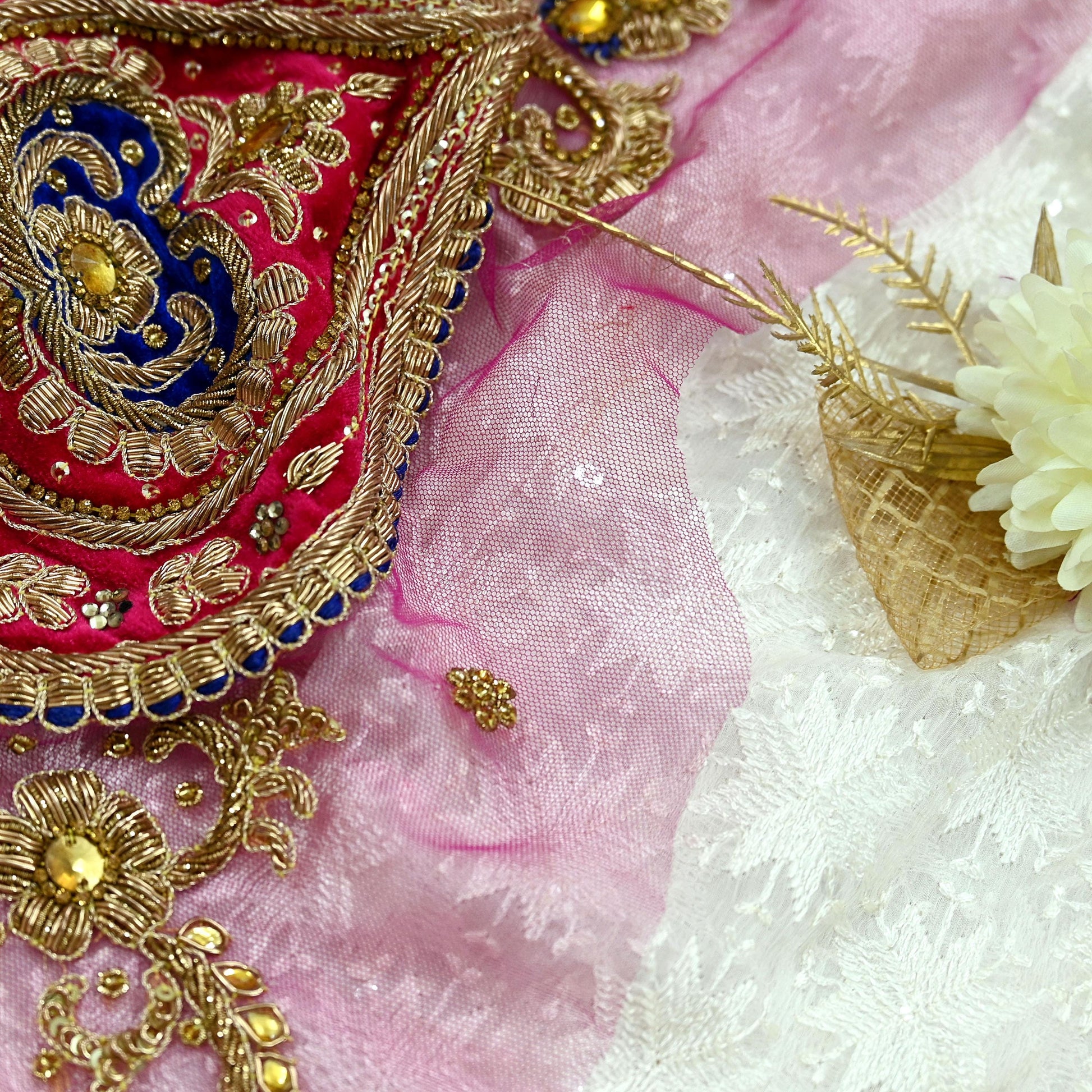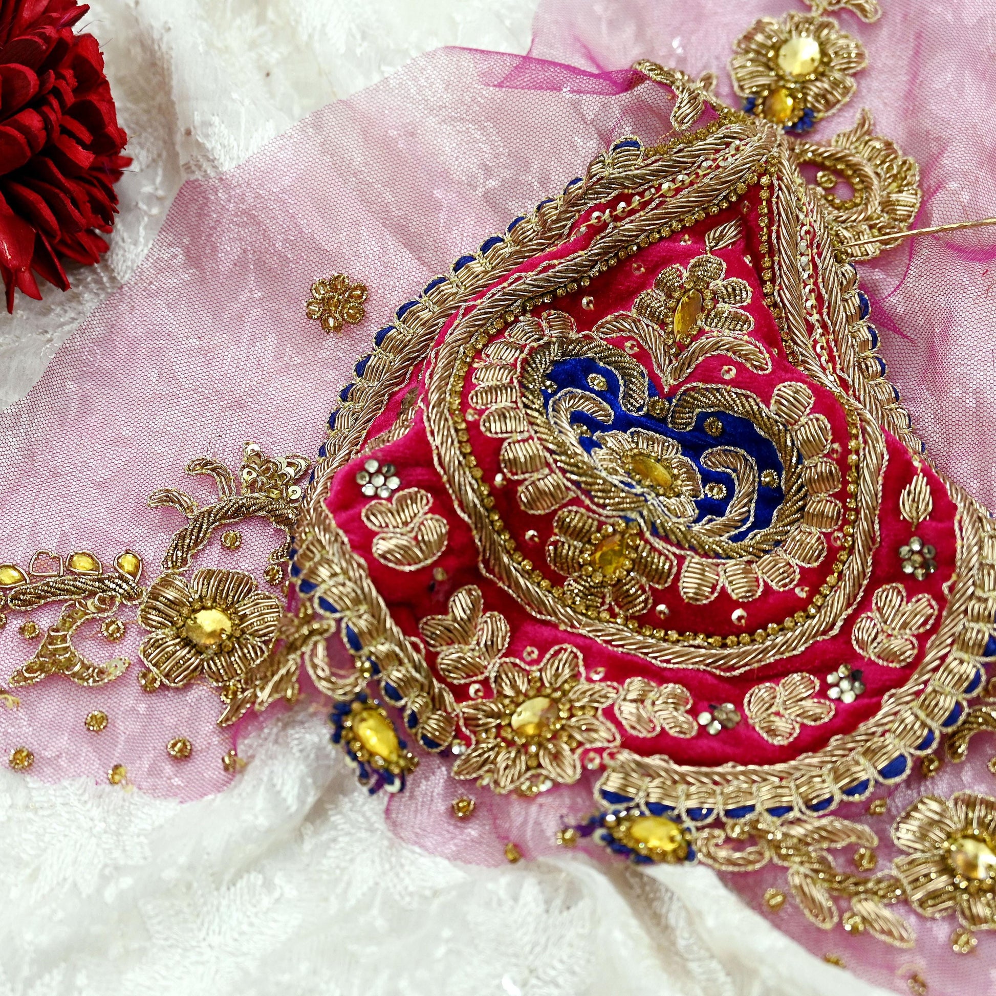 Richly embroidered with zardozi/dabka, zari, sequins, and Pink & Blue Velvet Patch.