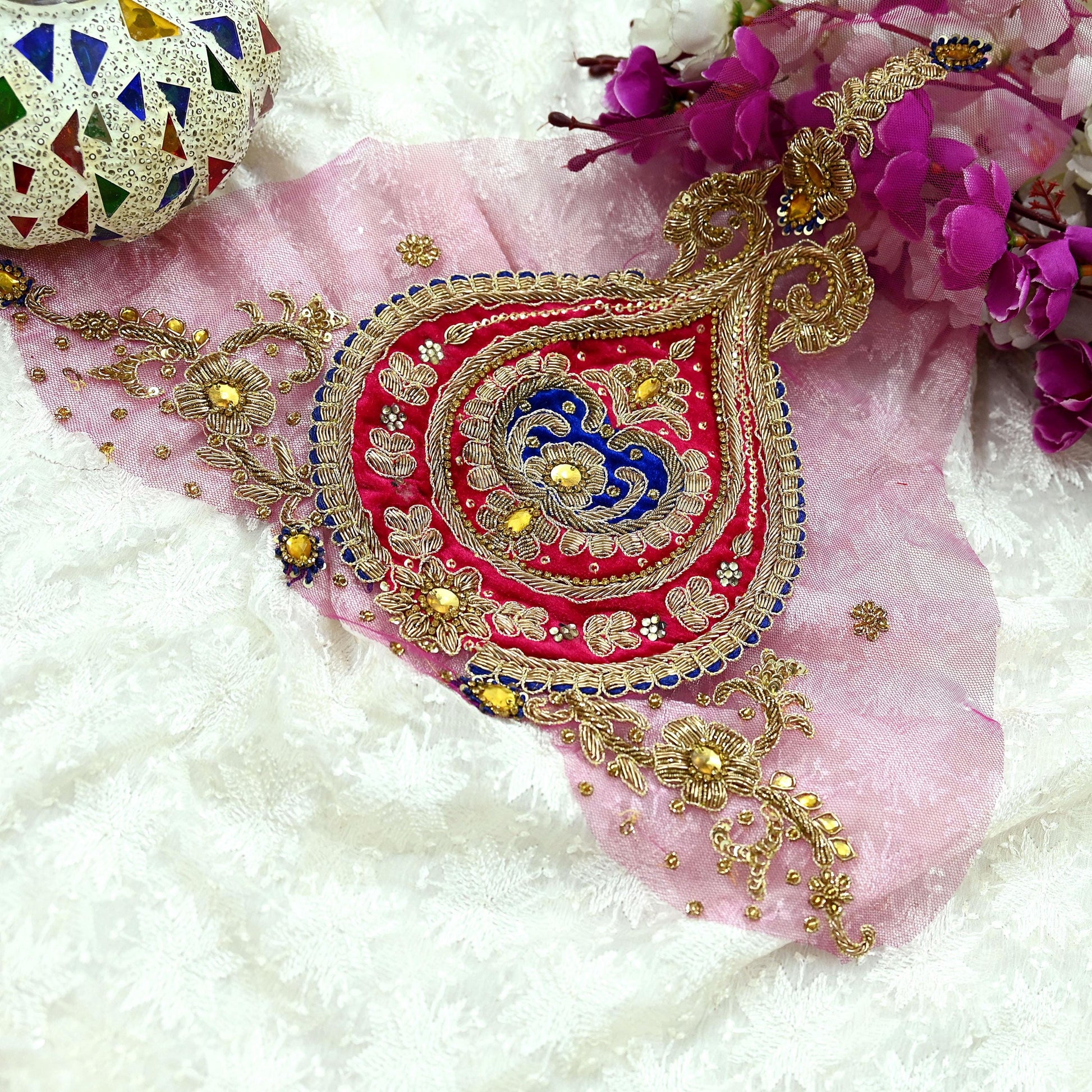 Enhance your craft with this stunning set of 1 hand-embroidered vintage appliques, cut from an elegant Net sari in soft Pink . These graceful pieces feature floral motifs embellished with golden Beaded, Blue Stone, White Pearl Like beads, zardozi/dabka, and zari, Blue, Thread, Golden stones, Golden Sequins embroidery, showcasing exquisite traditional Indian craftsmanship.