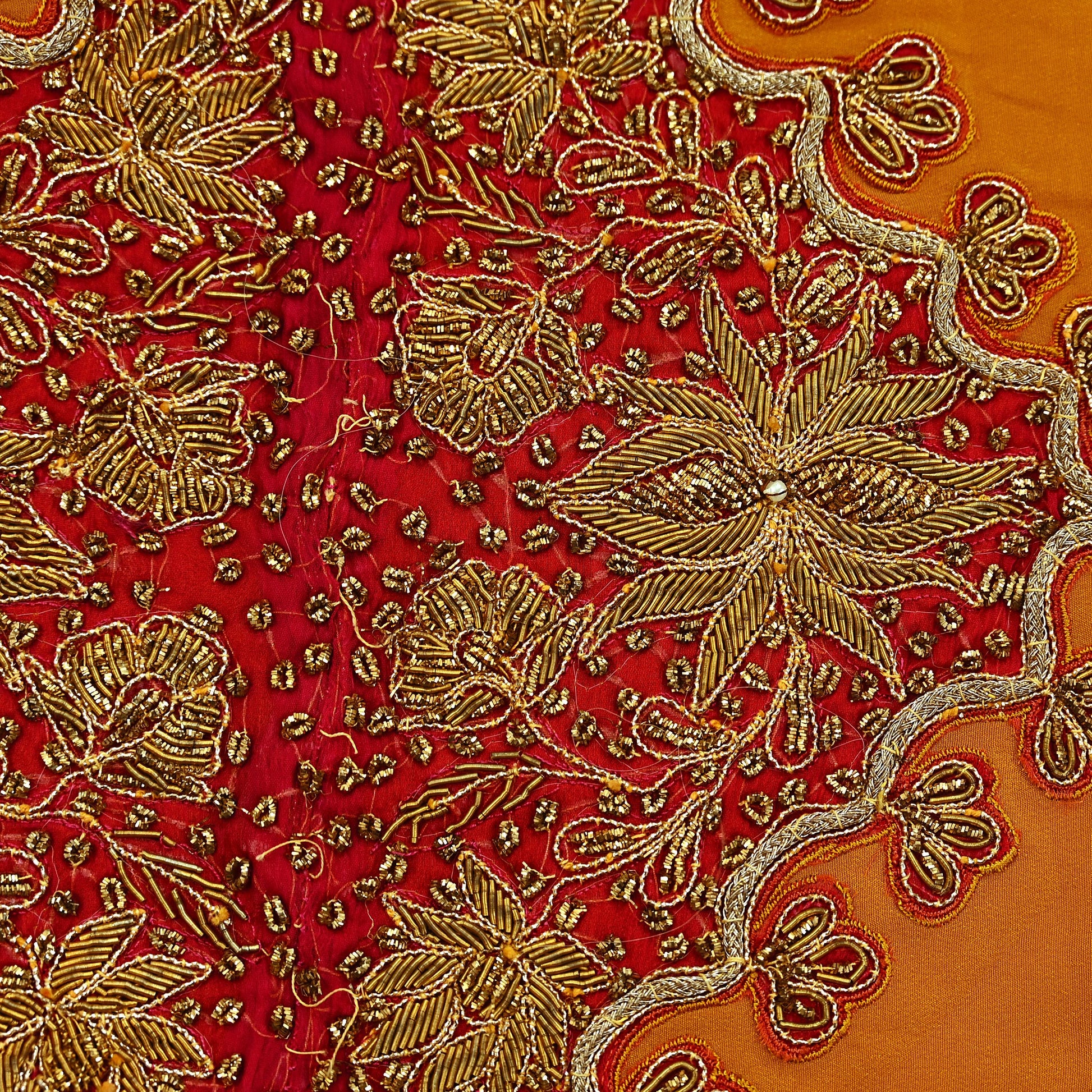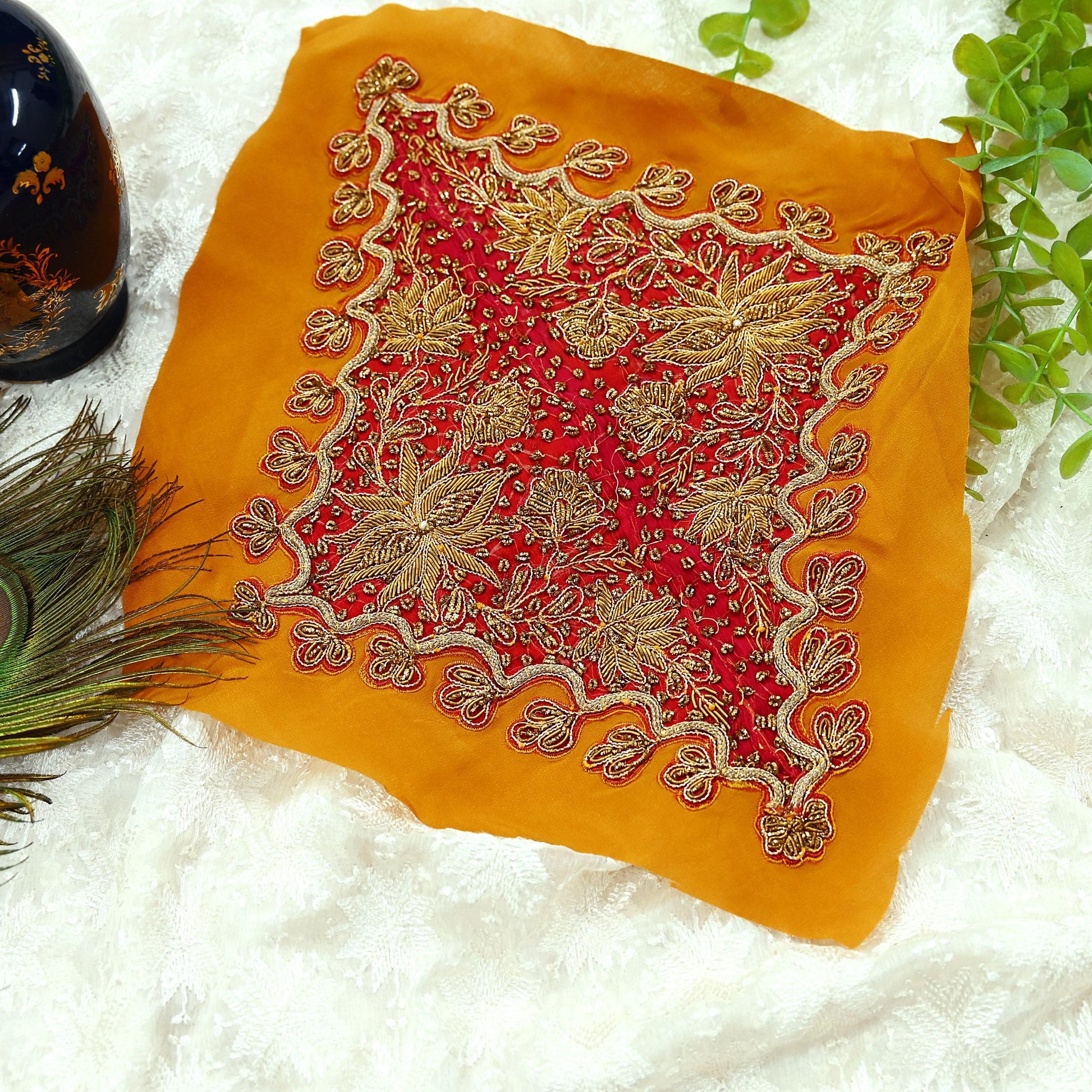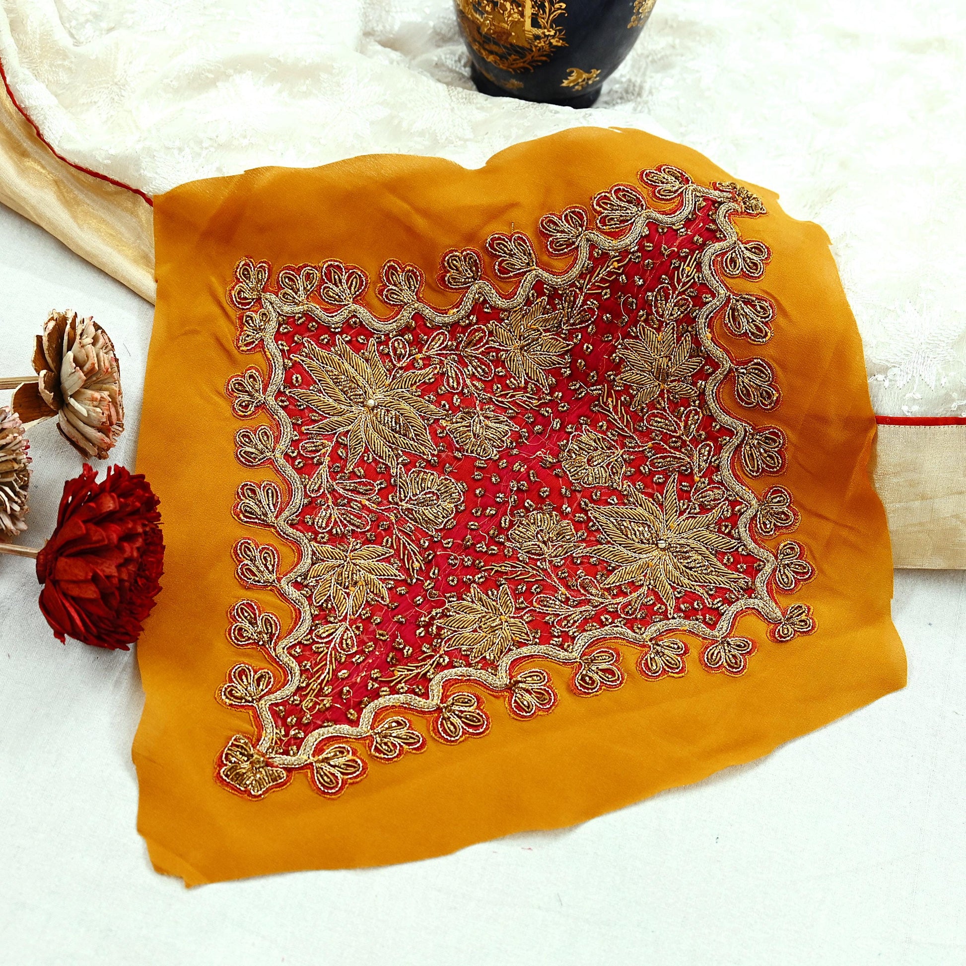 Enhance your craft with this stunning set of 1 hand-embroidered vintage appliques, cut from an elegant pure Crepe silk sari on Chiffon Fabric Patch in soft Saffron & Pink. These graceful pieces feature floral motifs embellished with golden zardozi/dabka, and zari, embroidery, showcasing exquisite traditional Indian craftsmanship.