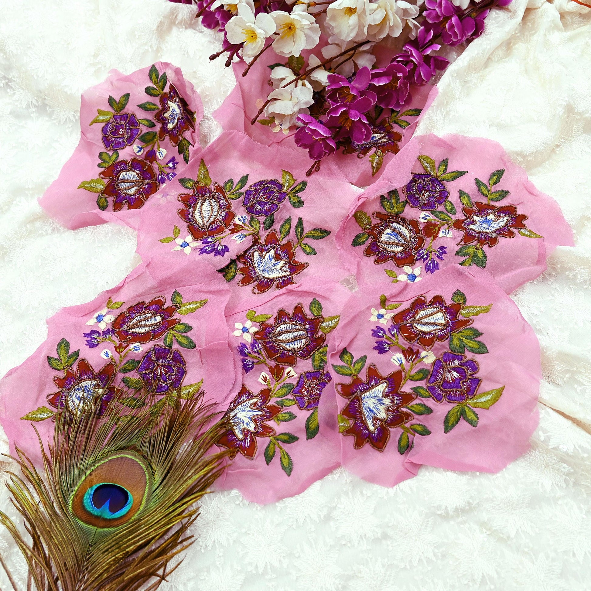*Graceful Pure Georgette Silk Hand Embroidered Sari Applique/ Patches In Pink Color Highlighting Thread Work. 7 pieces Combo.