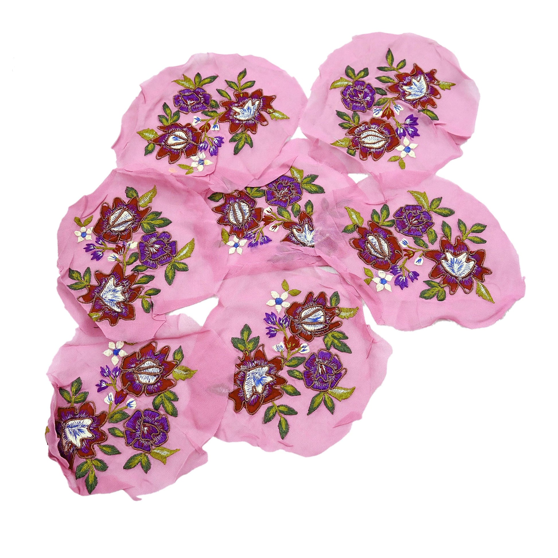Indian Vintage Pink pure Georgette Silk Rare Appliques - set of 7 Embroidered VERY OLD ANTIQUE Snippets Remnants Craft Journals