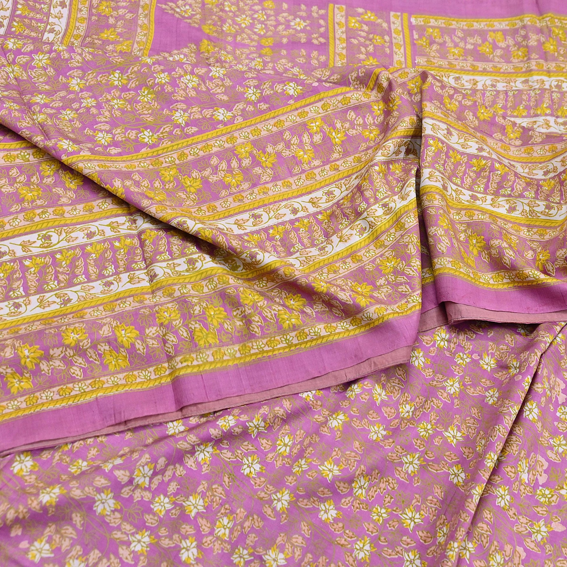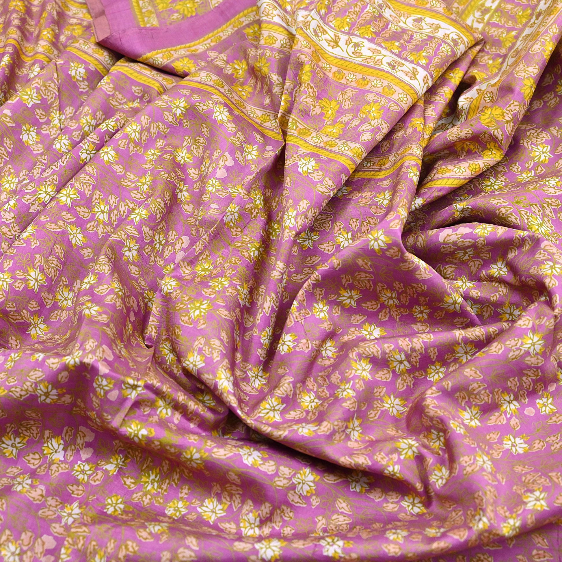 This attractive vintage saree, crafted from 100% pure silk, features a graceful Pink base beautifully contrasted by Multi floral printed motifs. Lightweight and soft with an elegant drape, it’s ideal for both traditional wear and creative projects.