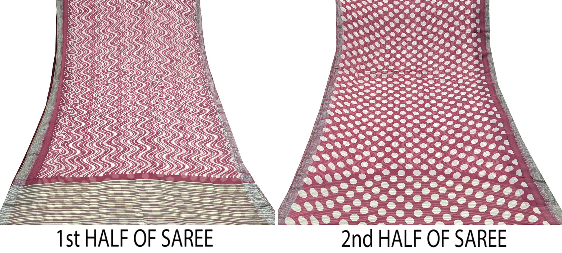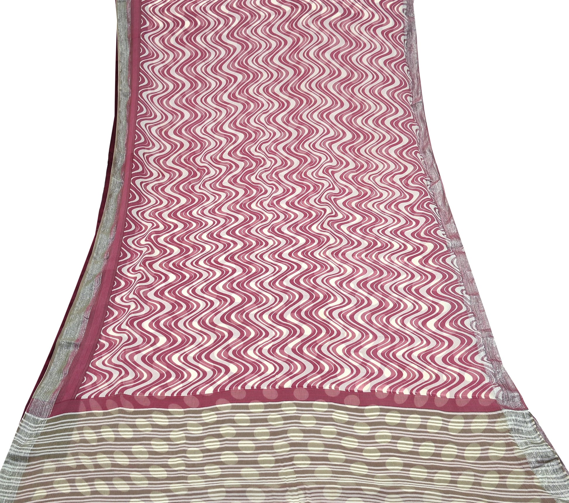 This attractive vintage saree in a soft Pink & Ivory color is crafted from luxurious Pure Chiffon Silk and adorned with elegant printed Stripes designs on the pallu, Silver Zari Woven border, and center. Its sheer and flowing texture gives it an ethereal feel, making it ideal not only for wearing but also for various creative and upcycling projects.