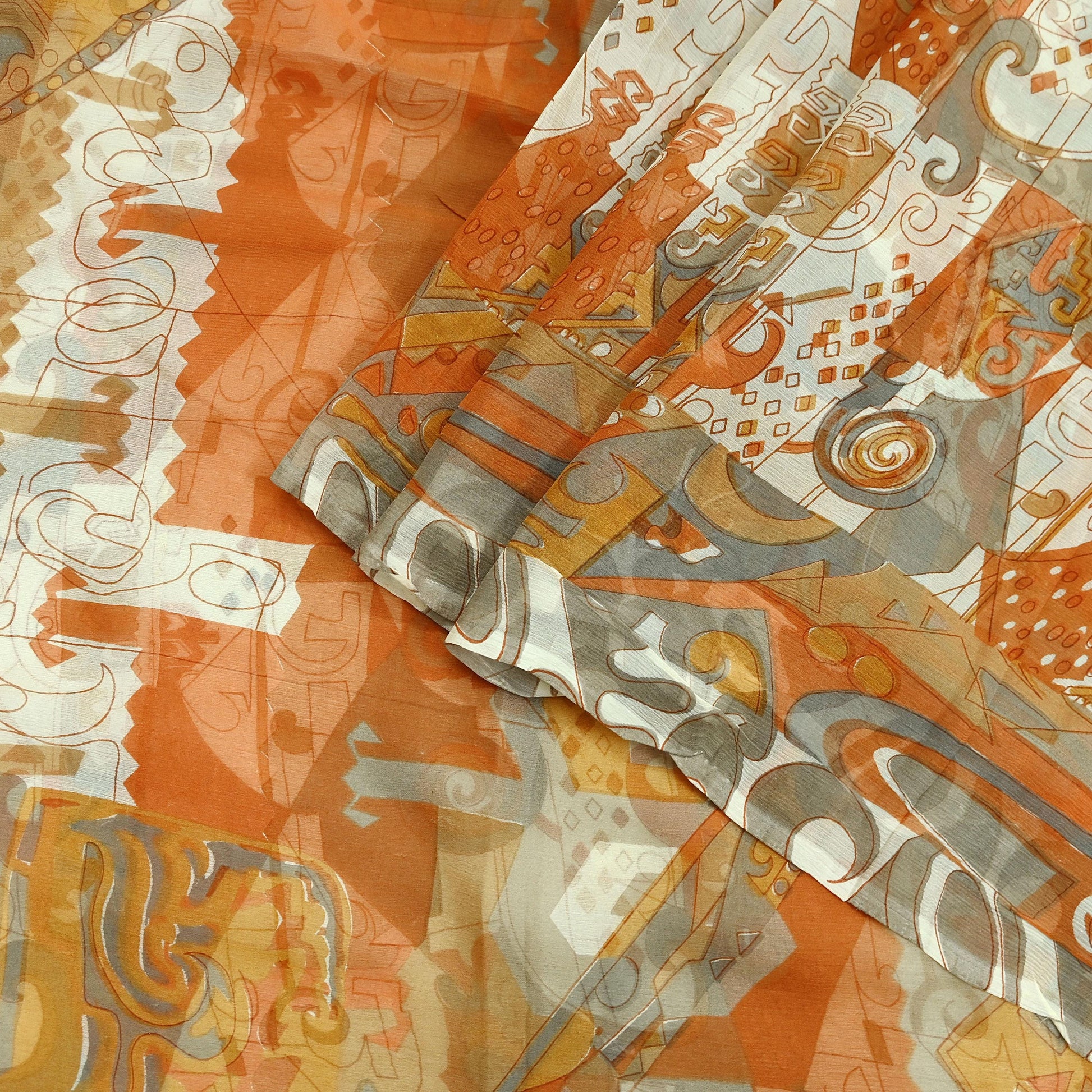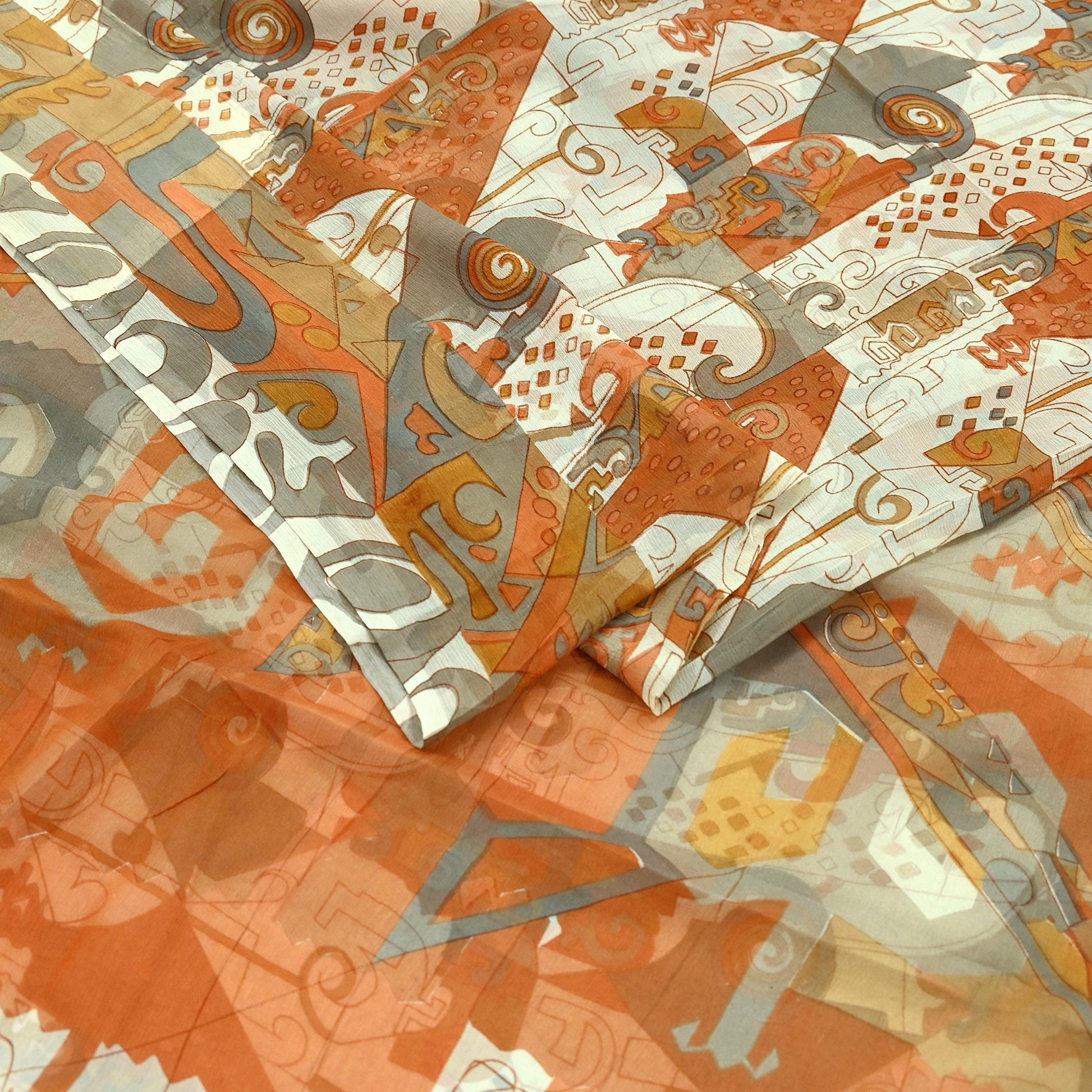 This attractive vintage saree in a soft Ivory & Orange color is crafted from luxurious Pure Chiffon Silk and adorned with elegant printed Abstract designs on the pallu, border, and center. Its sheer and flowing texture gives it an ethereal feel, making it ideal not only for wearing but also for various creative and upcycling projects.