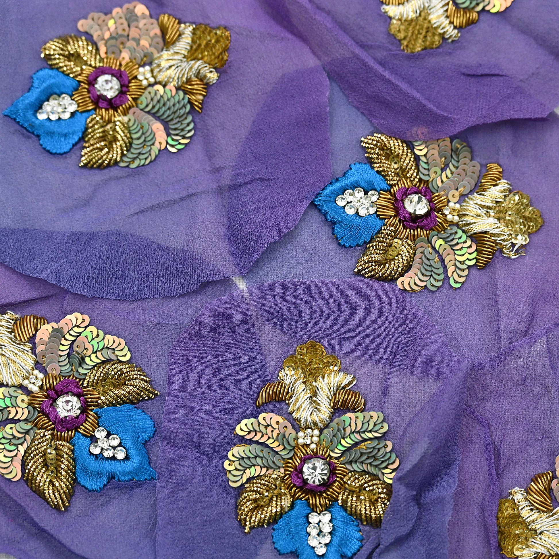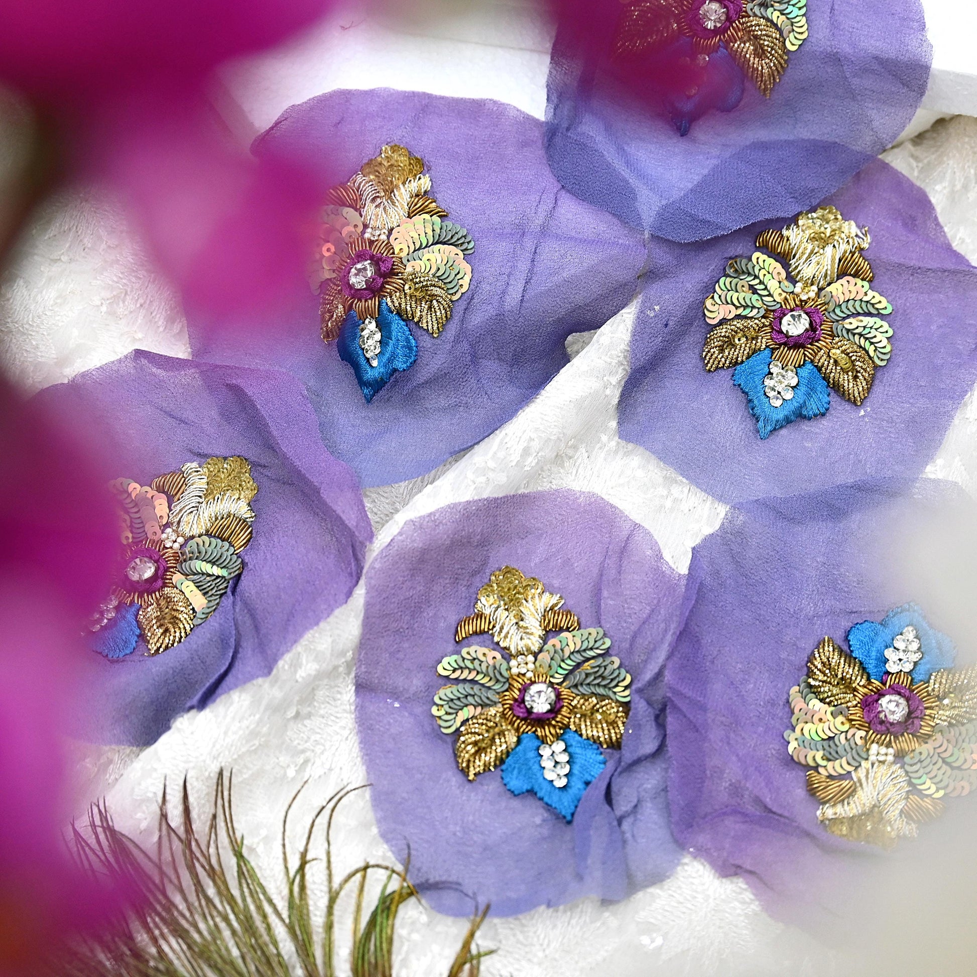 Enhance your craft with this stunning set of 6 hand-embroidered vintage appliques, cut from an elegant pure georgette silk sari in soft Purple & Blue . These graceful pieces feature floral motifs embellished with Golden & Purple Sequins, Golden Stones, golden gota patti, Golden zardozi/dabka, and zari, purple & Blue Thread embroidery, showcasing exquisite traditional Indian craftsmanship.