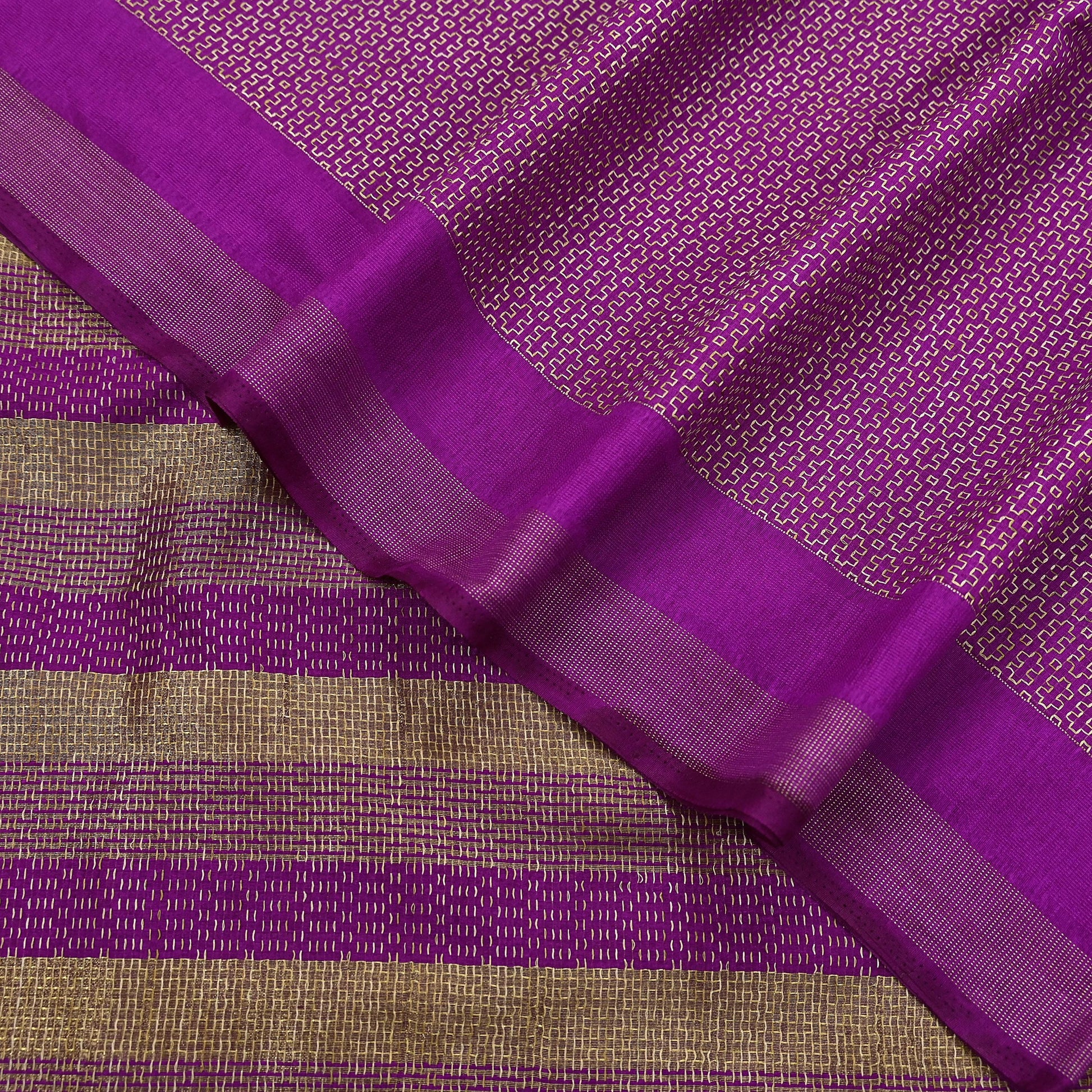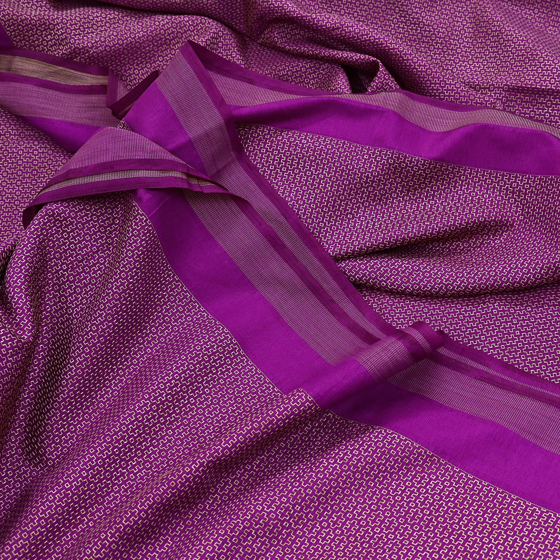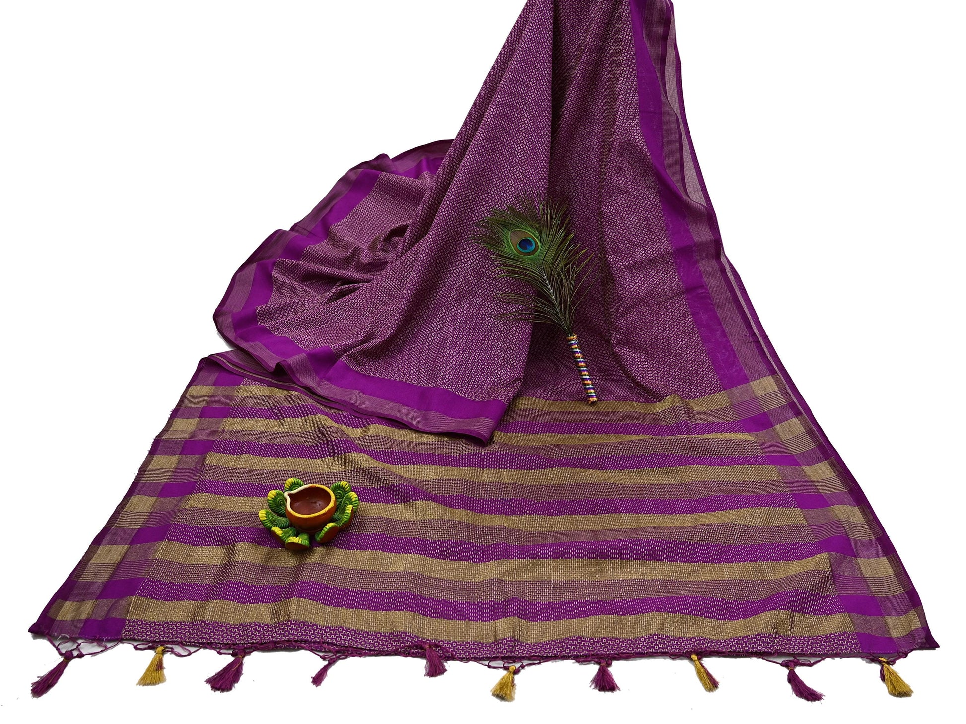 This 6-yard vintage sari is crafted from Chanderi with a lustrous finish and elegant woven golden Zari patterns throughout. The deep royal purple base is complemented by golden Zari Border & Fringes work On pallu, forming delicate geometric motifs and traditional Indian-style stripes on the pallu.