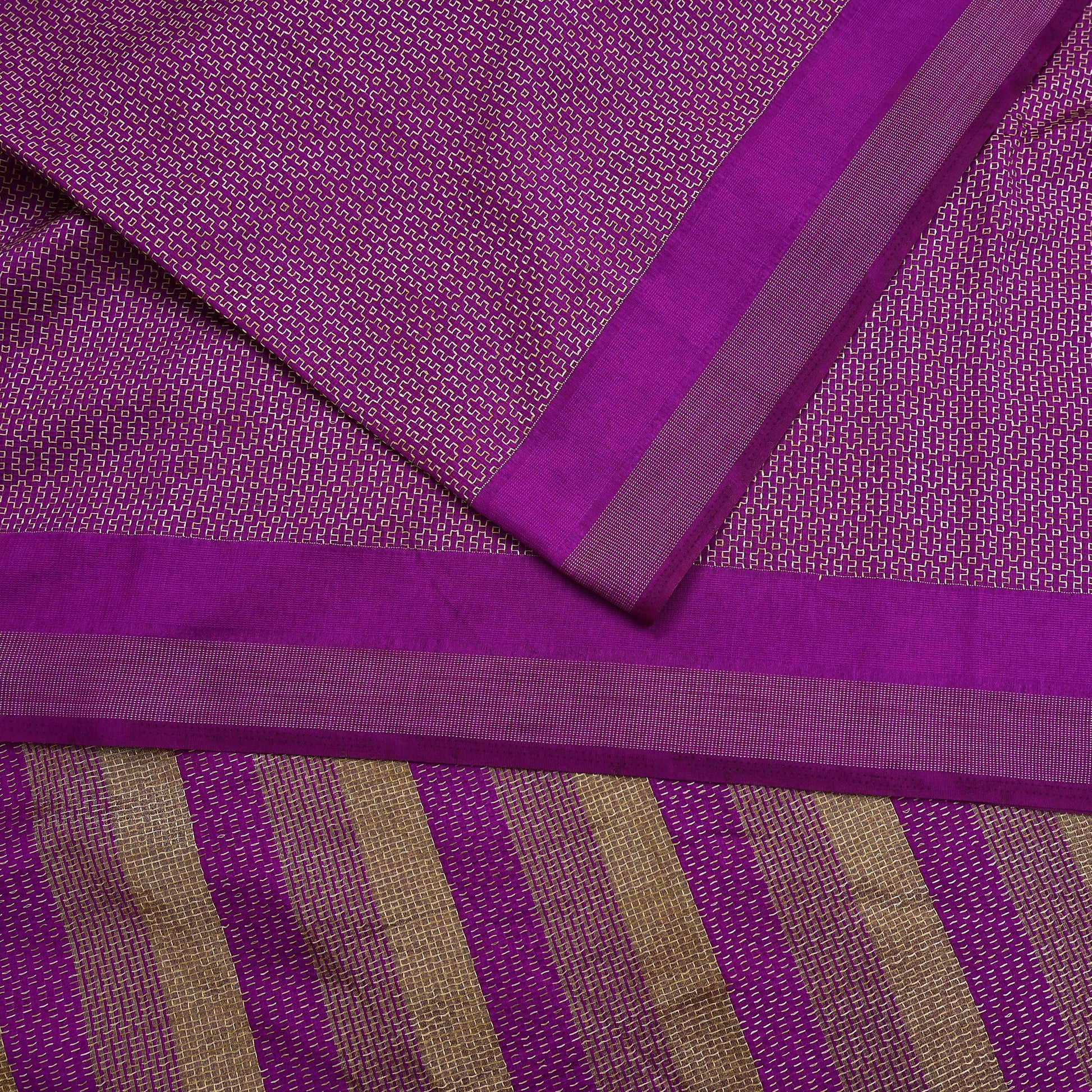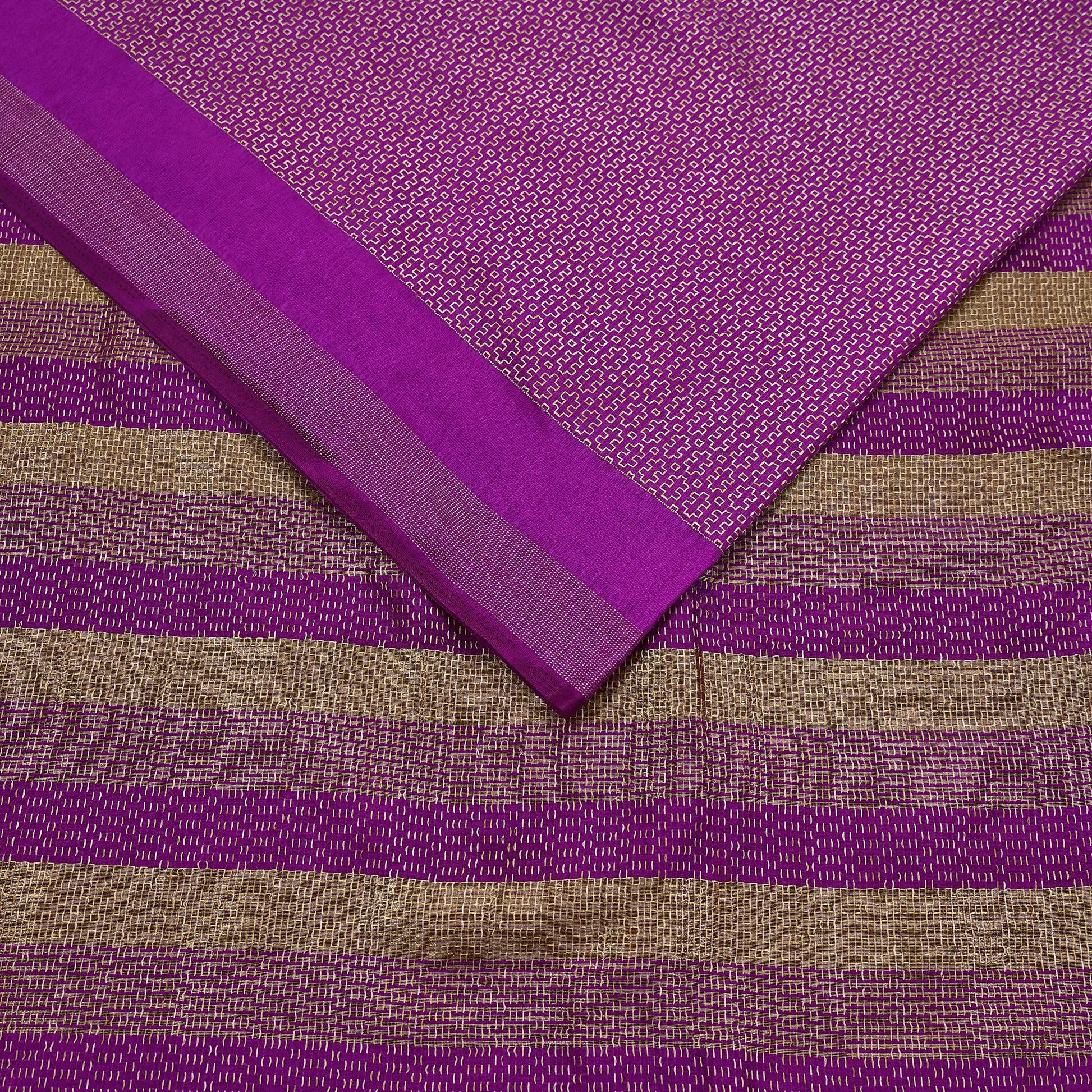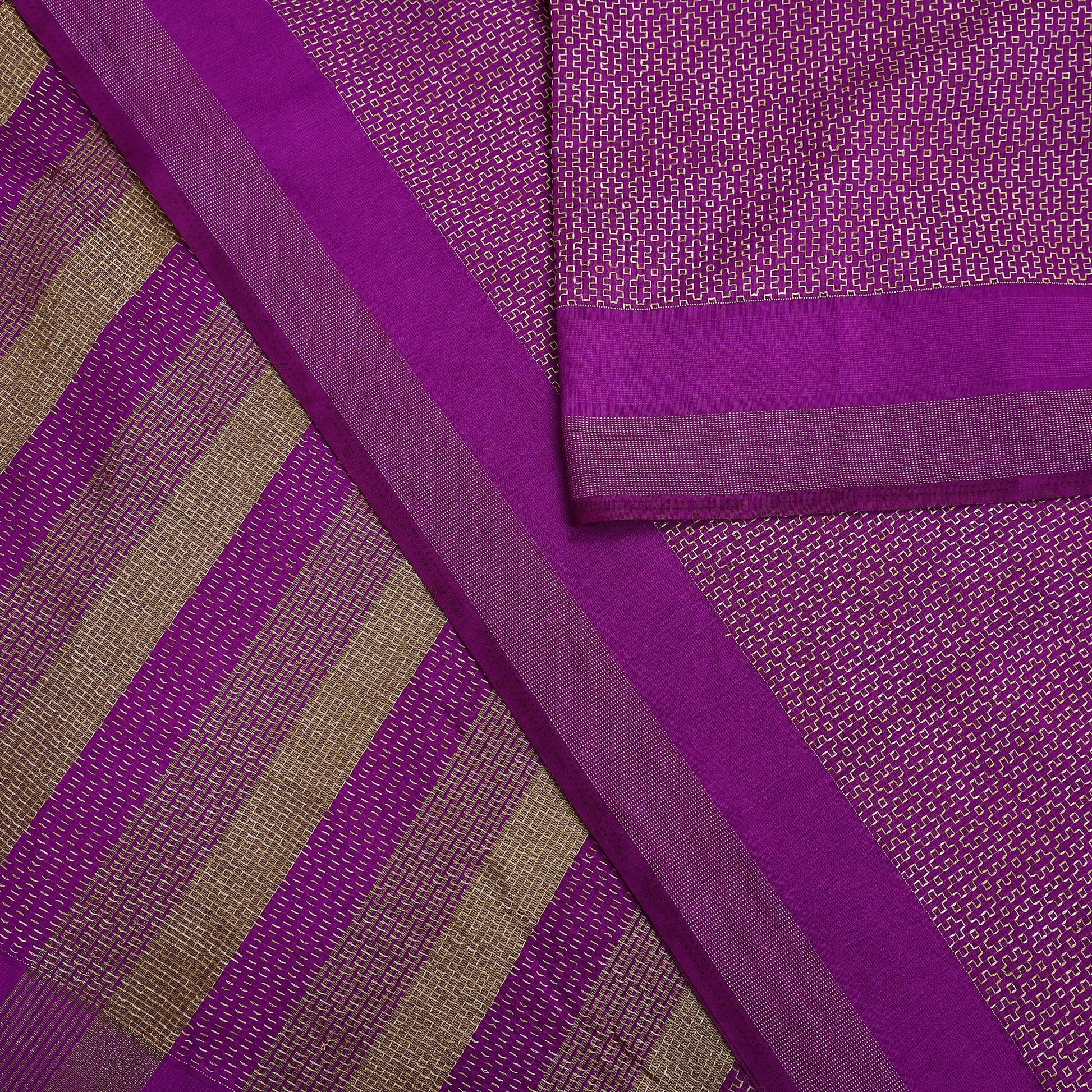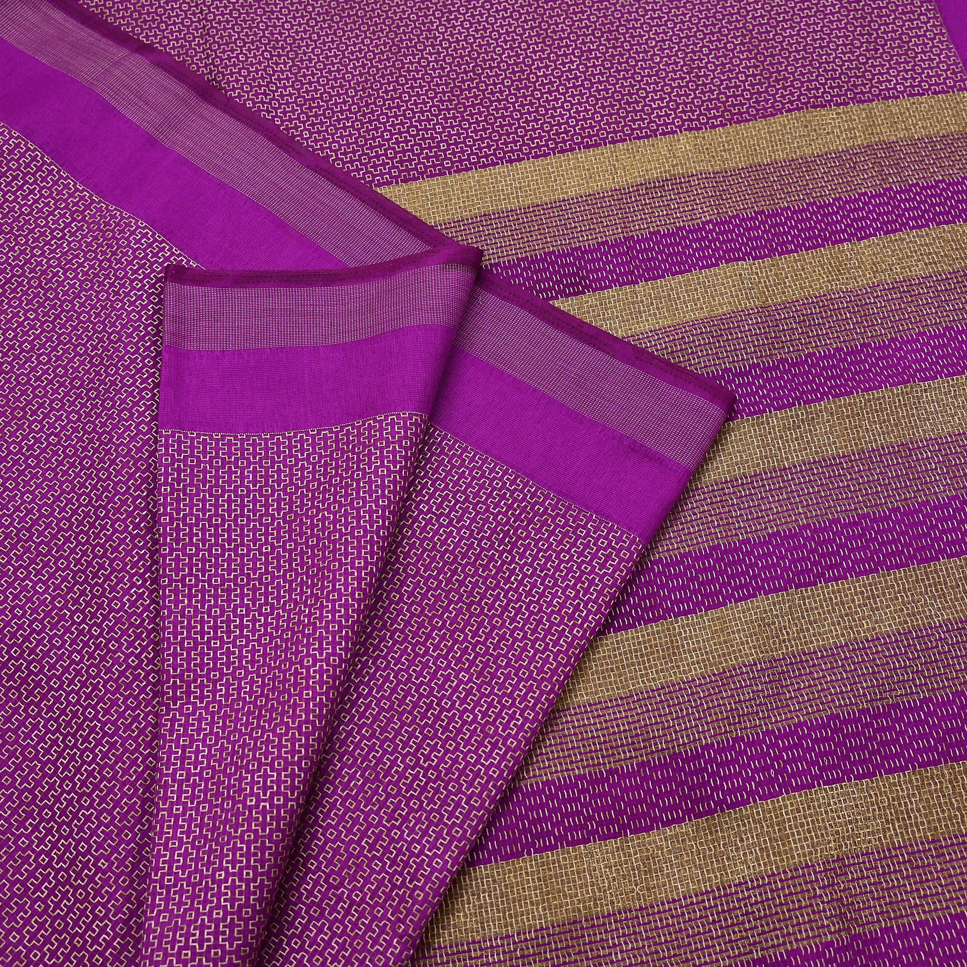 This 6-yard vintage sari is crafted from Chanderi with a lustrous finish and elegant woven golden Zari patterns throughout. The deep royal purple base is complemented by golden Zari Border & Fringes work On pallu, forming delicate geometric motifs and traditional Indian-style stripes on the pallu.