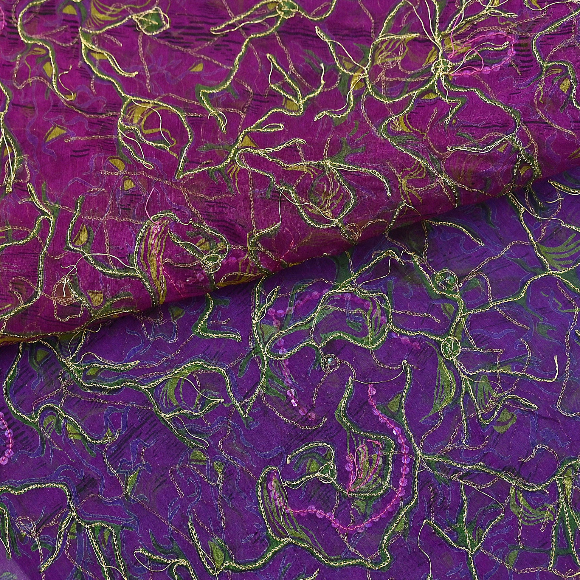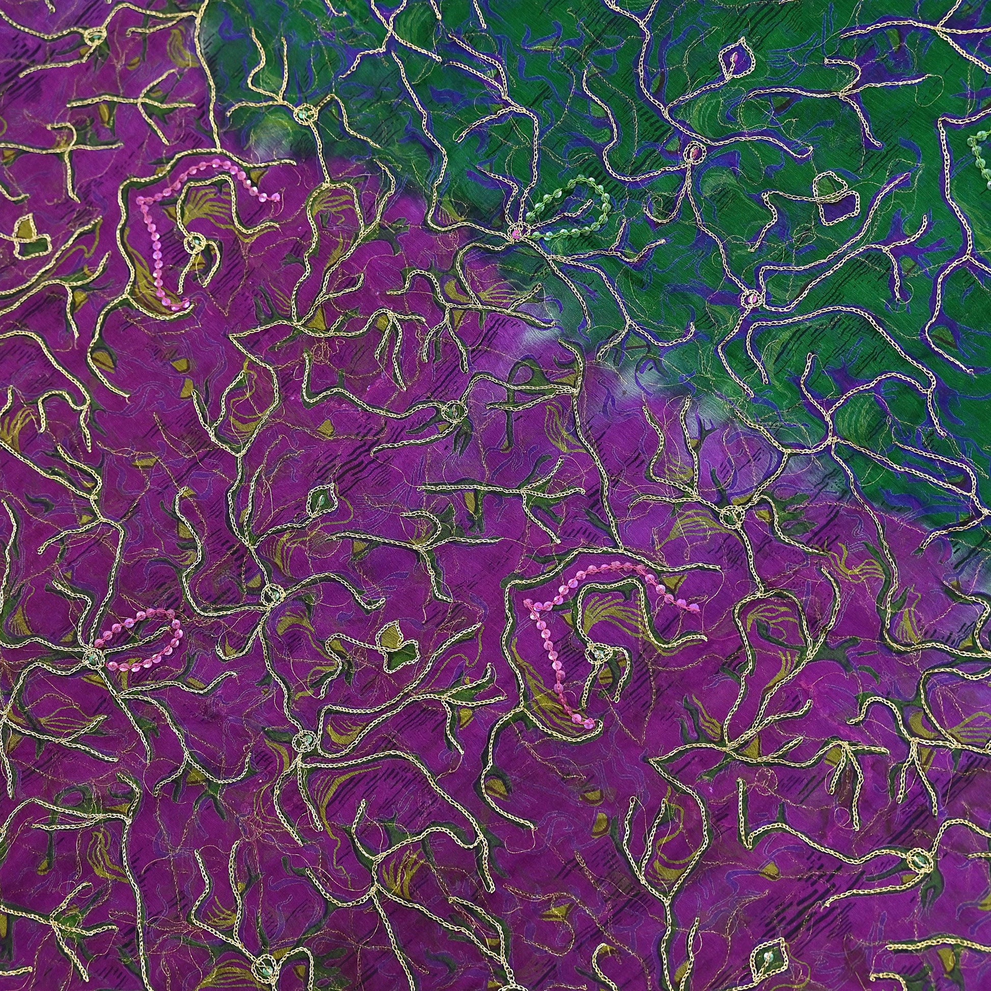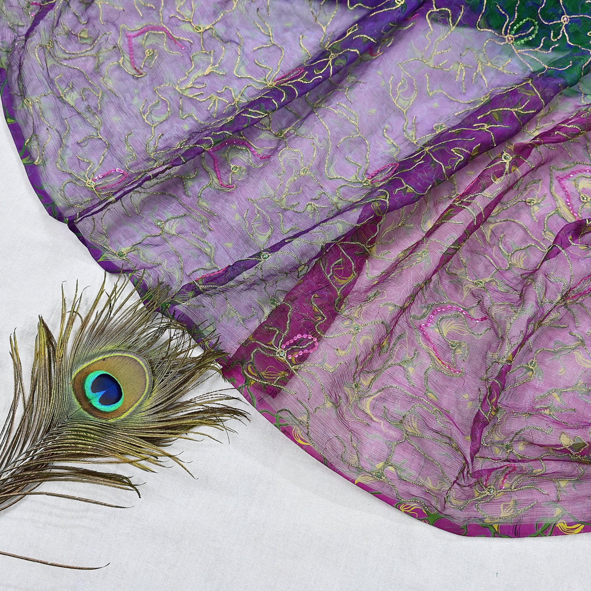 Stunning Vintage Printed Hand Embroidered Purple & Green Pure Chiffon Silk Dupatta | Golden Zari & Sequins Work | Lightweight & Sheer