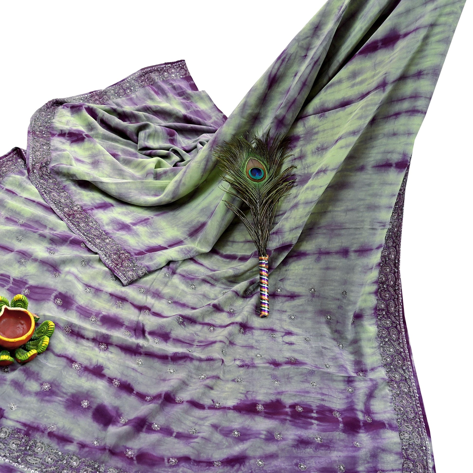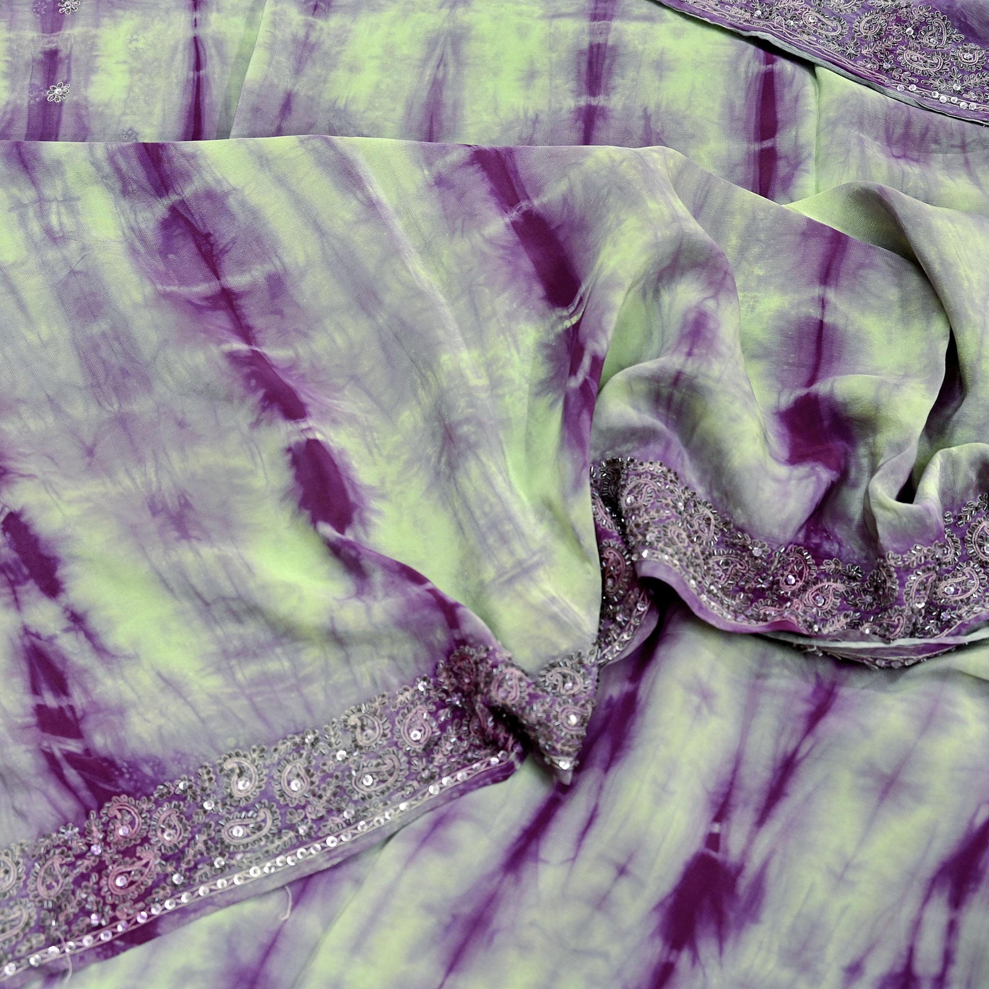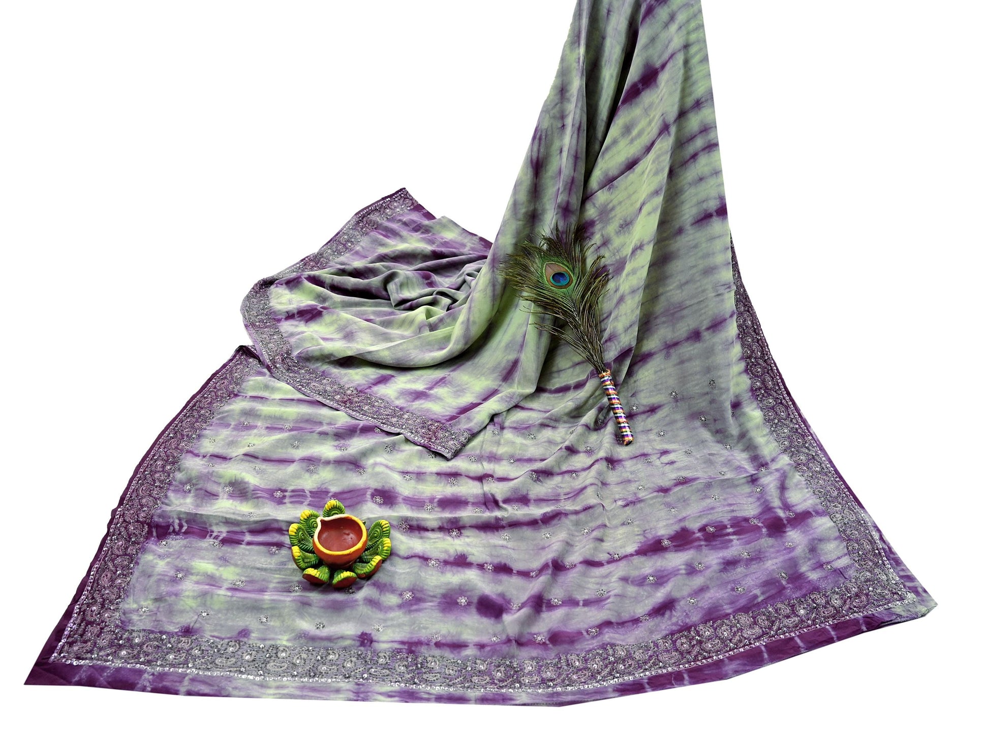 Outstanding Purple & Green colored 100% pure Crepe silk hand embroidered Tie-dye saree.