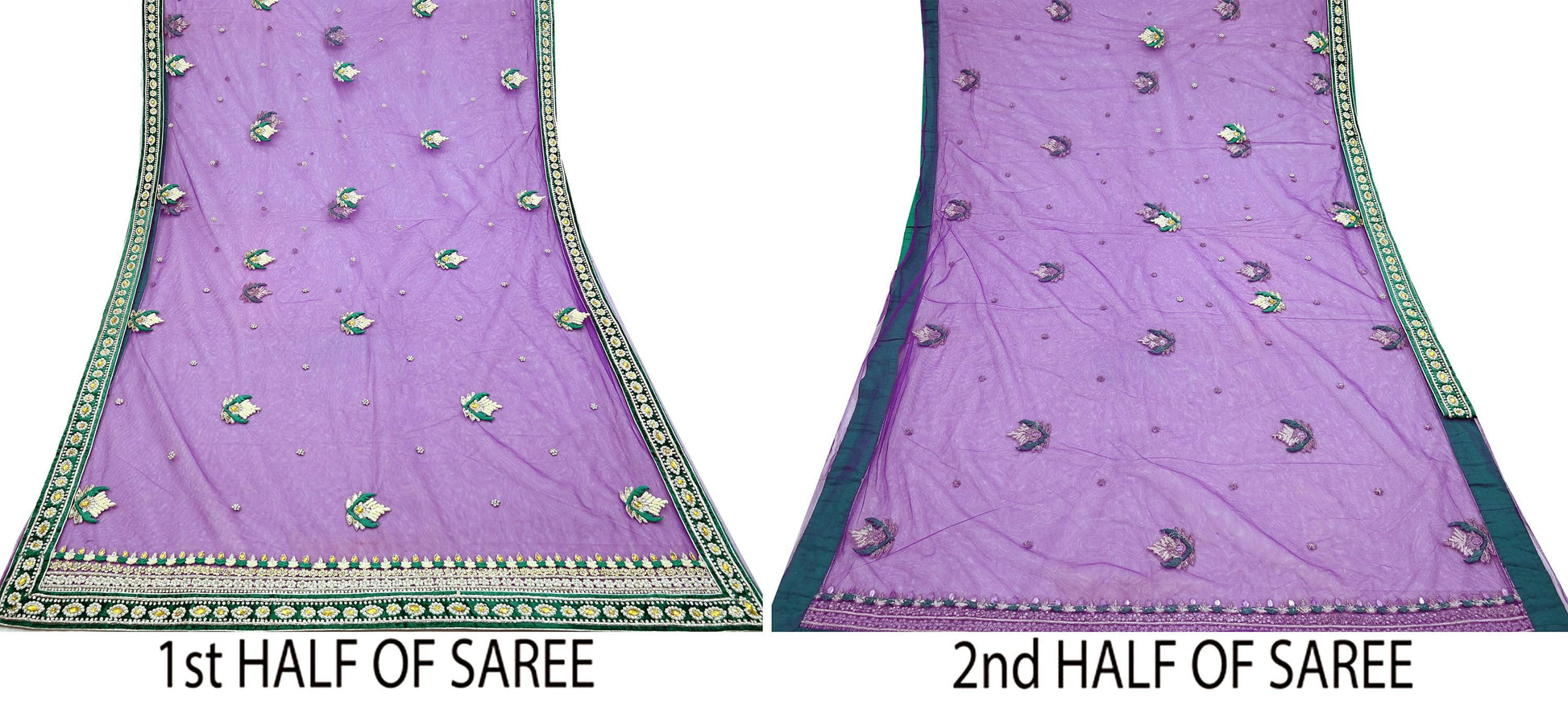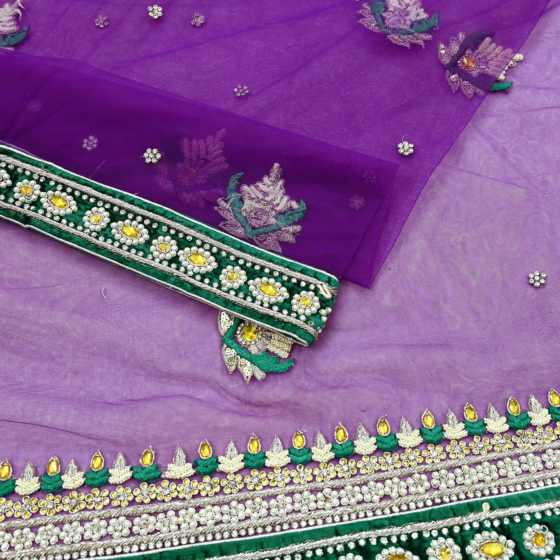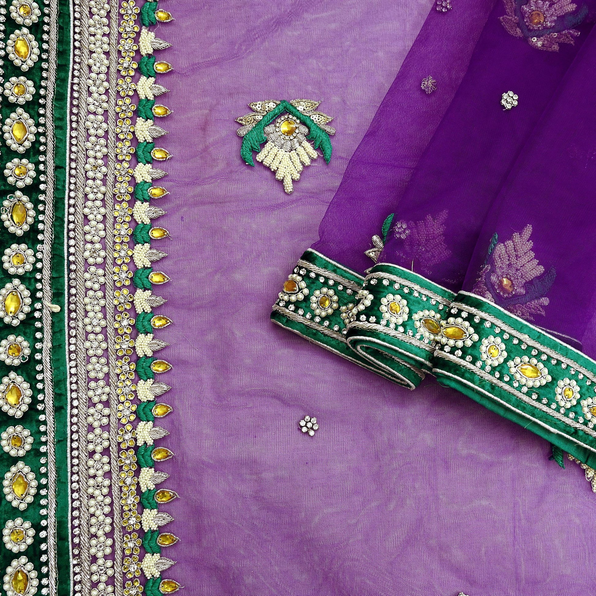 This exquisite vintage Purple saree is crafted from soft net fabric and beautifully hand-embellished with white stones, pearl-like beads, white & yellow stones silver Zardozi/ Dabka, Zari work, and intricate Green thread embroidery. The saree comes with a matching unstitched Chanderi blouse fabric, making it perfect for both traditional wear and creative repurposing.