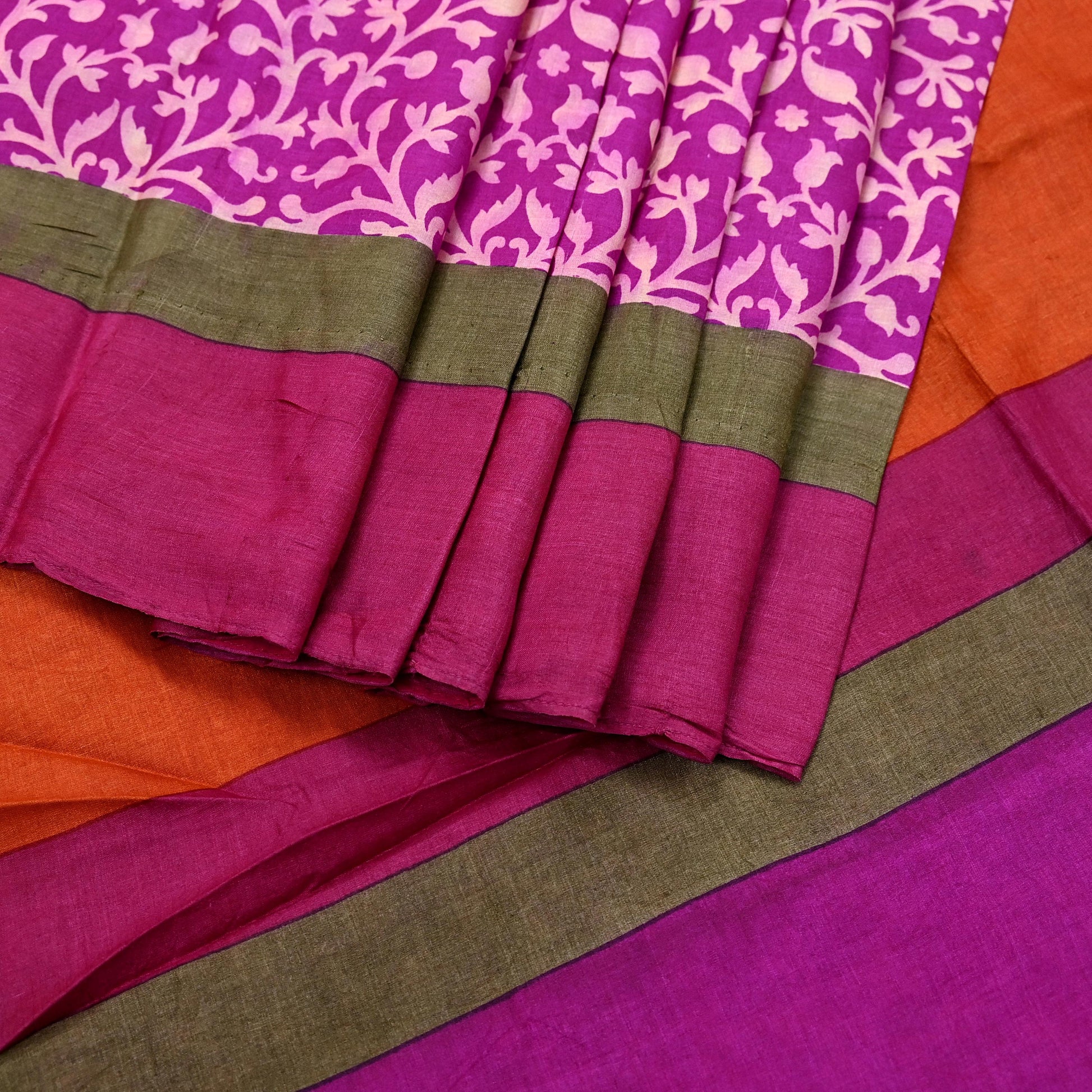 *An Awesome Purple & Orange Colored 100% Pure Khadi Silk Handloom Block Printed Sari.