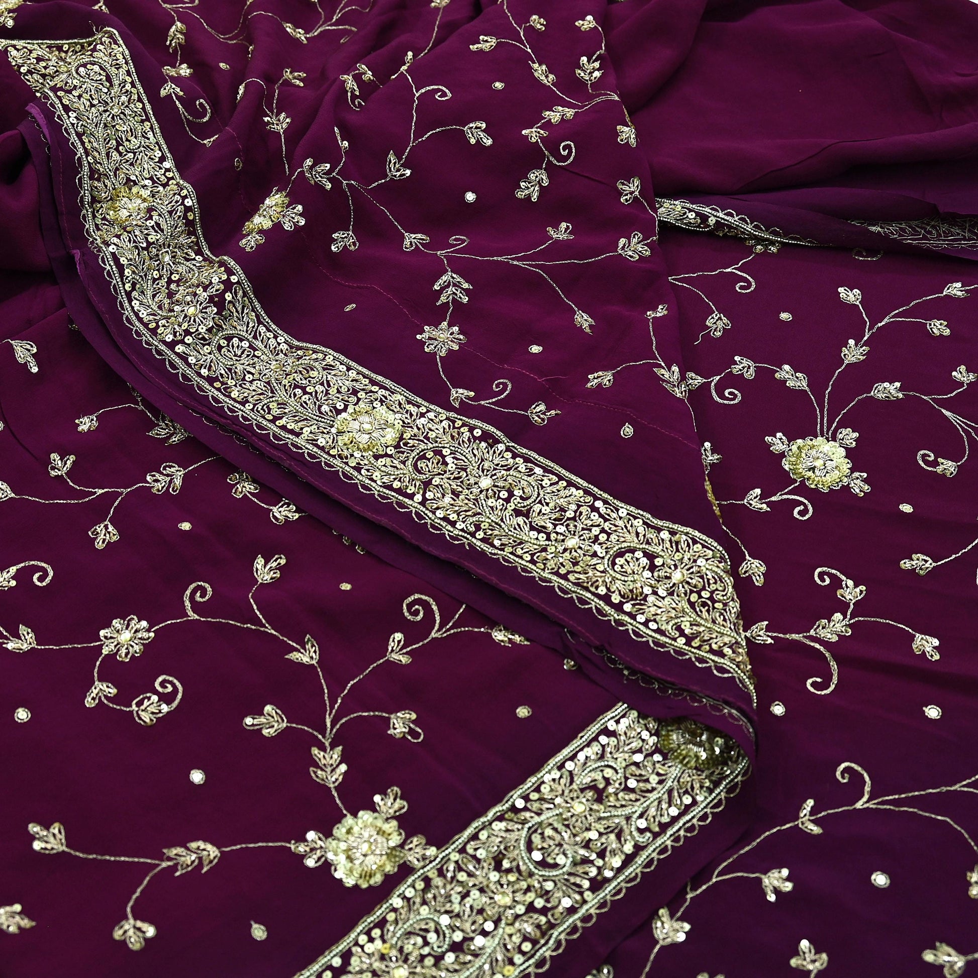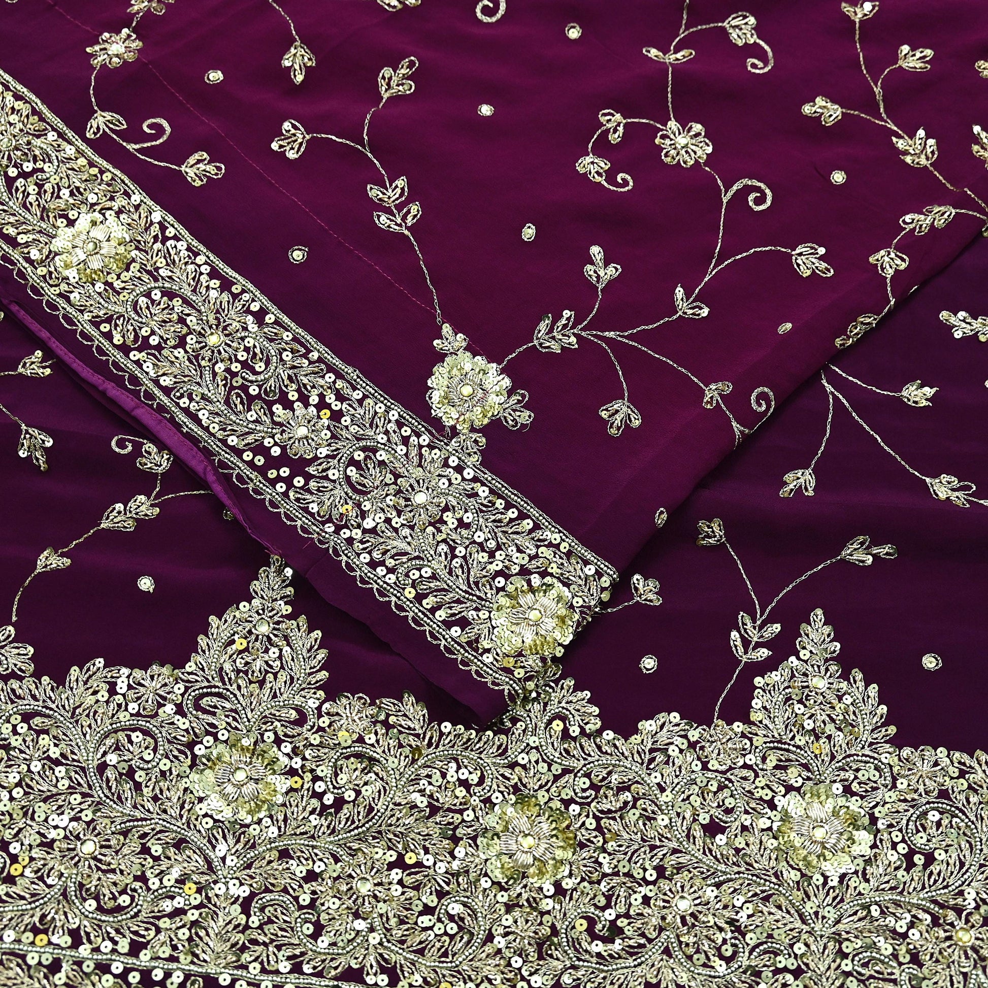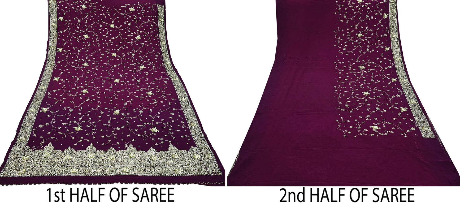 Indian Vintage Purple Saree | Pure Crepe Silk | Hand Embroidered with Zardozi | 5 Yards Soft Fabric for Sewing, Dressmaking, Craft Projects