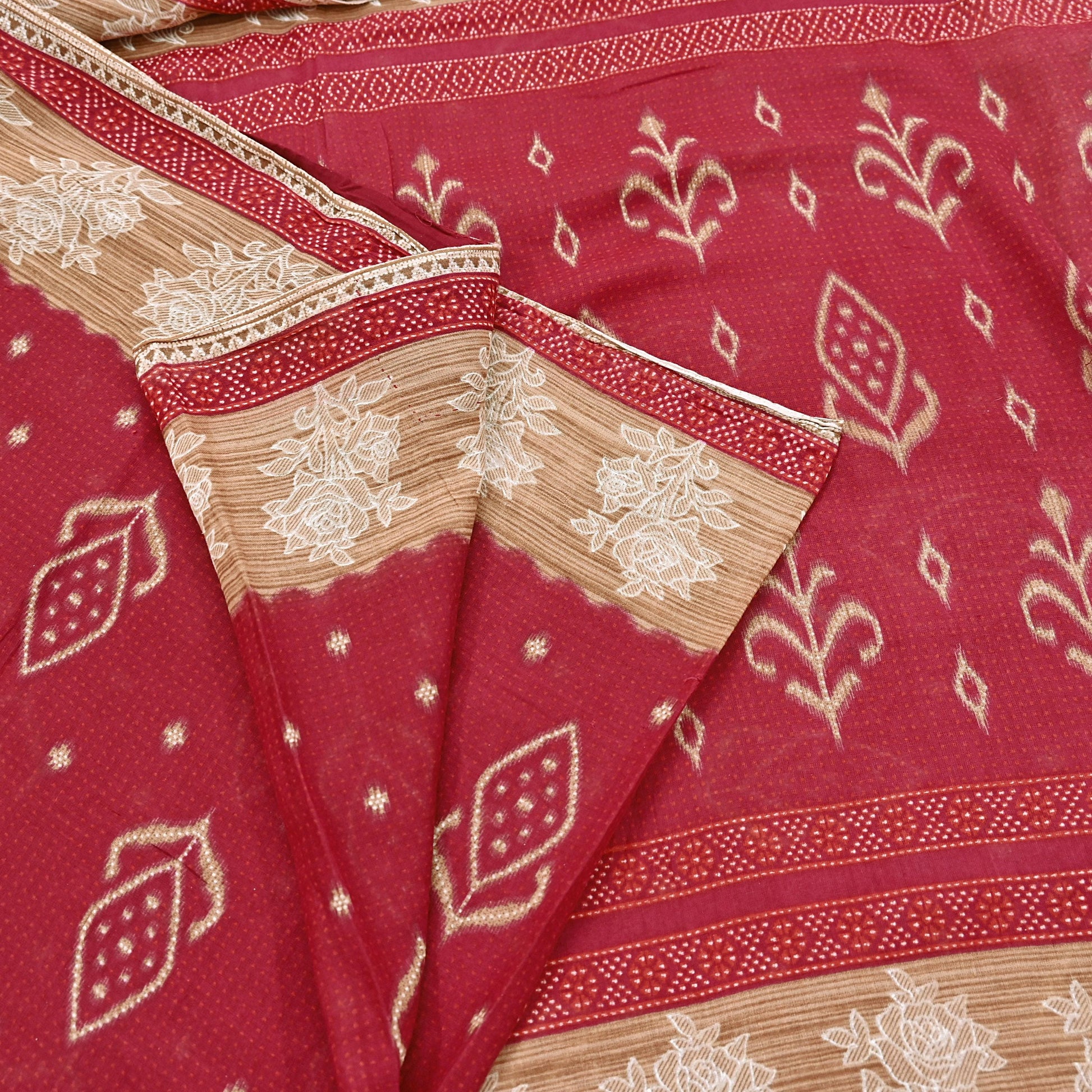 Nice Floral Design With Printed Work On Red & Beige Color Base Fabric Is Really Enhancing The Beauty Of The Saree.