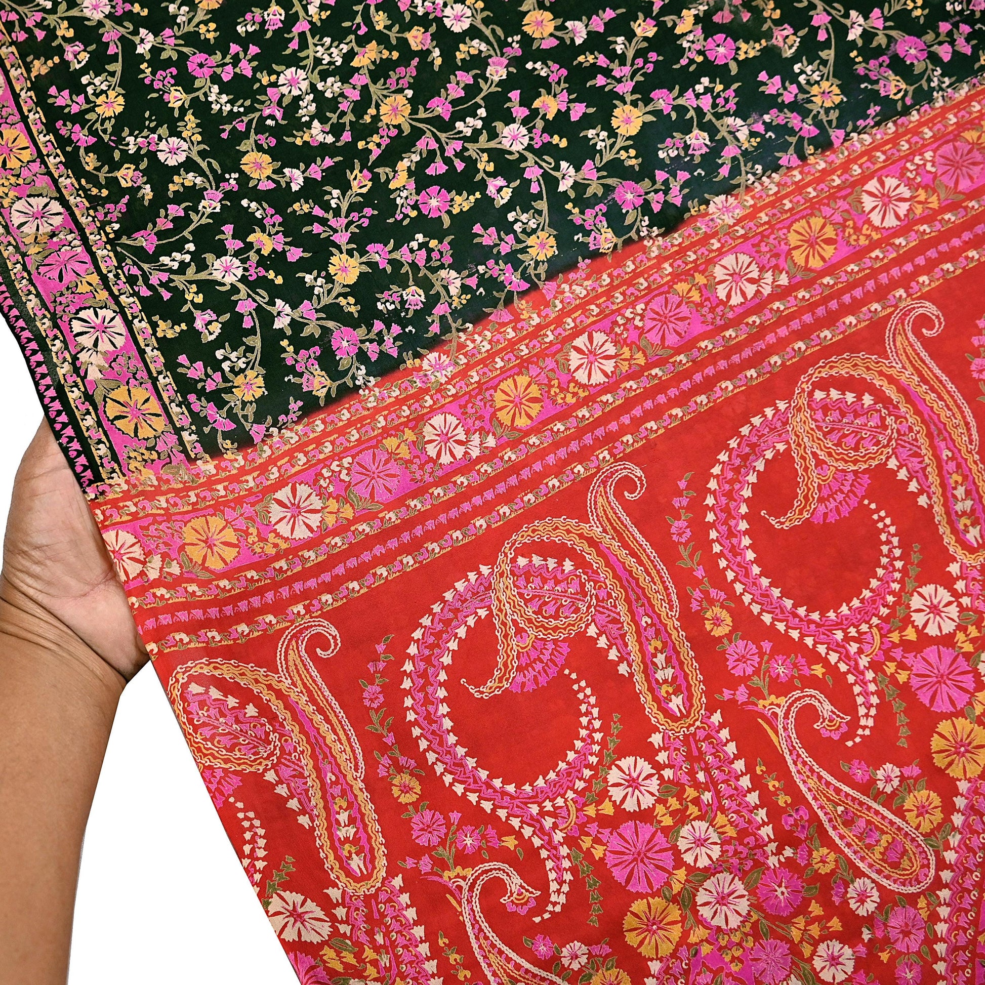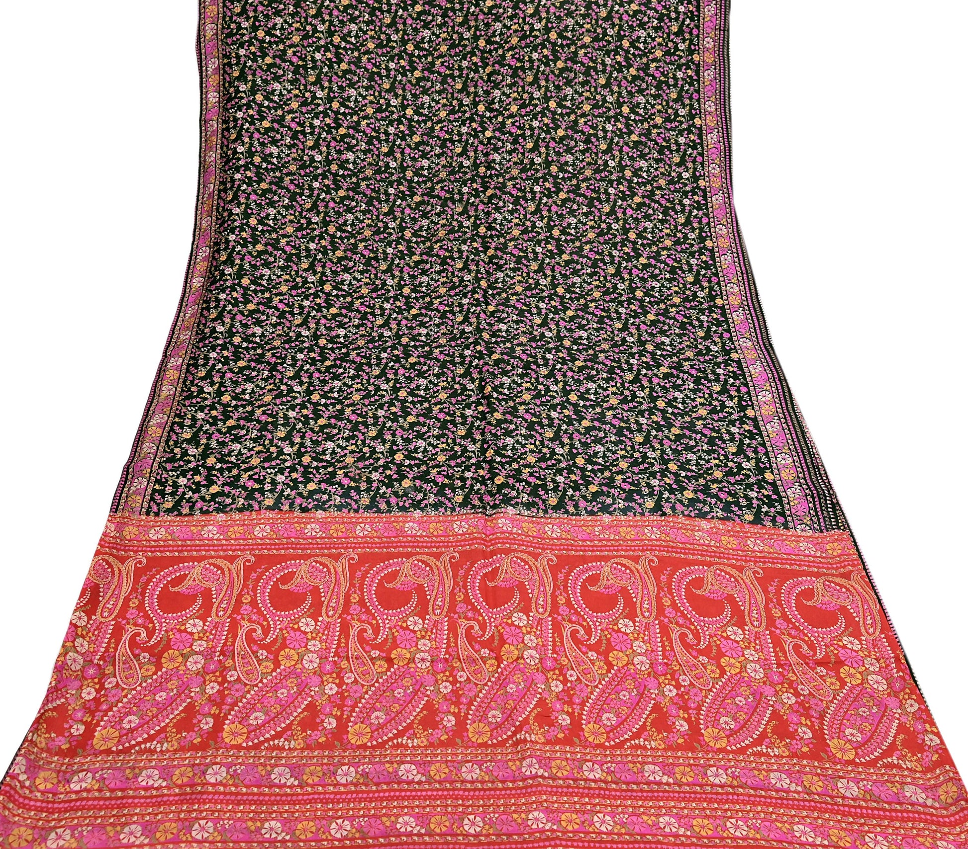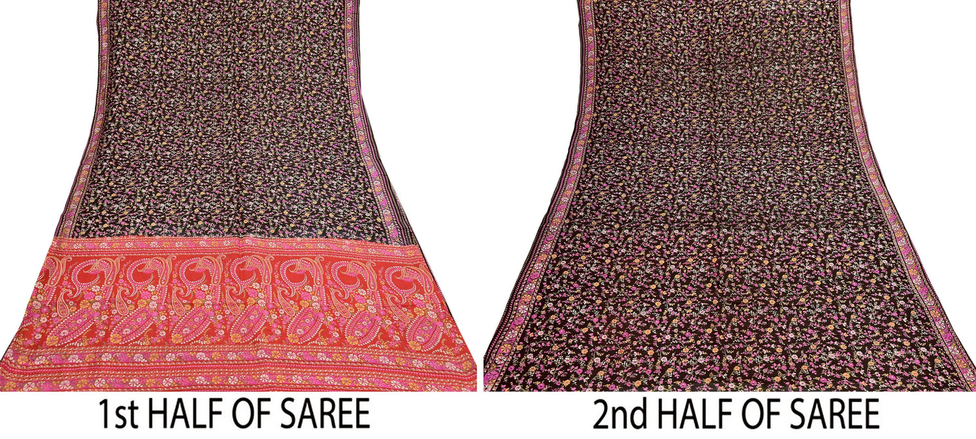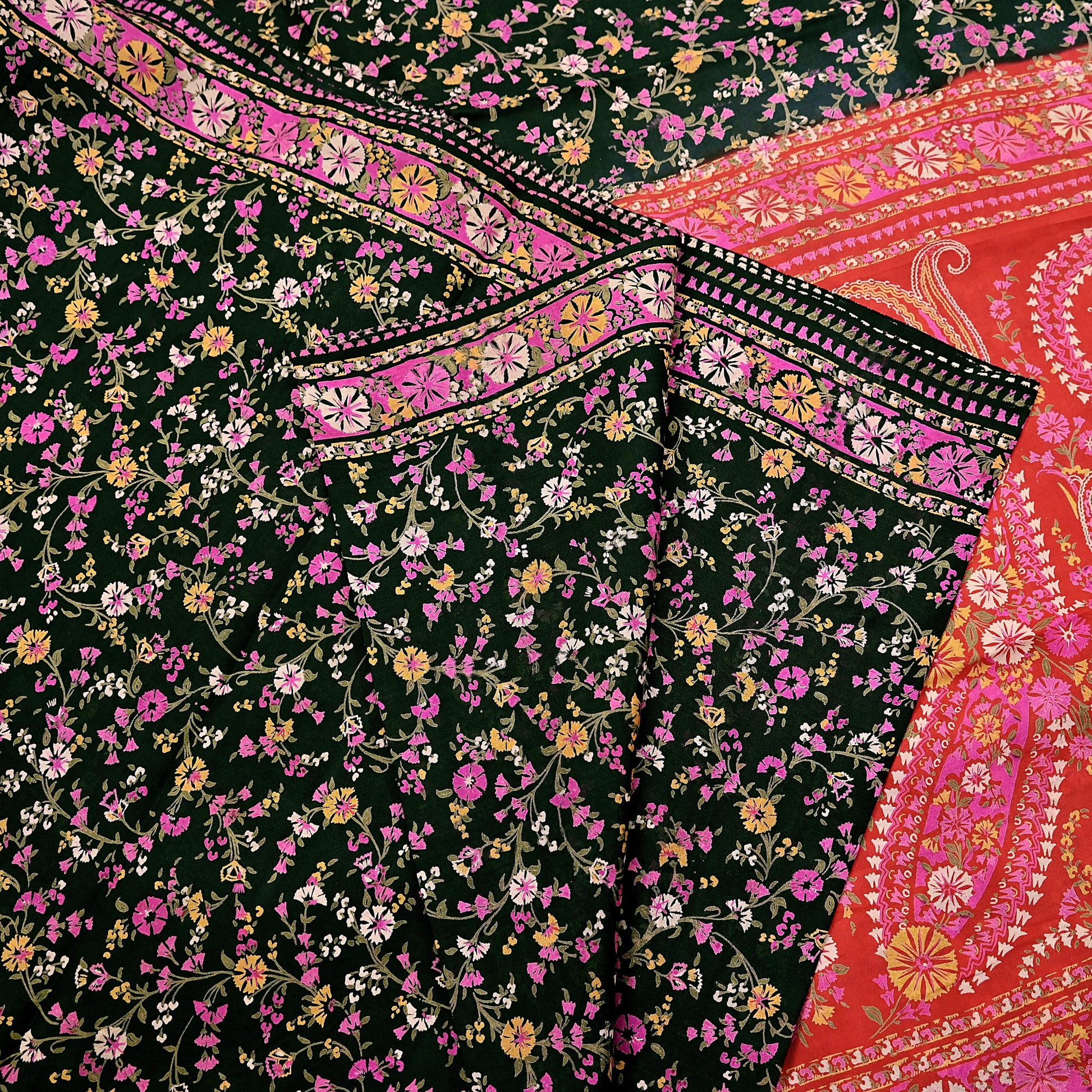 The contrast of vibrant floral patterns on a silky Red & Black background gives this saree a unique elegance, perfect for repurposing into beautiful garments or home accents.