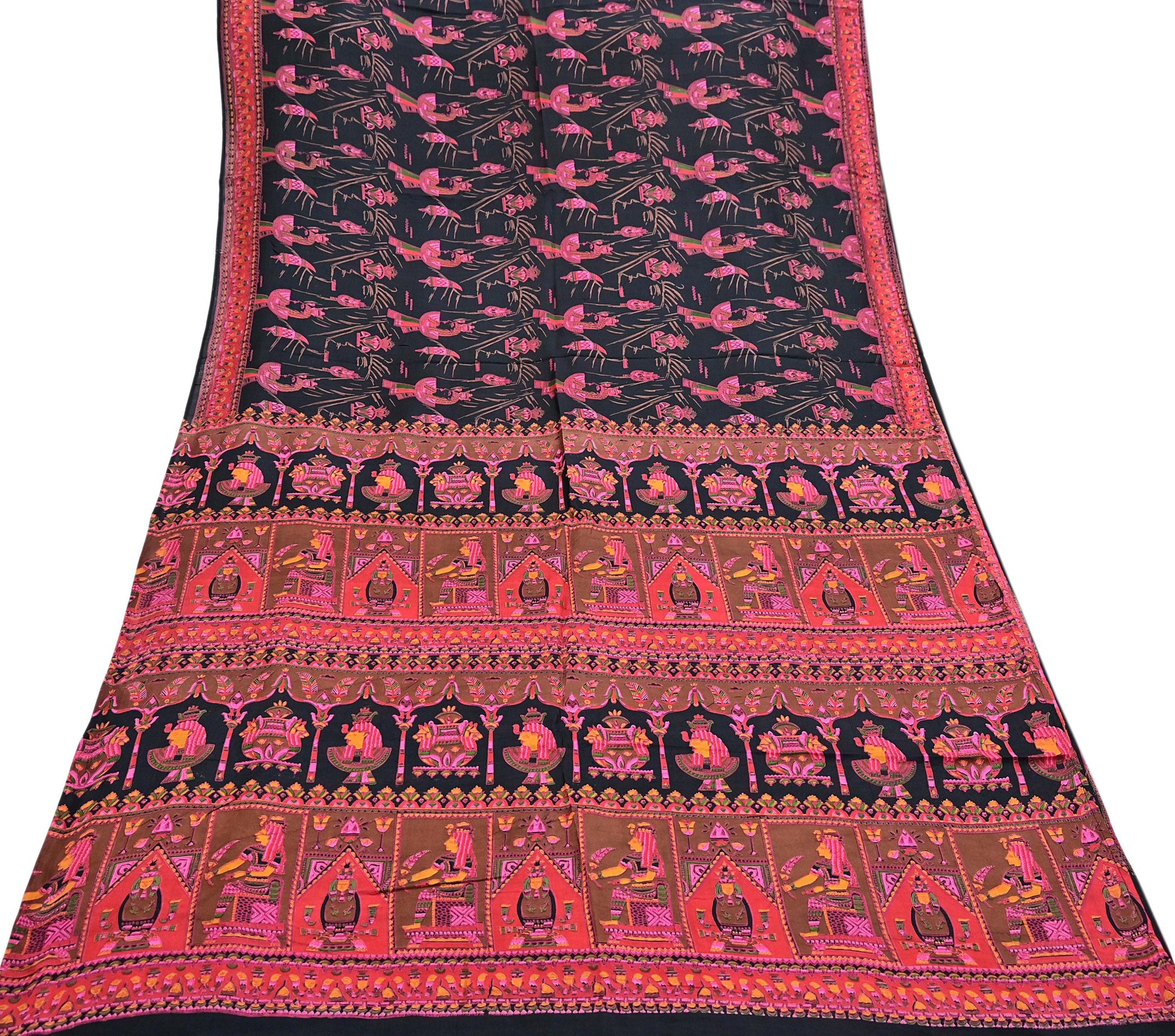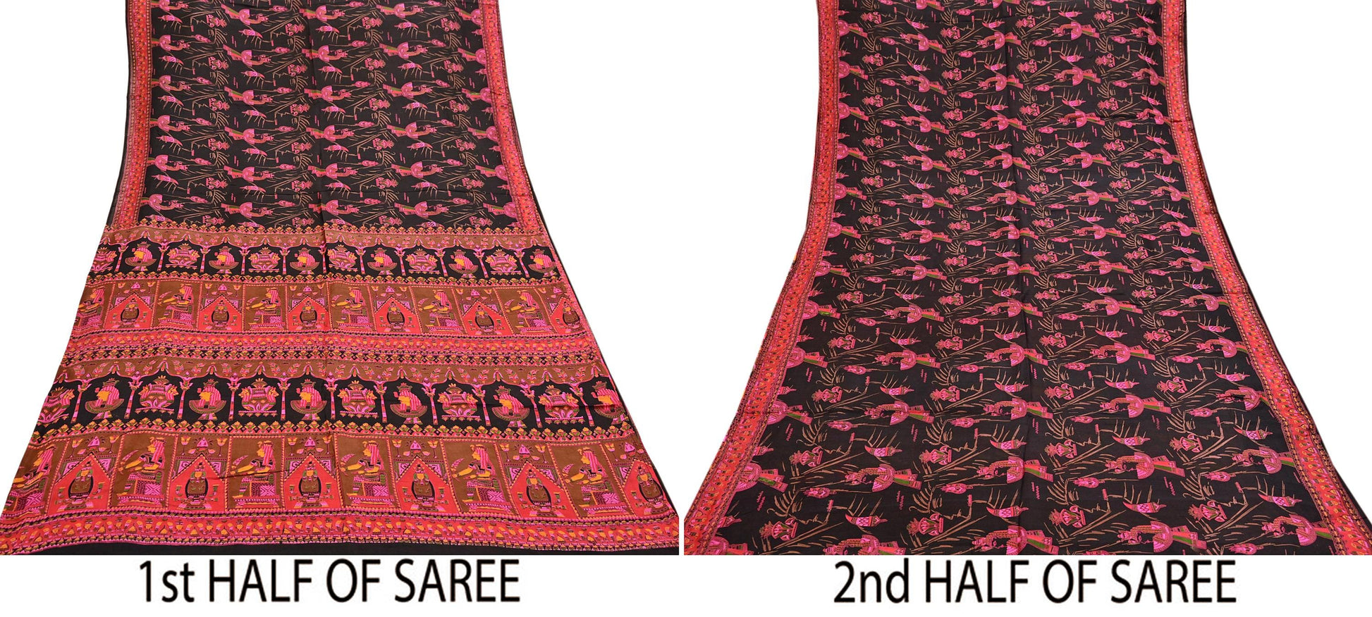 Indian Vintage Red & Black Pure Silk Printed Saree 6Yards Soft Floral Fabric for Dressmaking, Quilting, Crafting, Sewing, Dress Making