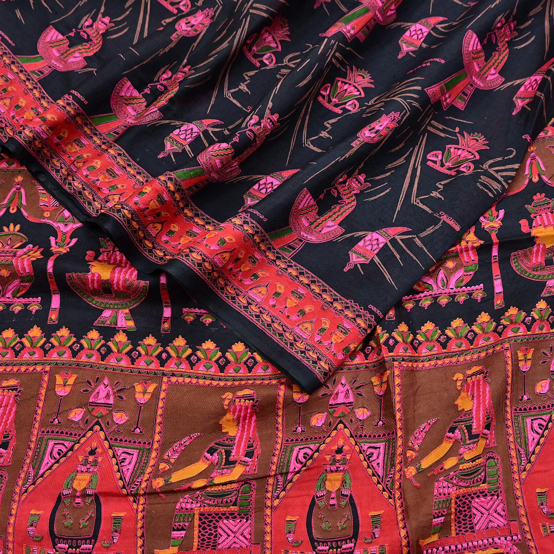This attractive vintage saree, crafted from 100% pure silk, features a graceful Red & Black base beautifully contrasted by Multi humans printed motifs. Lightweight and soft with an elegant drape, it’s ideal for both traditional wear and creative projects.