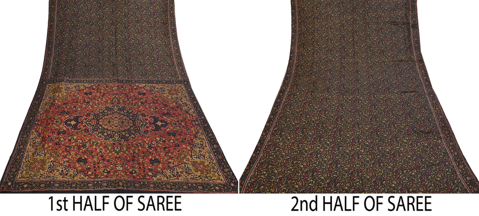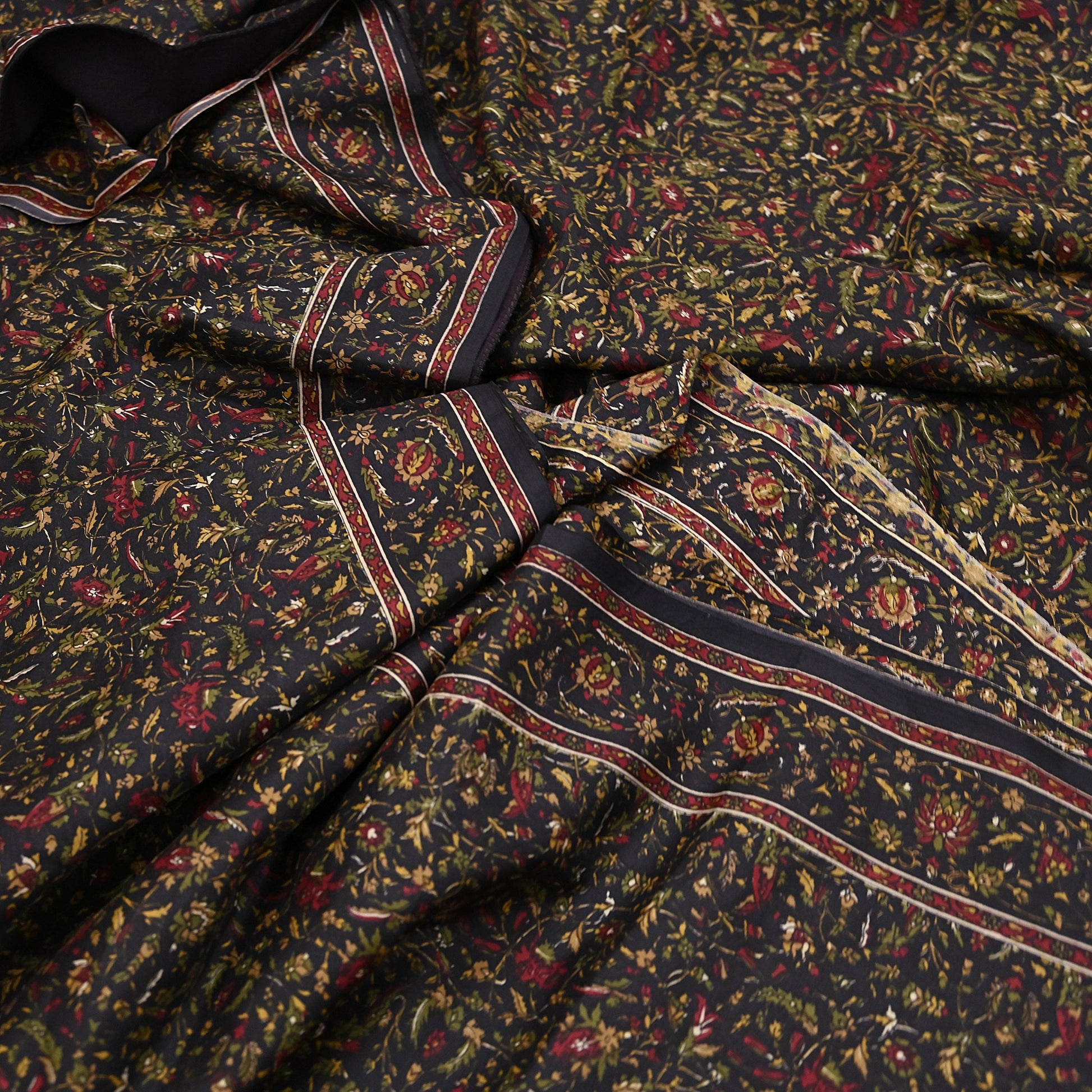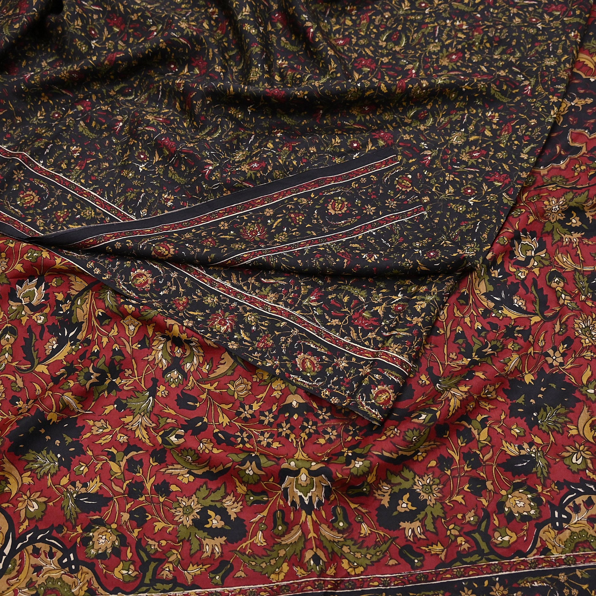 The contrast of vibrant floral patterns on a silky Red & Black background gives this saree a unique elegance, perfect for repurposing into beautiful garments or home accents.