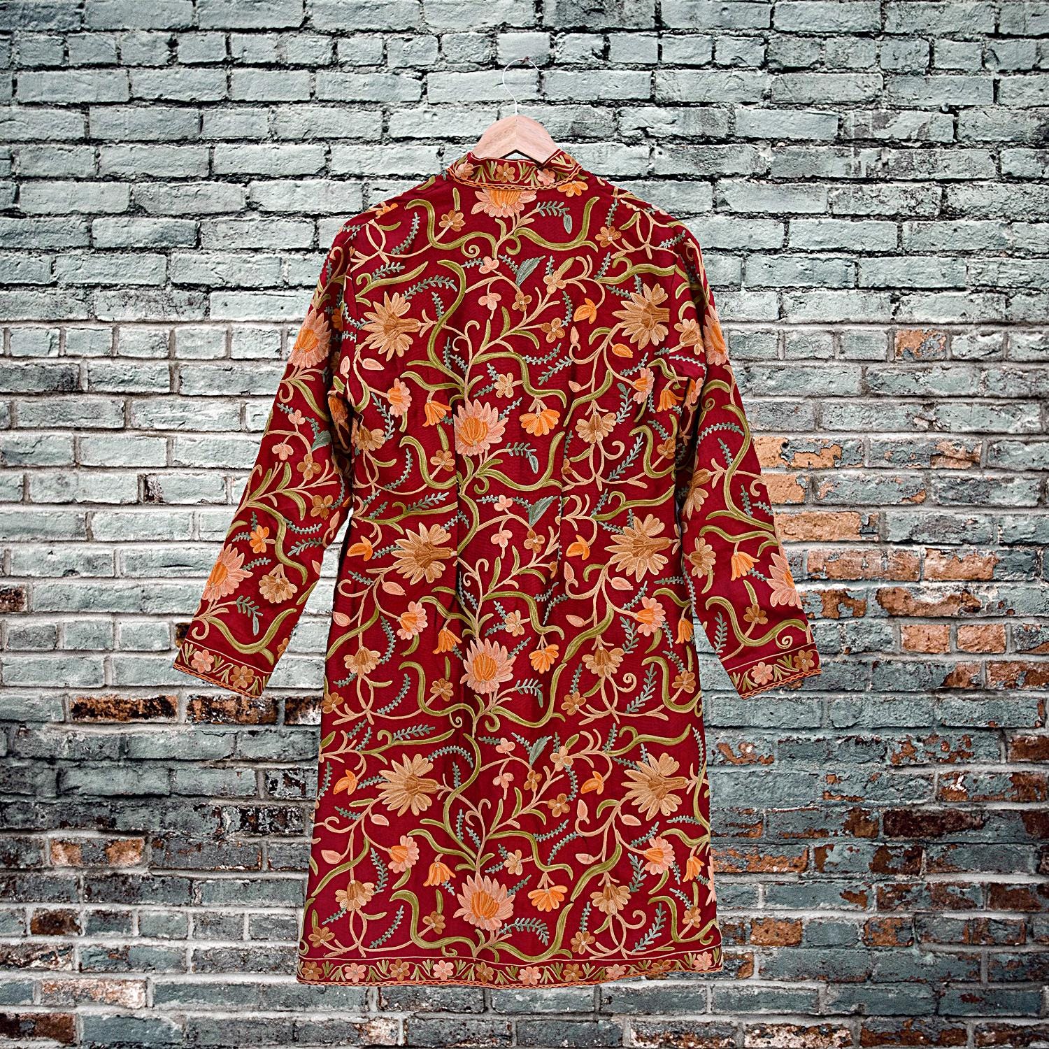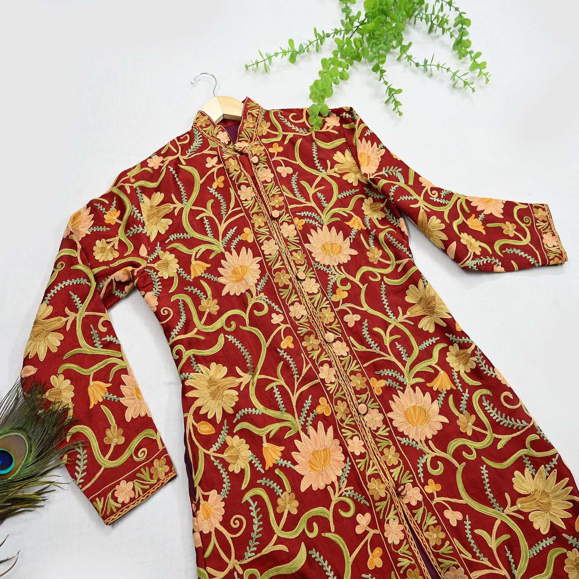 Indian Vintage Red Embroidered Kashmiri Coat, Aari Embroidery, Raw Silk Coat, Boho Jacket For Both Women/Men Indian Coat