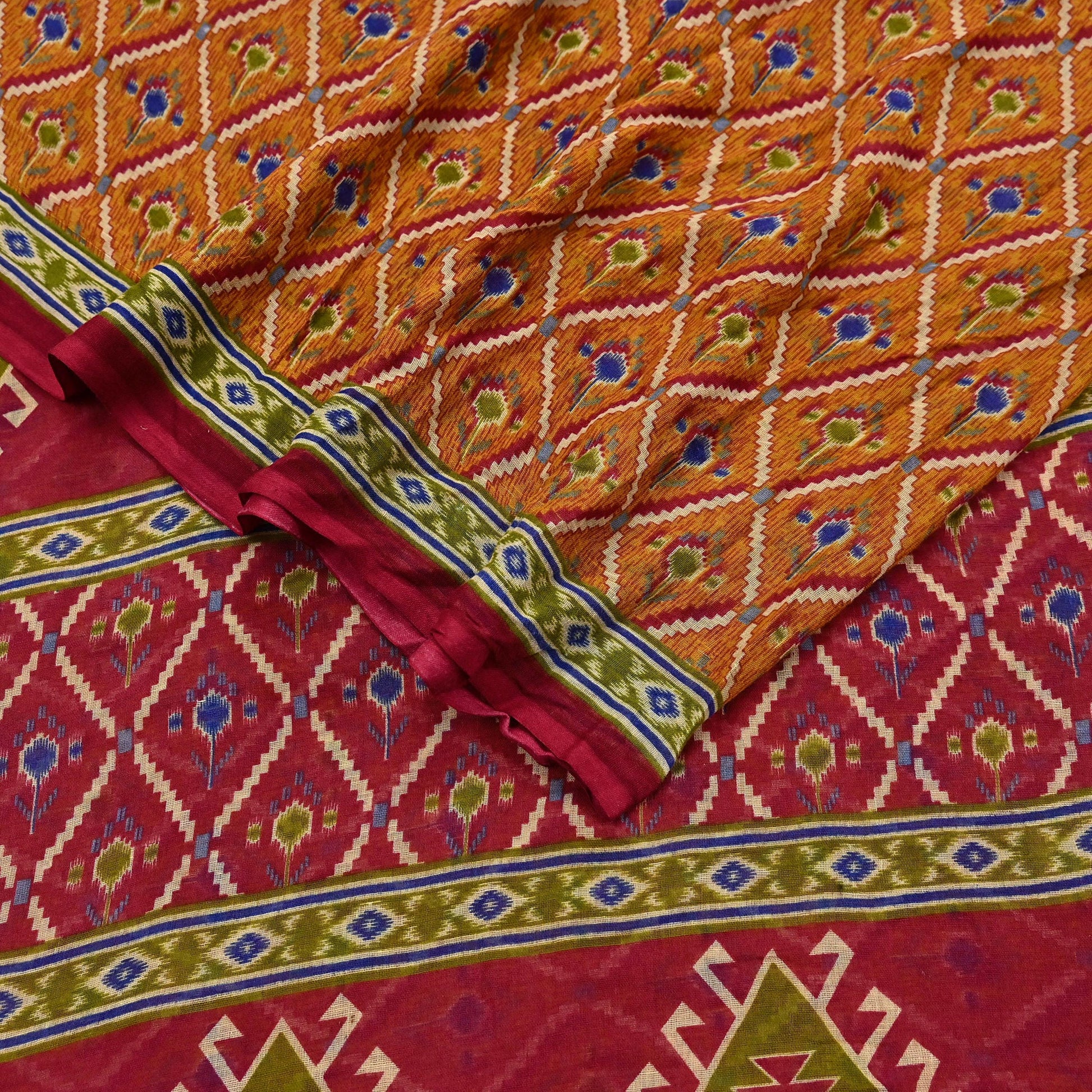 Nice Floral Design With Printed Work On Red & Mustard Color Base Fabric Is Really Enhancing The Beauty Of The Saree.