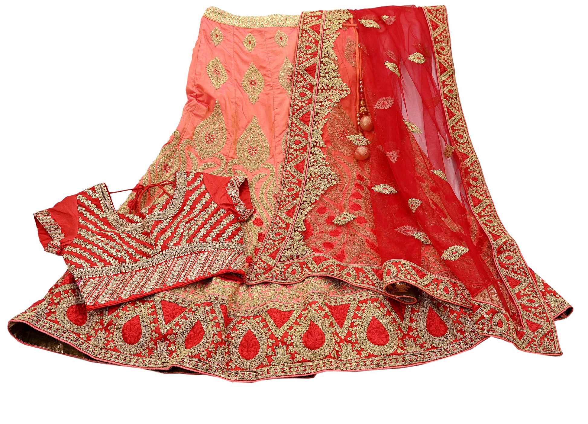 Stunning Hand Embroidered Heavy Lehenga, Blouse,Dupatta 3pcs Set Skirt/Dupatta In Peach & Red Colored & Net & Silk Fabric. With Matching Pure Chanderi Silk Blouse Fabric In Red Colored.