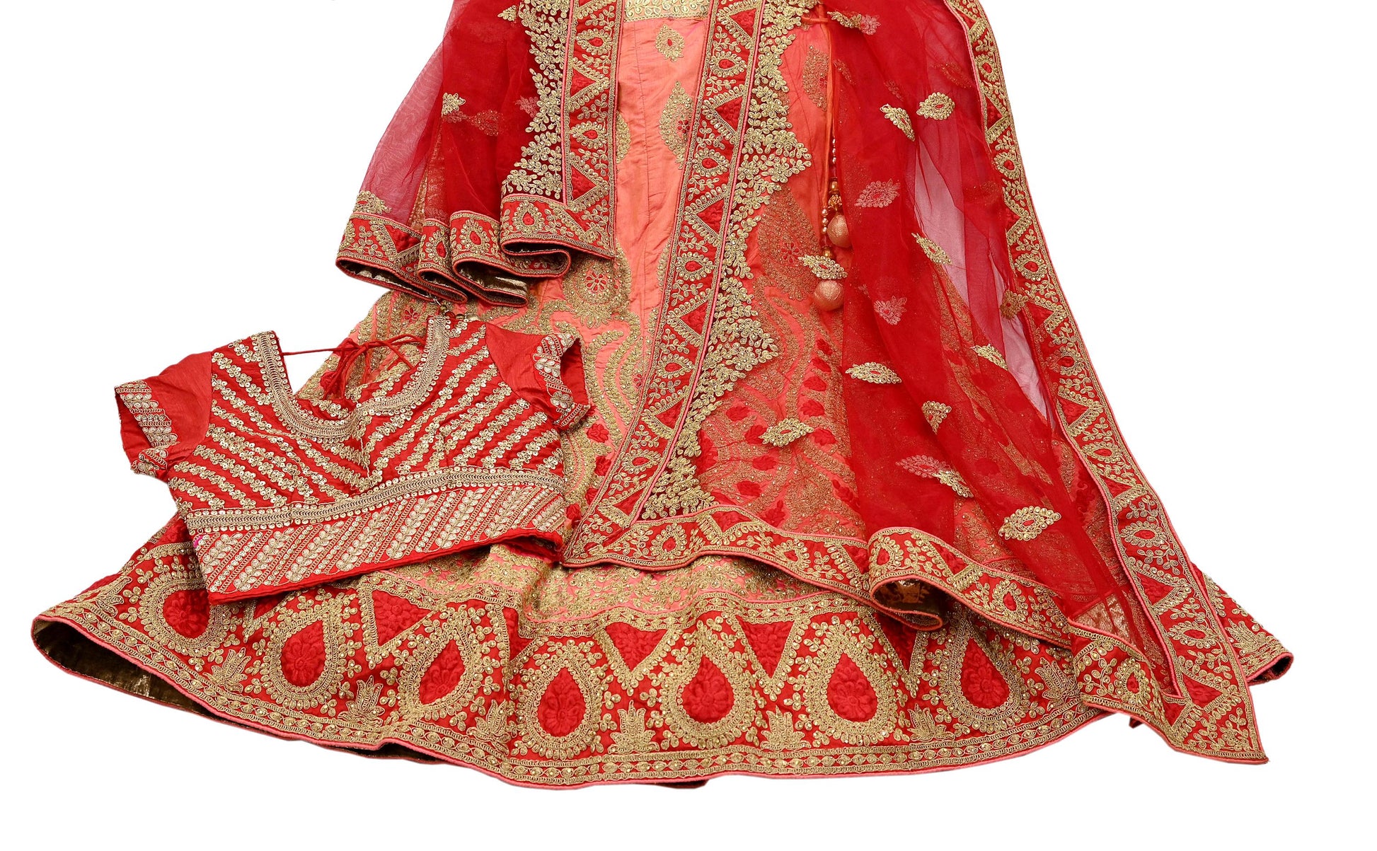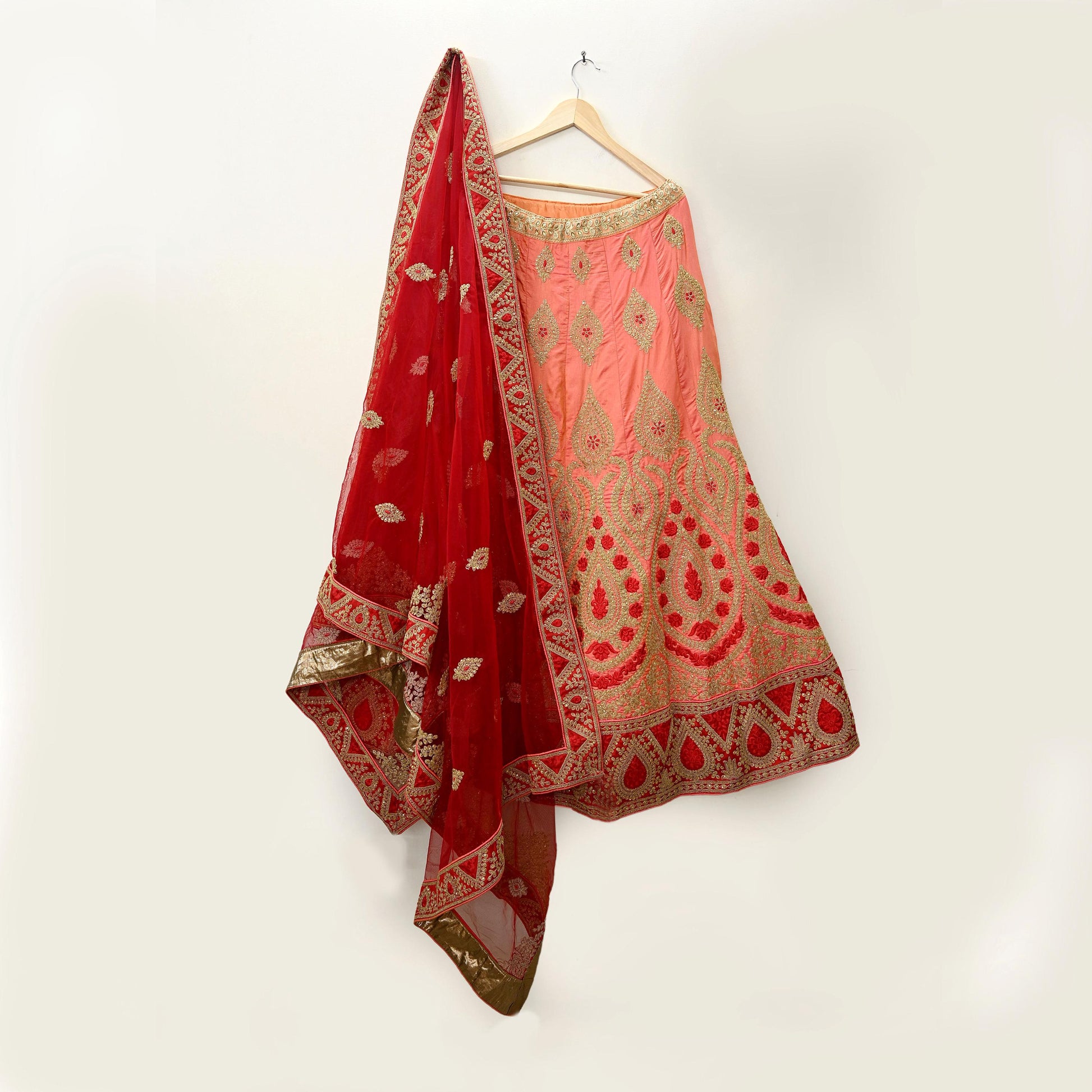 Indian Vintage Red & Peach Net/Mesh Silk Hand Embroidered Lehenga 3pcs Set Bridal Party Wear With Blouse/Dupatta Bollywood Lehenga Zardozi