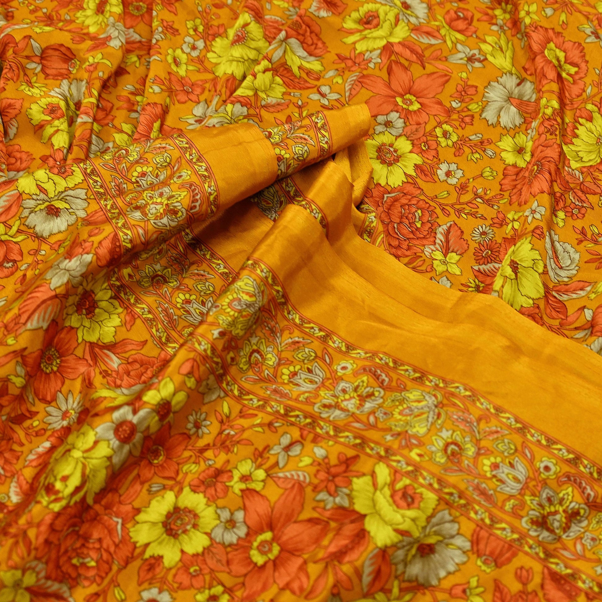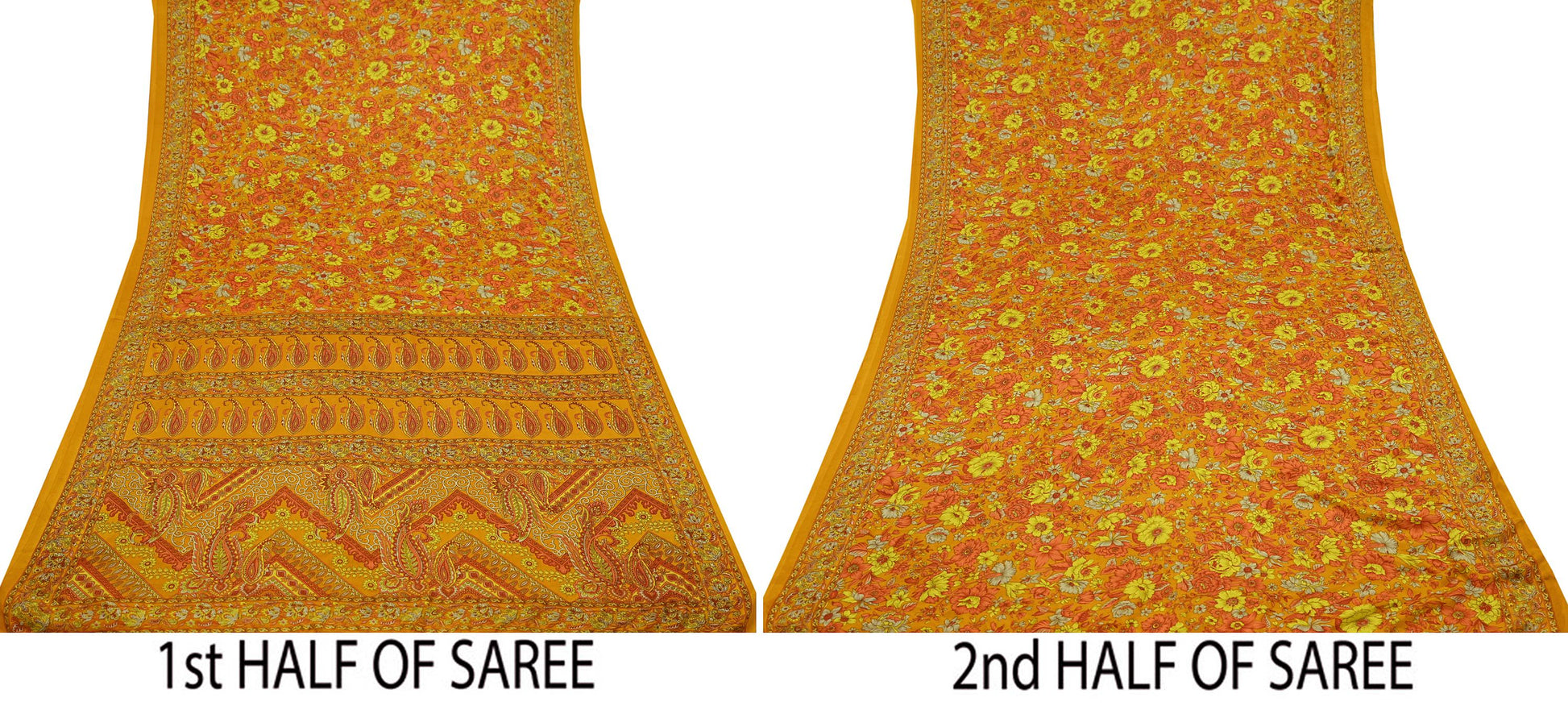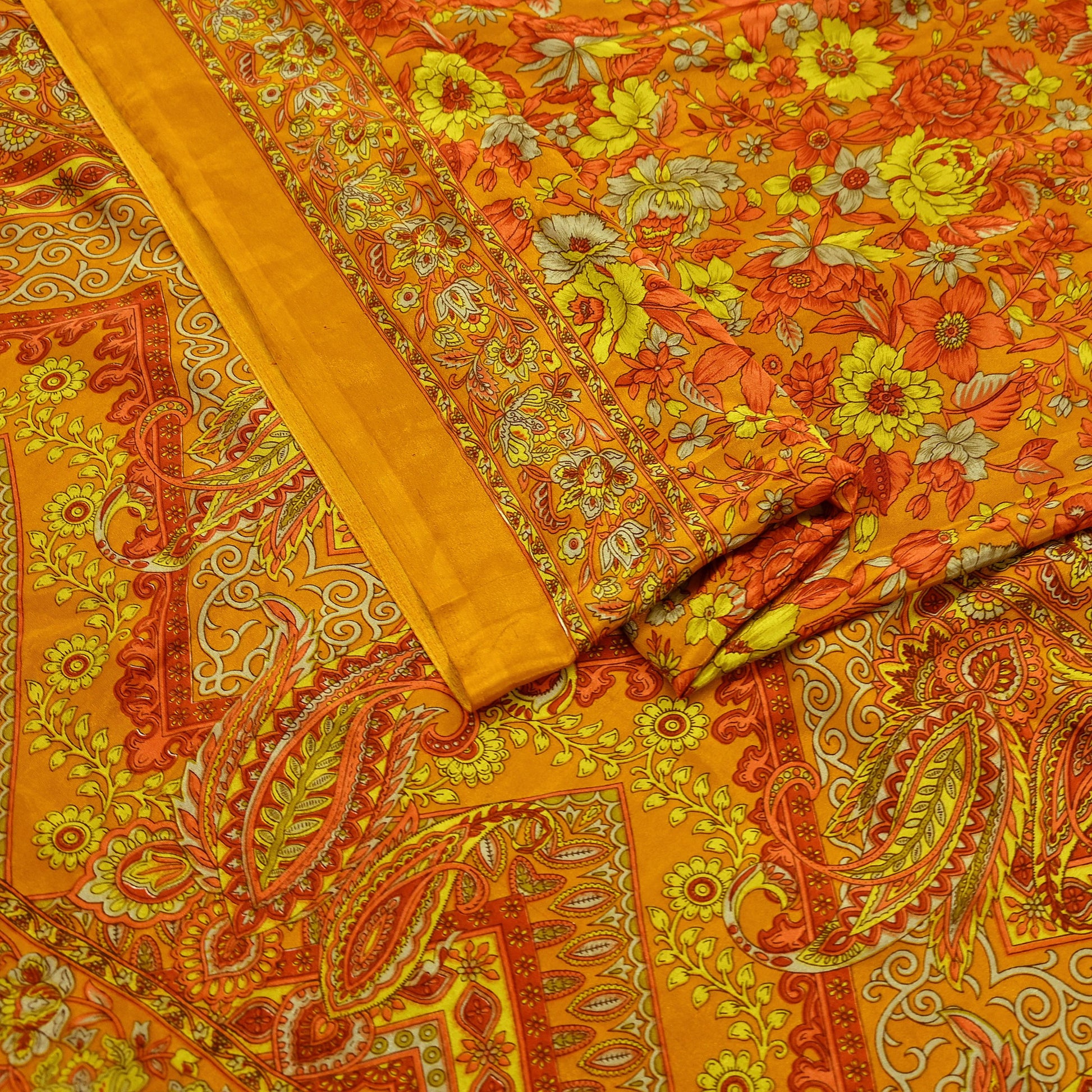 Indian Vintage Saffron Saree Moss Crepe Printed Sari 5yd Sewing Paisley Soft Craft Fabric Dressmaking