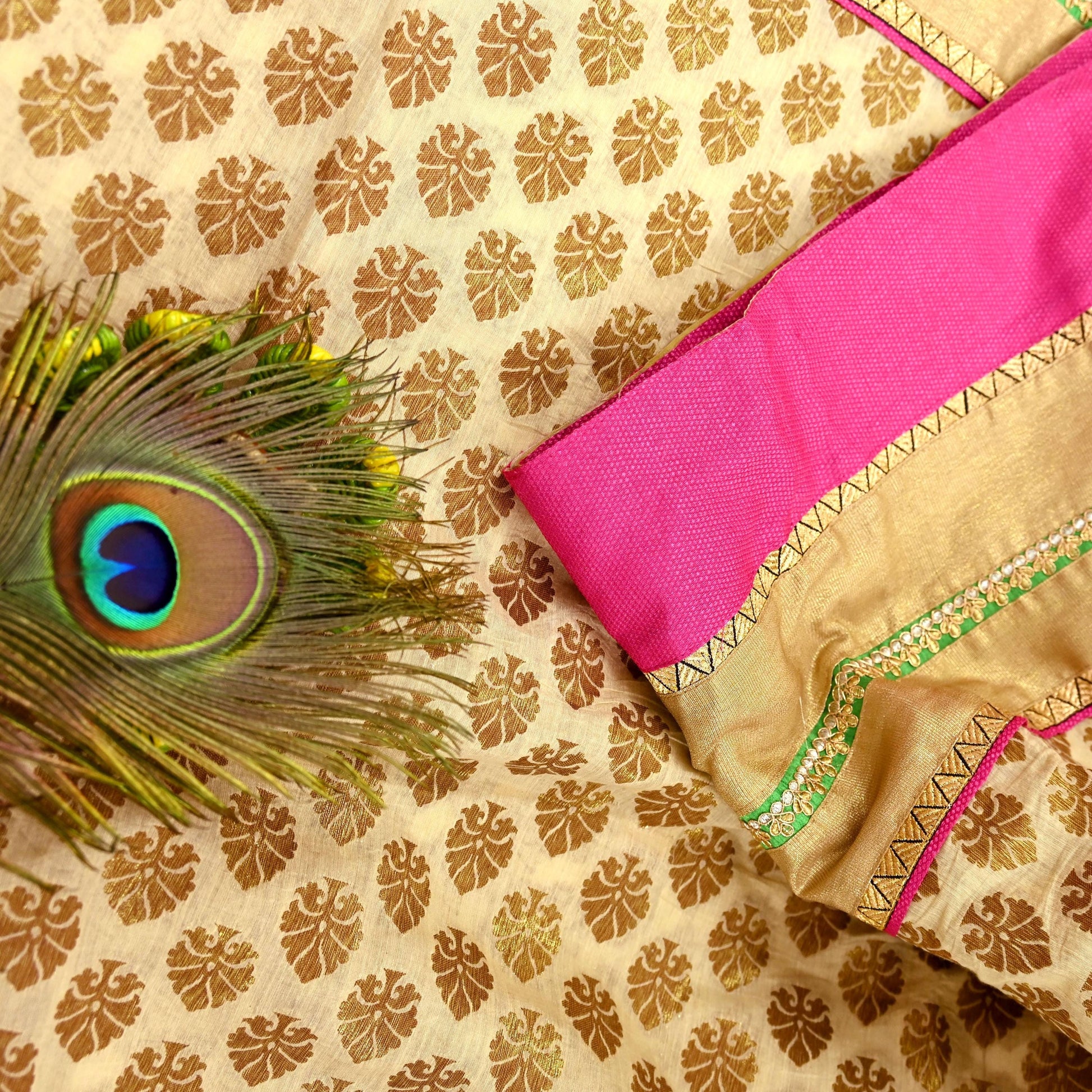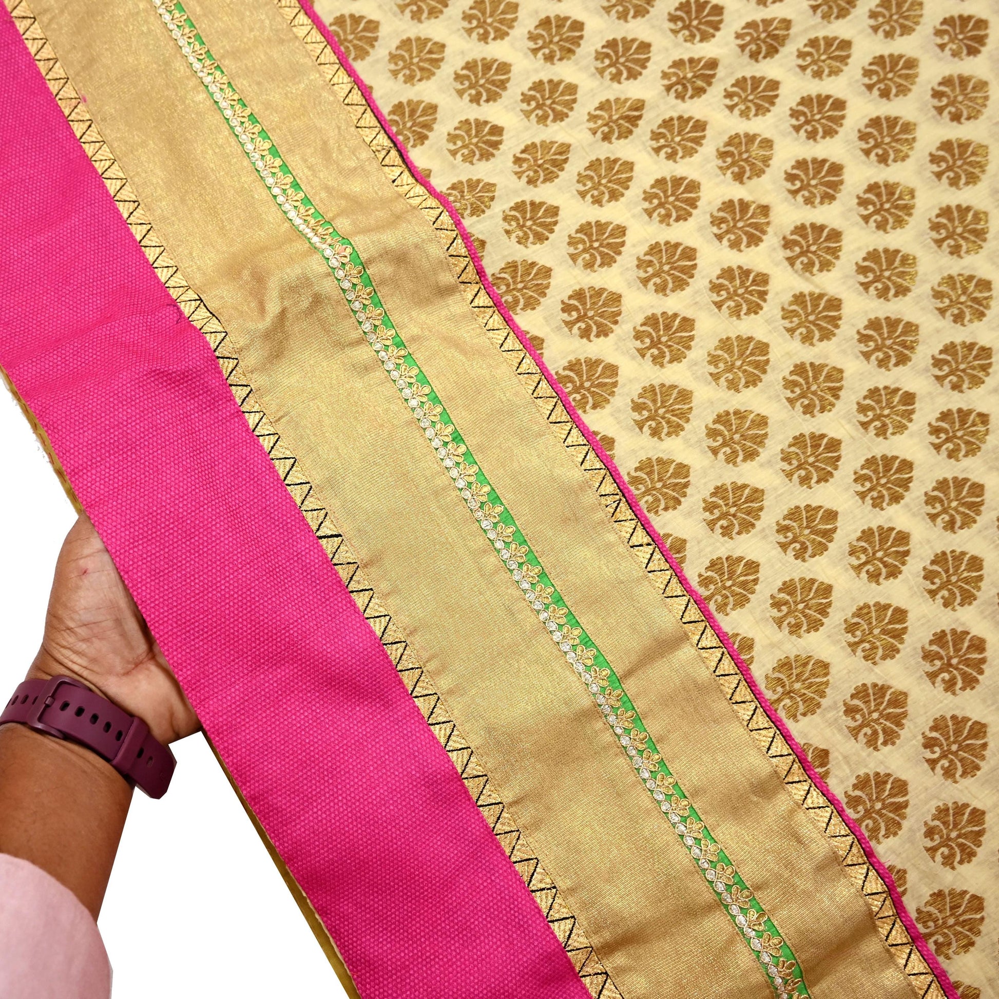 *pallu & border sari features Floral Design with Golden woven zari & Brown Woven, Golden, Green & Pink Border work.