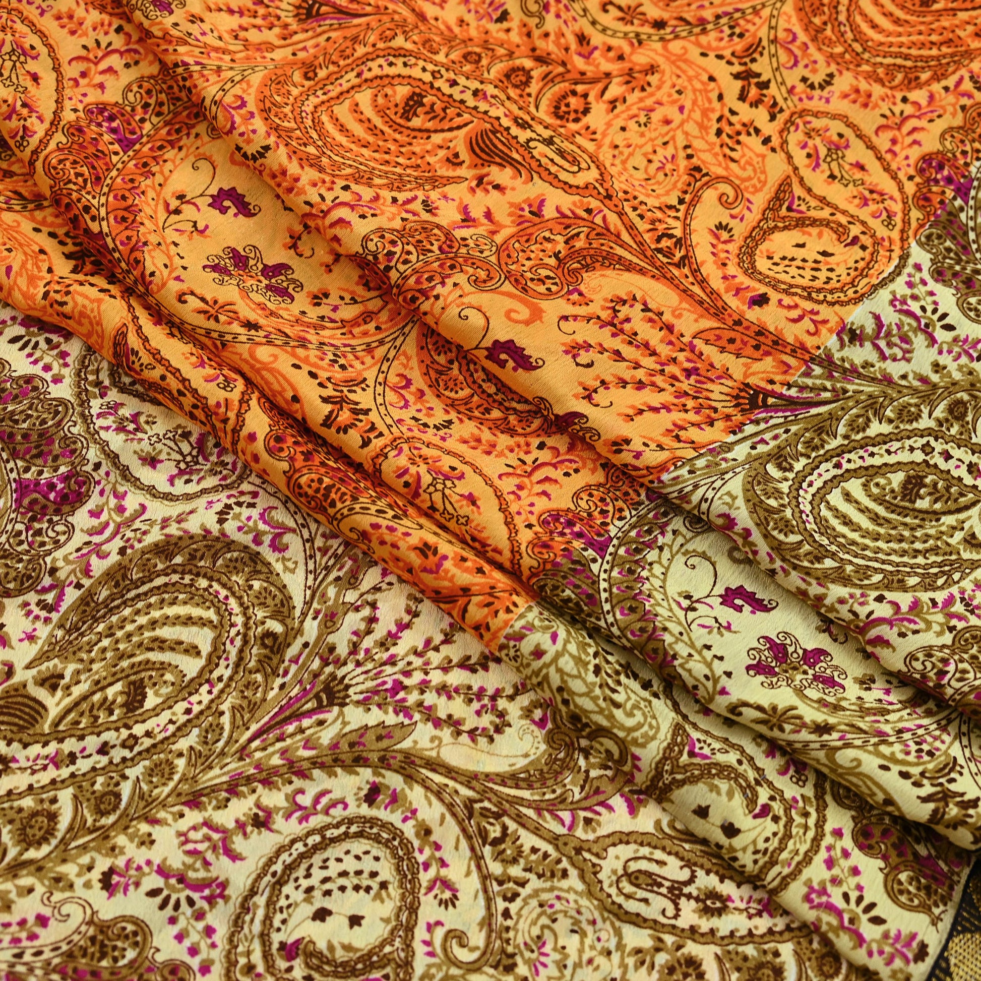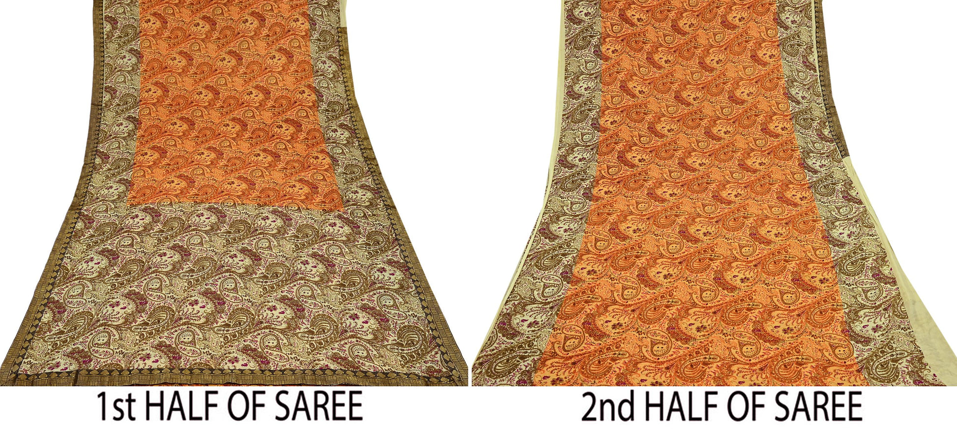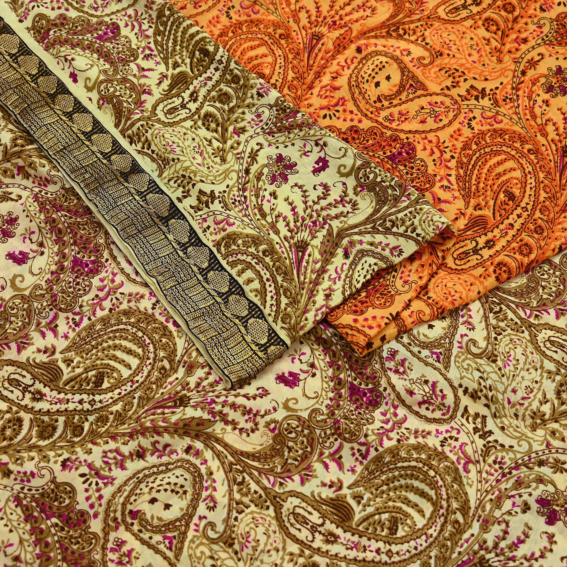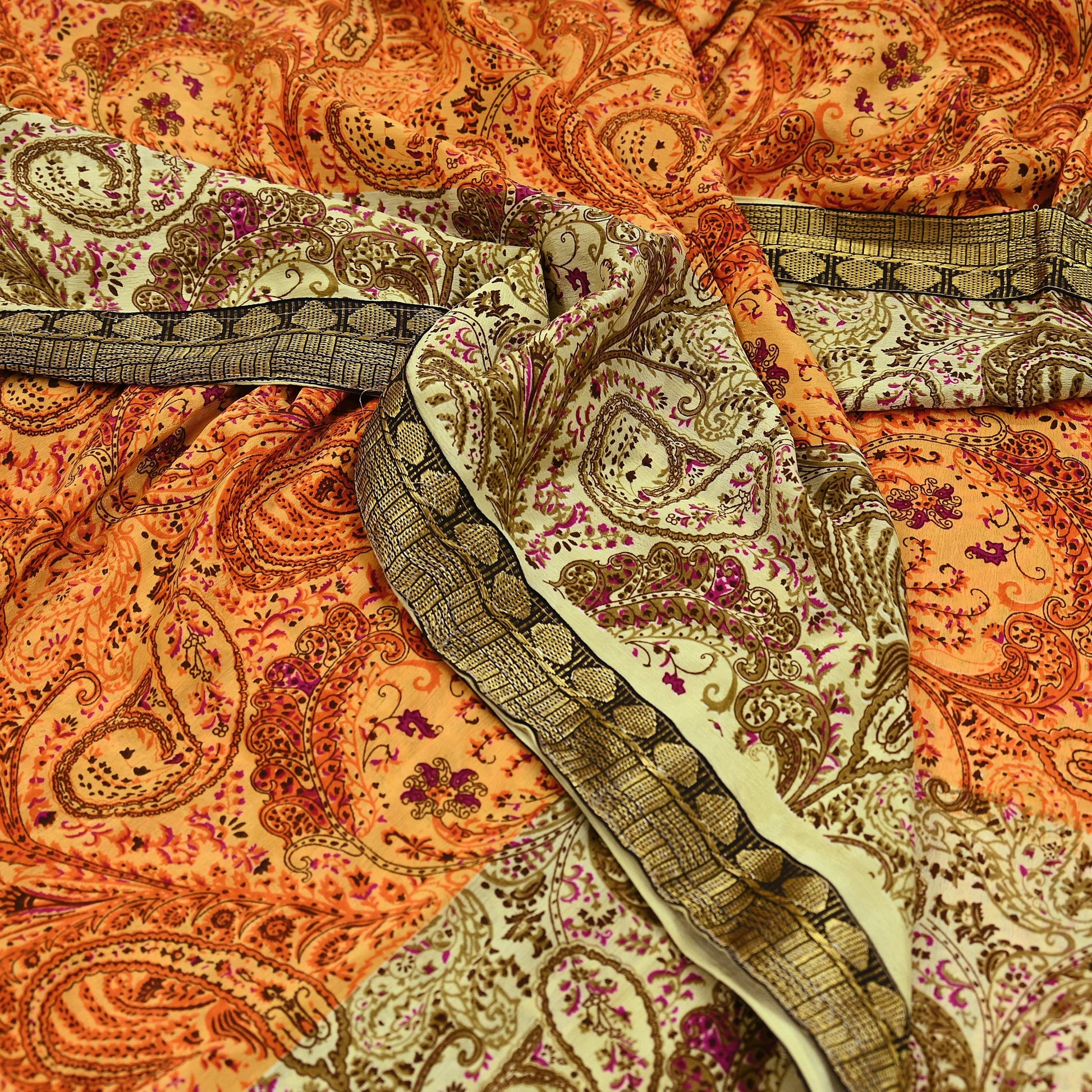 Add a touch of vintage charm to your creations with this Indian Vintage Saree in classic Beige & Saffron, featuring a stylish Floral & paisley print. Black zari Border Work. Made from soft and flowy moss crepe fabric, this 5-yard piece is perfect for sewing, dressmaking, crafting, quilting, and upcycling.