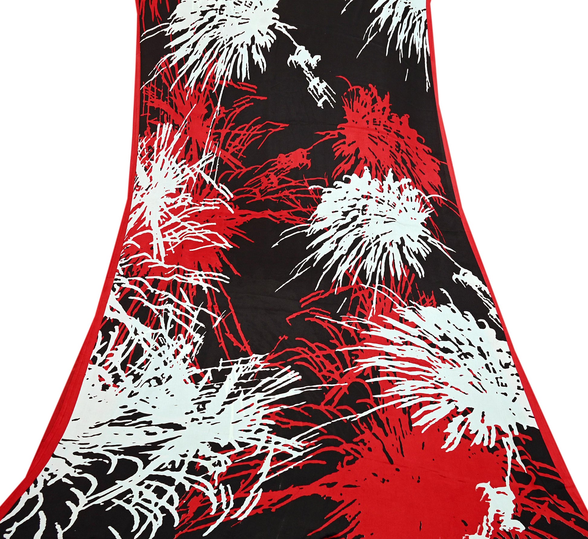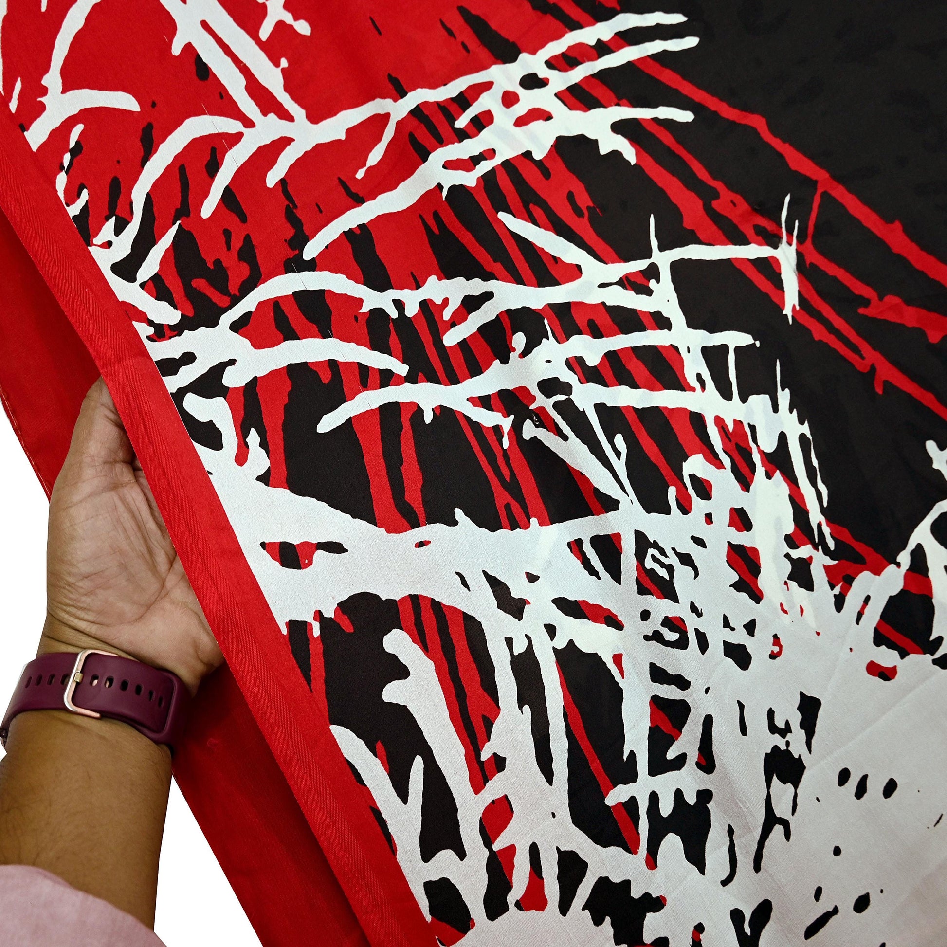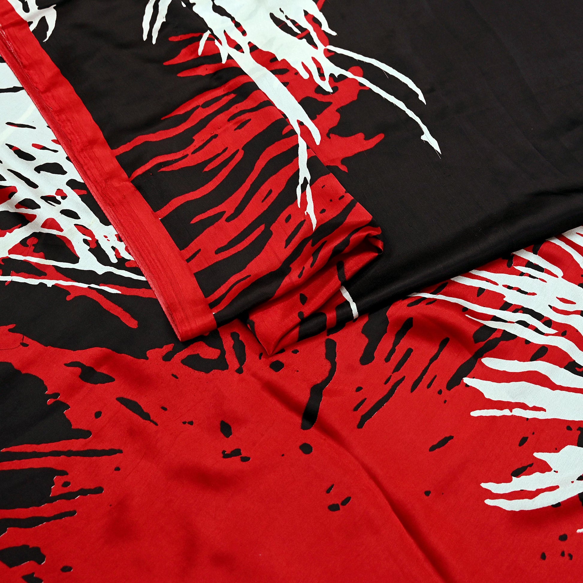 Nice Abstract Design With Printed Work On Black, Red & White Color Base Fabric Is Really Enhancing The Beauty Of The Saree.