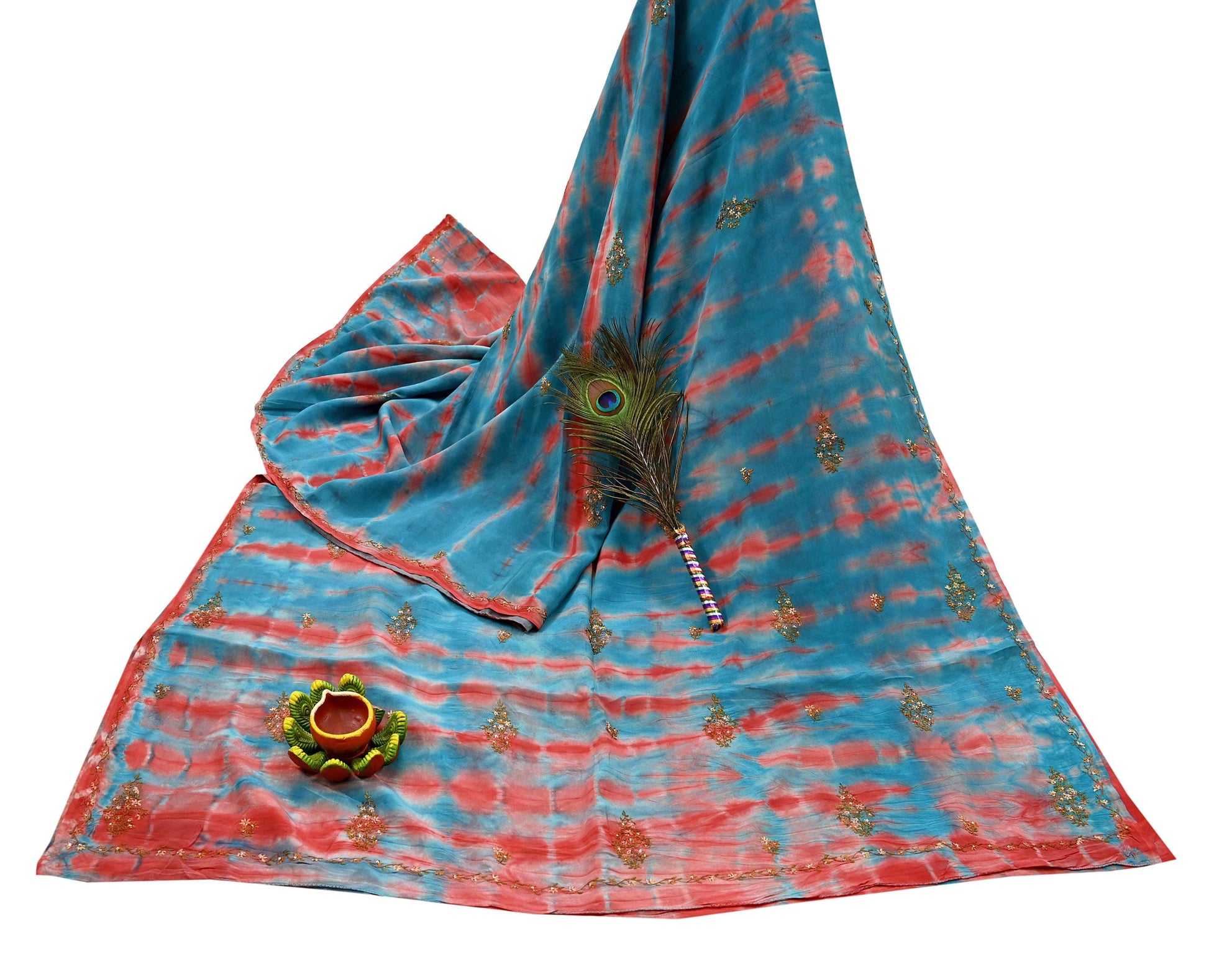 Outstanding shade of Blue & Red colored 100% pure Crepe silk hand embroidered Tie-dye saree.