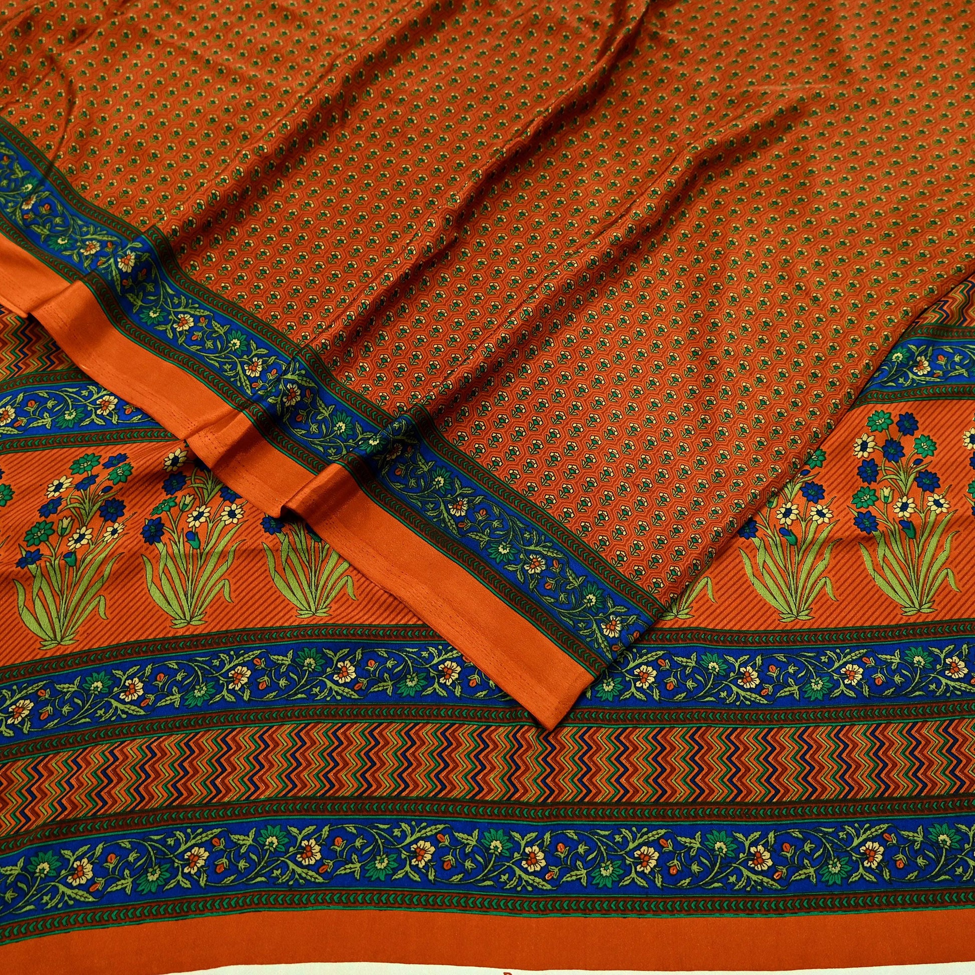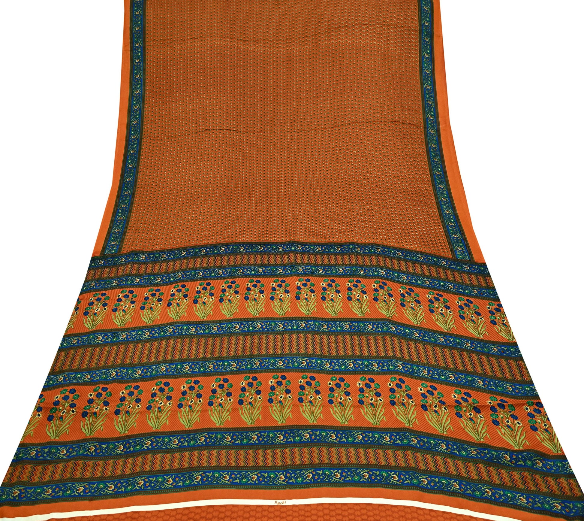 Indian Vintage Saree Orange Moss Crepe Printed Sari 5yd Sewing Floral Soft Craft Fabric Dressmaking Quilting Crafting Upcycle