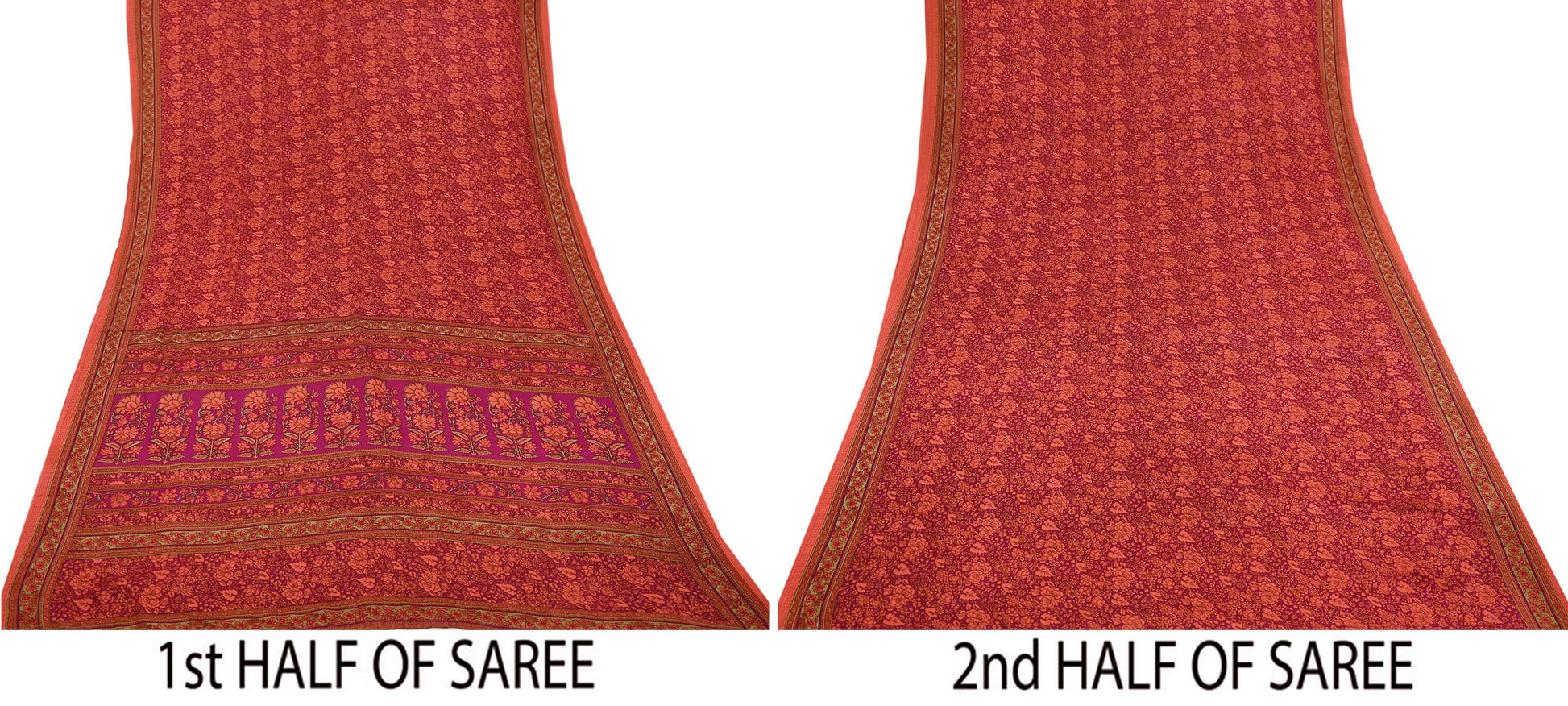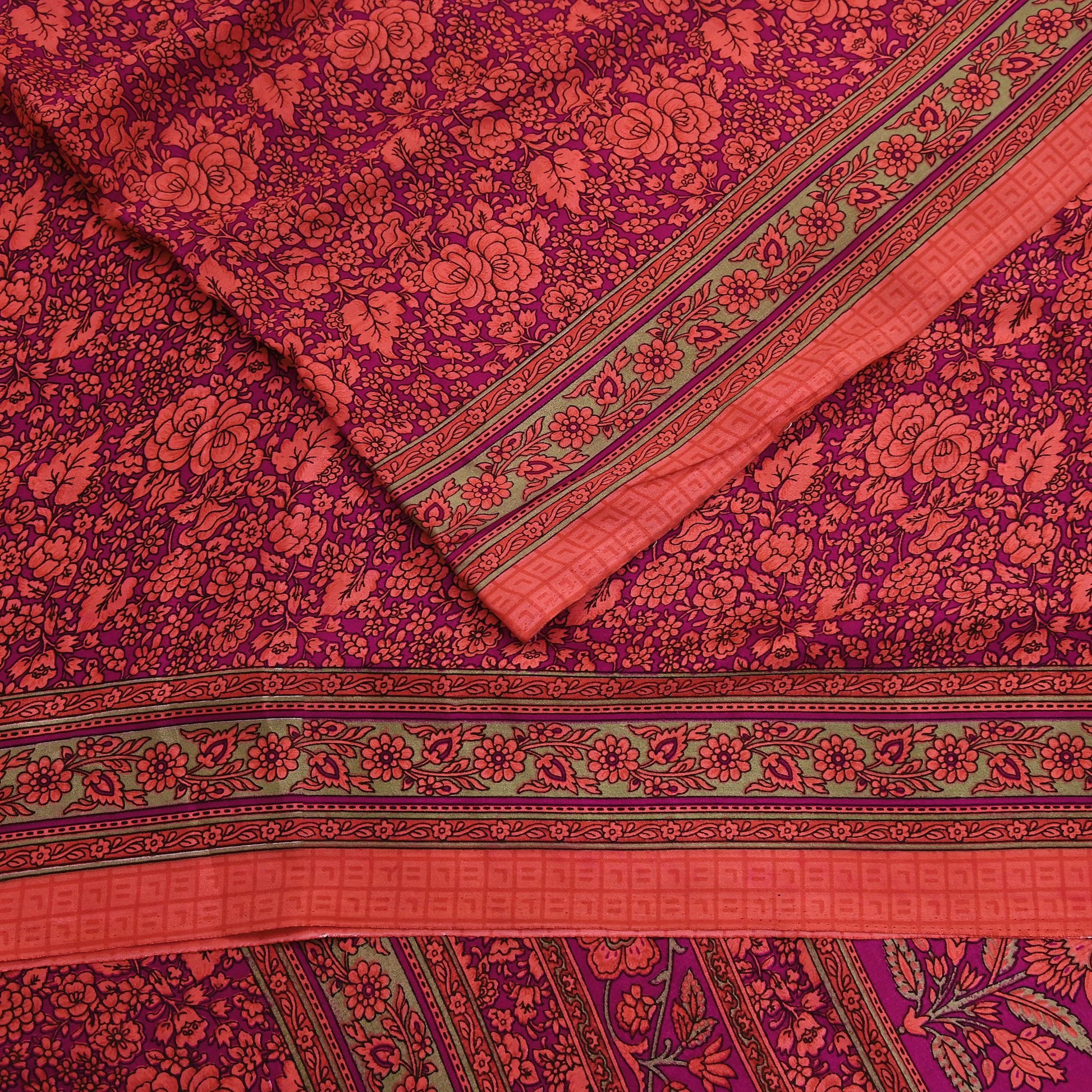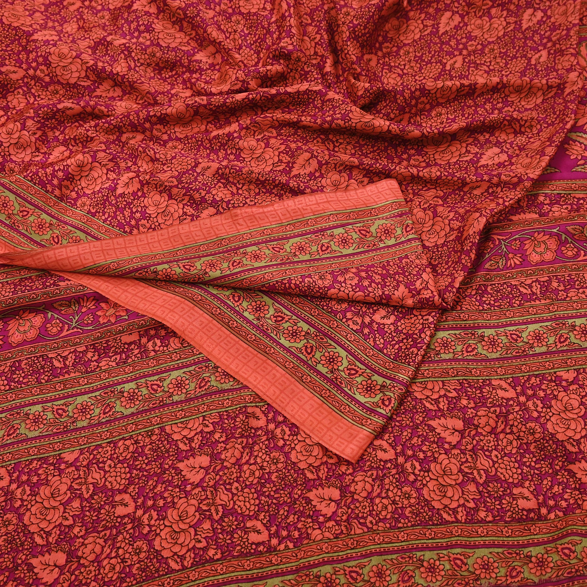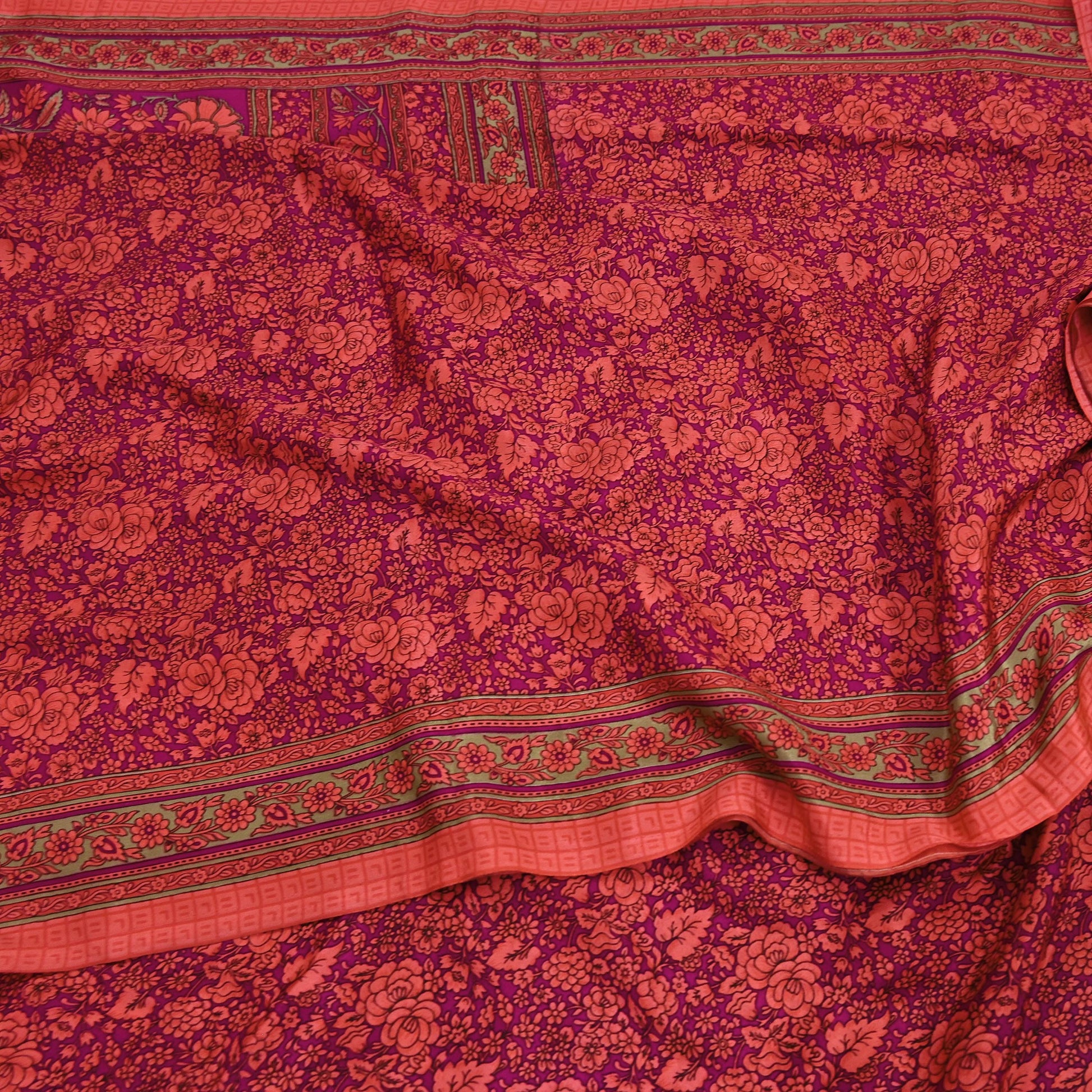 Indian Vintage Saree Peach & Purple Moss Crepe Printed Sari 5 Yards Floral Soft Fabric for Sewing, Dressmaking, Crafting, Quilting