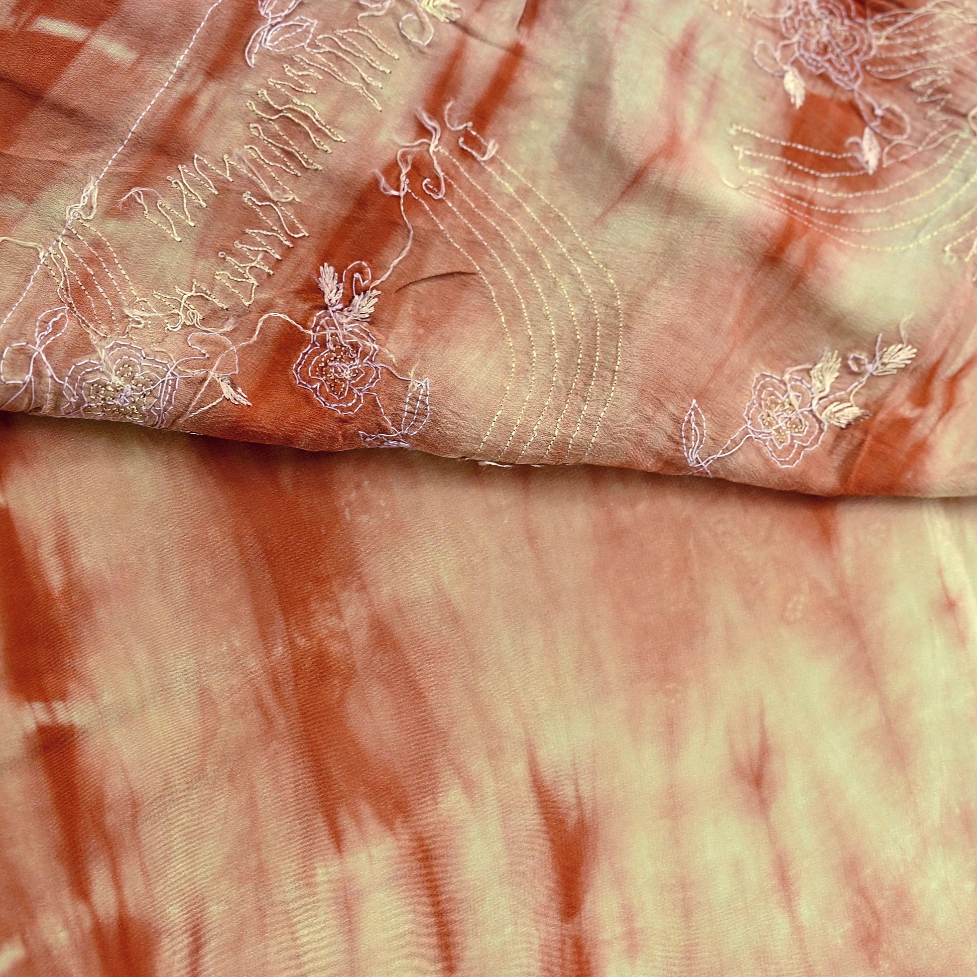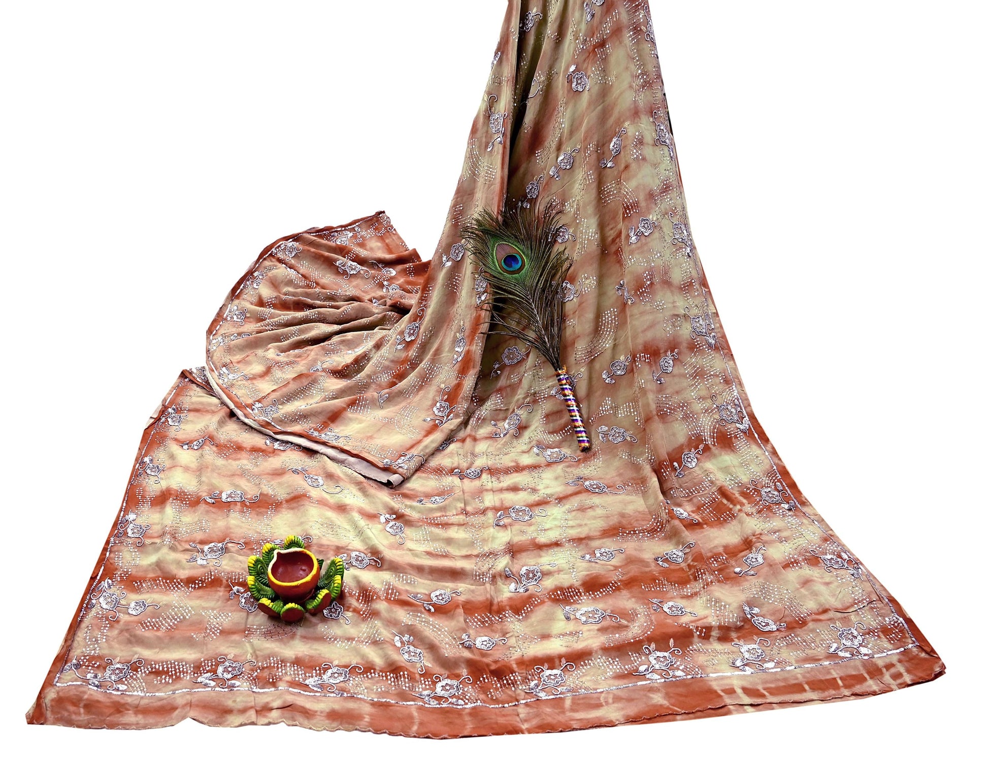 Outstanding shade of Rusty, Green colored 100% pure Crepe silk hand embroidered Tie-dye saree.