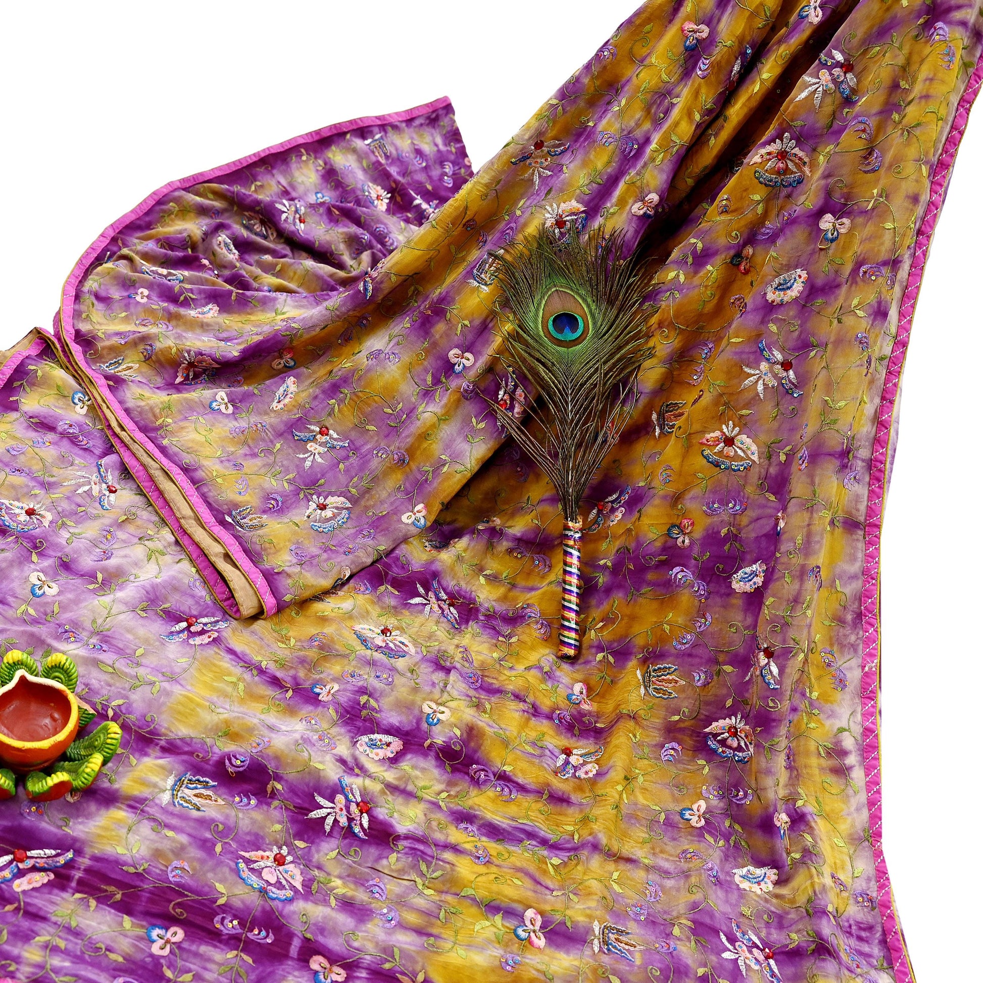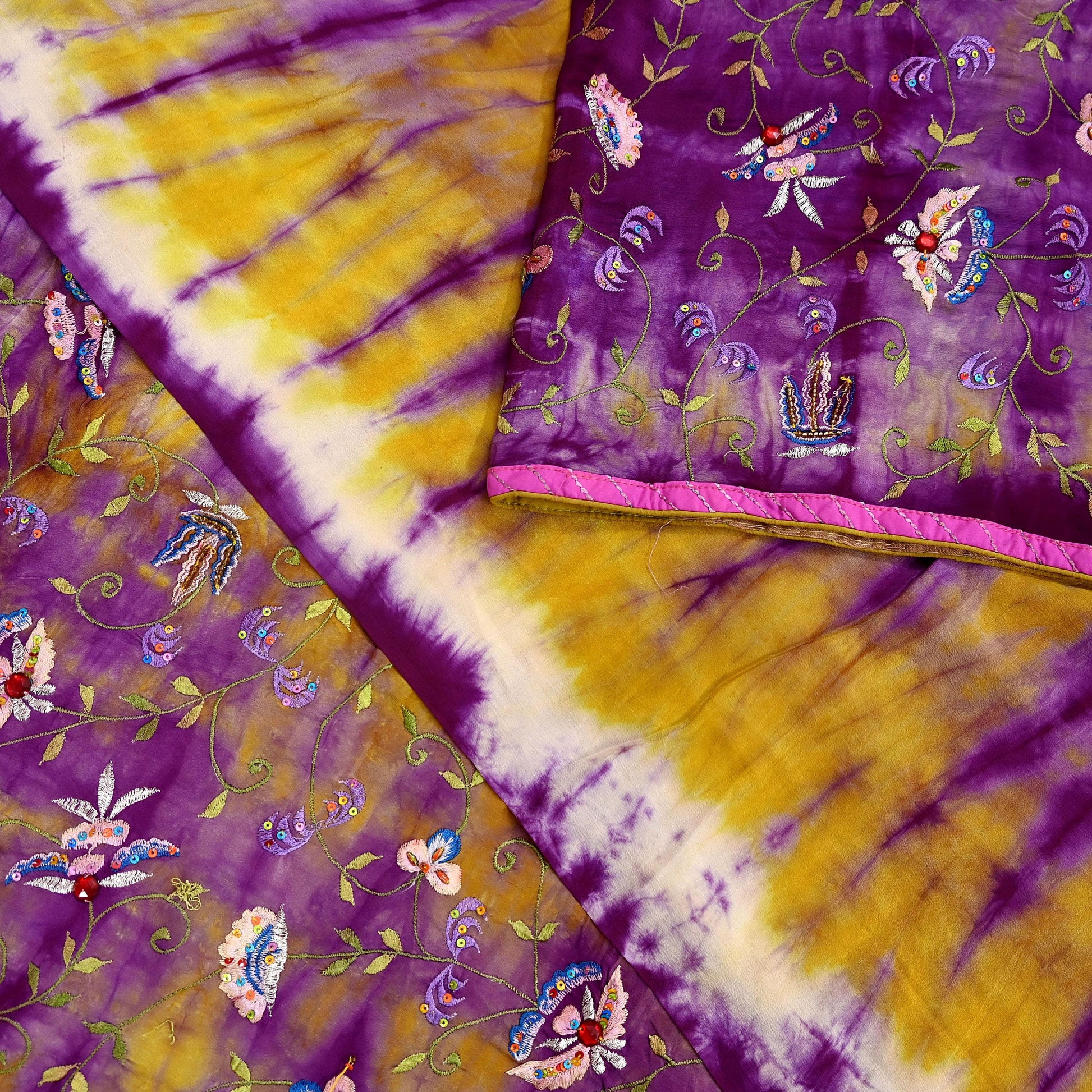 Outstanding shade of Purple & Yellow colored 100% pure Crepe silk hand embroidered Tie-dye saree.