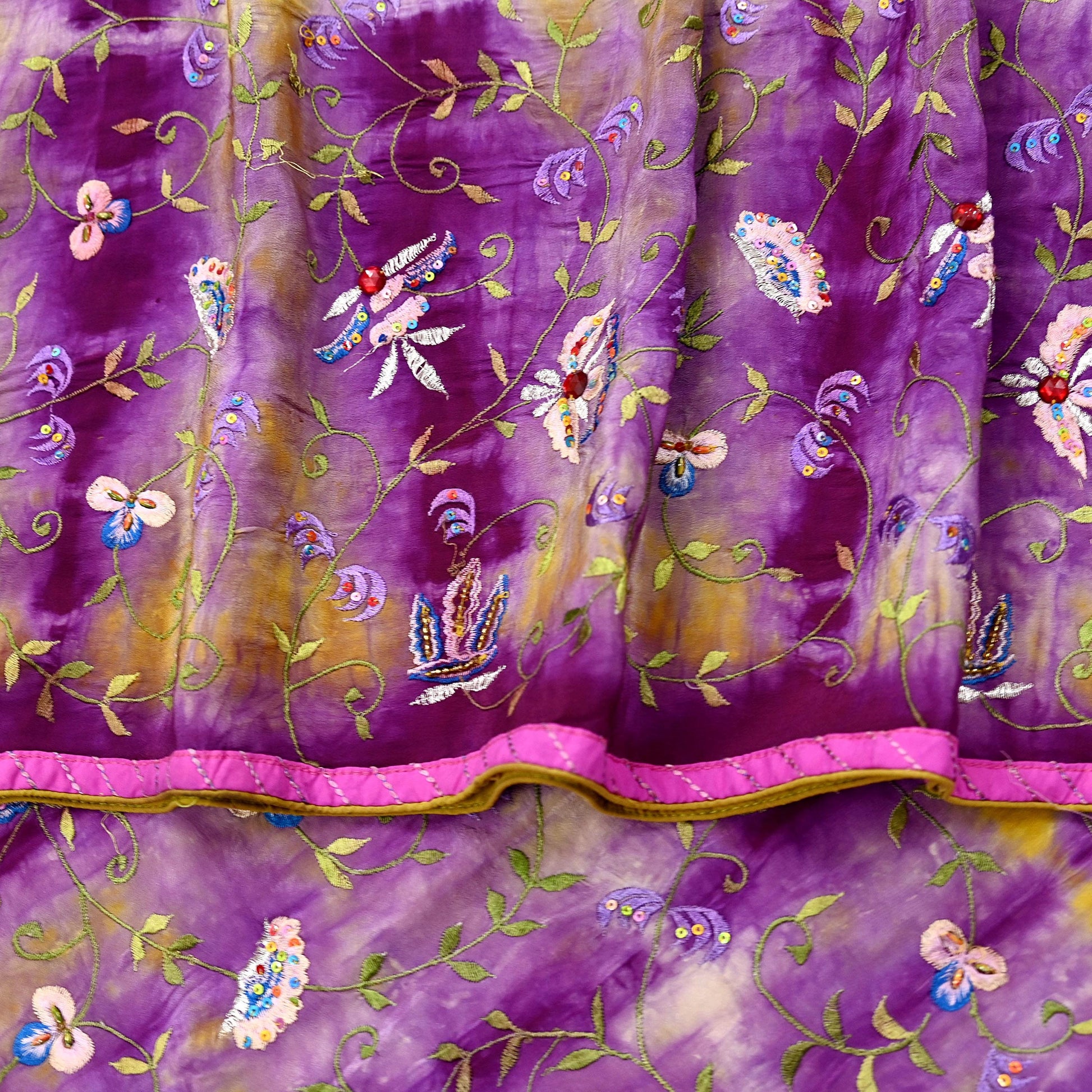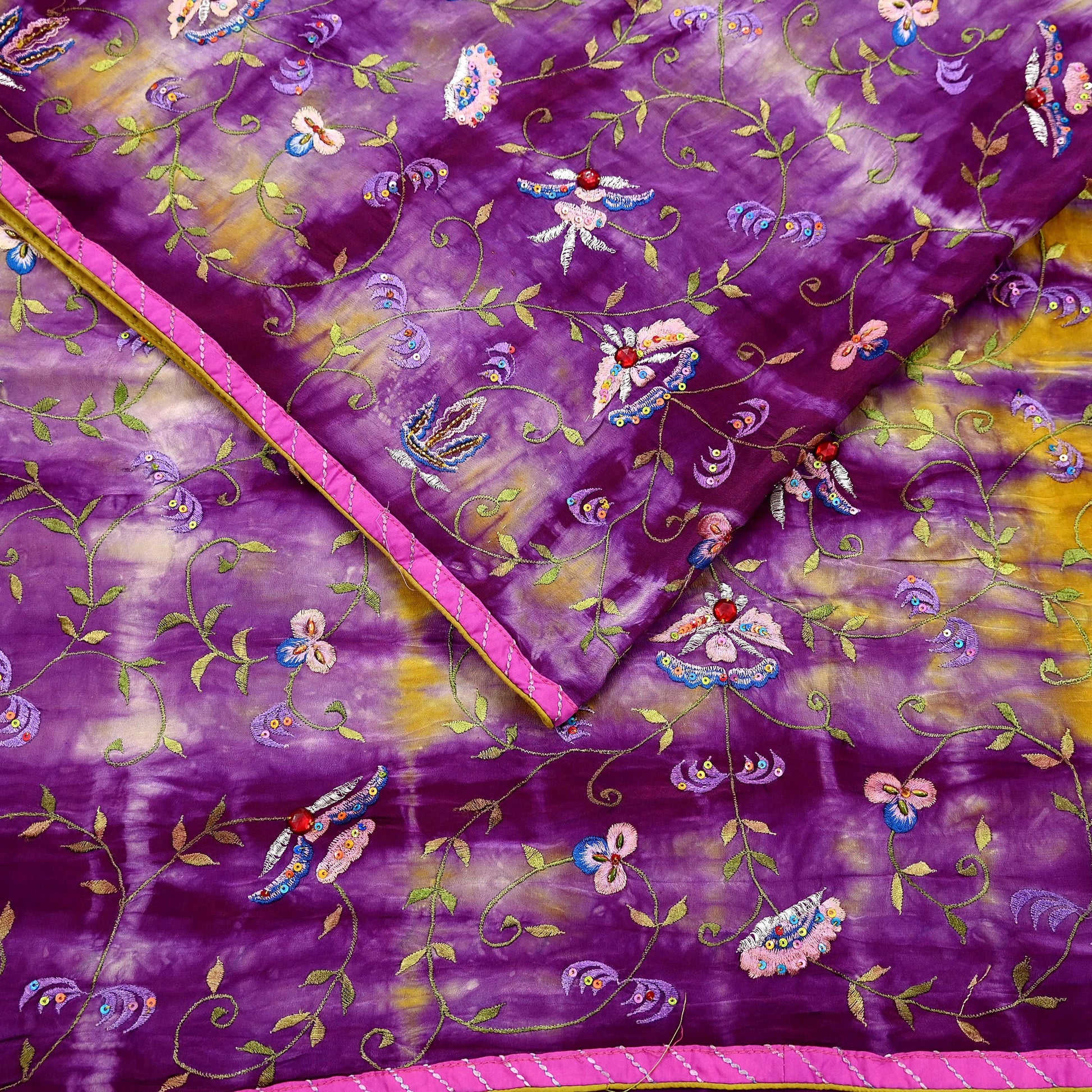 Indian Vintage Saree Purple & Yellow Pure Crepe Silk Hand Embroidered Tie-Dye Sari Fabric 5yard Sewing Craft Fabric Ethnic Dressmaking
