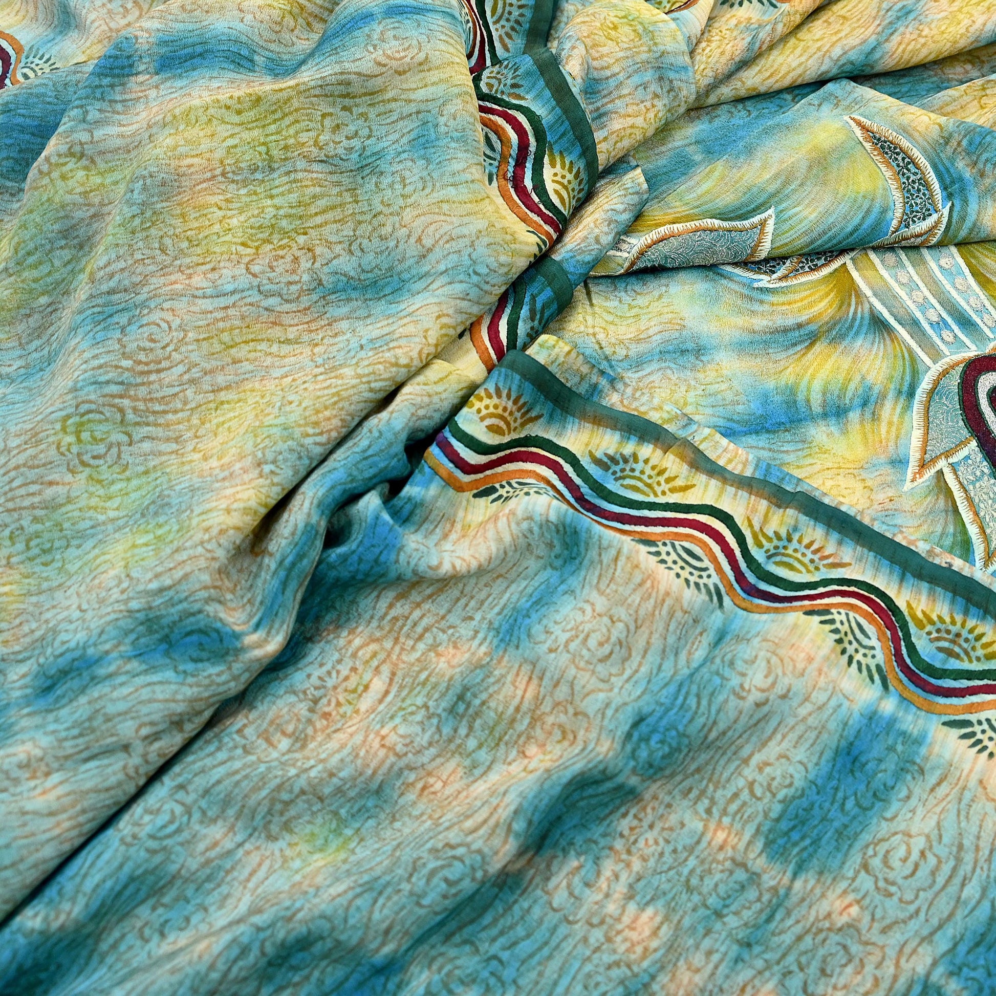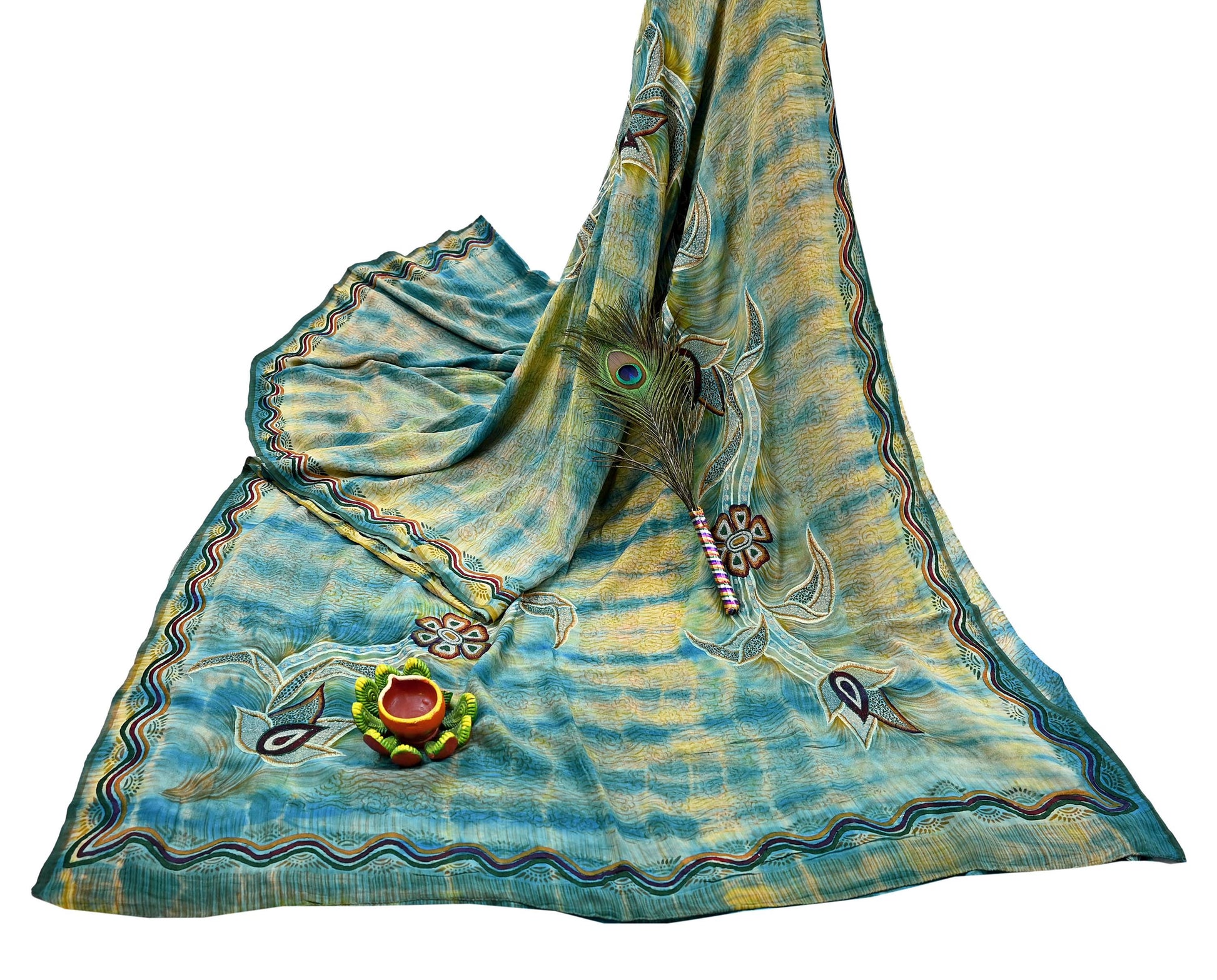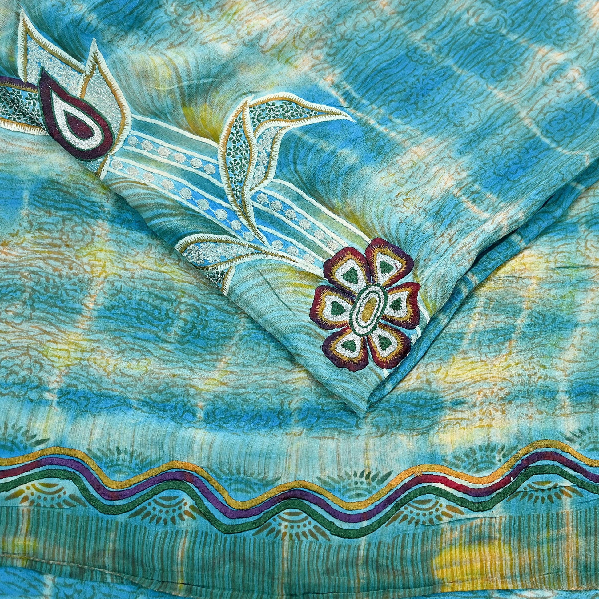 Outstanding shade of Yellow & Blue colored 100% pure Crepe silk hand embroidered Tie-dye saree.