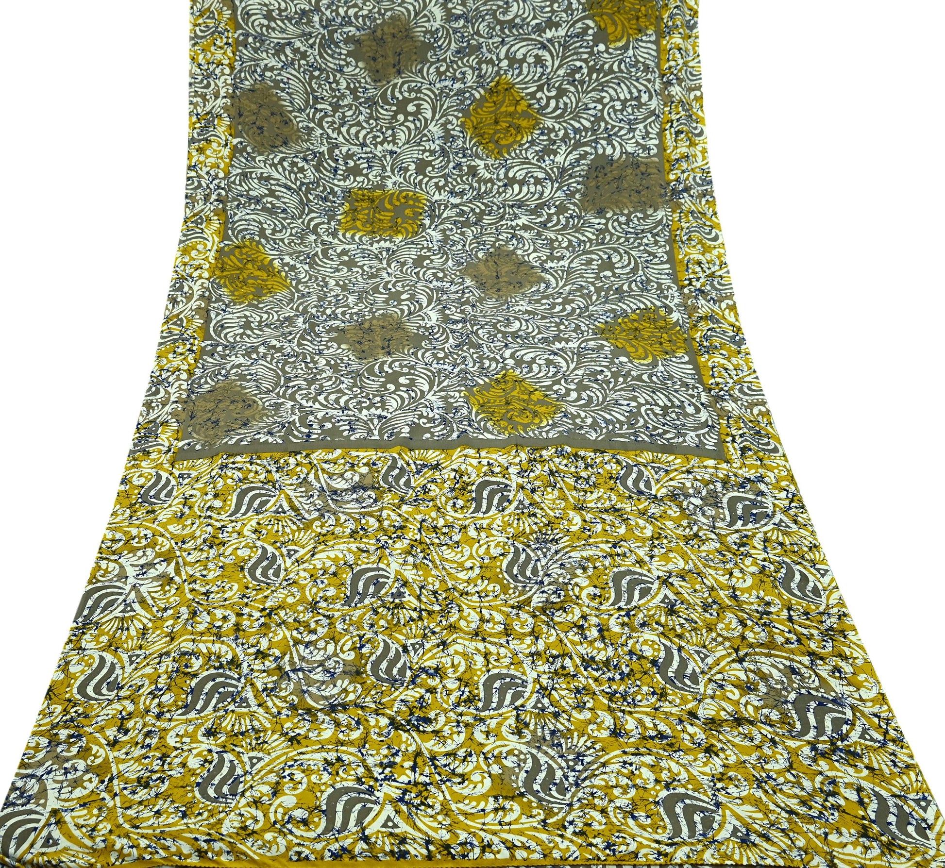 Indian Vintage Saree Yellow & Gray Moss Crepe Printed Sari | 5 Yards | Floral Soft Fabric for Sewing, Dressmaking, Crafting, Quilting