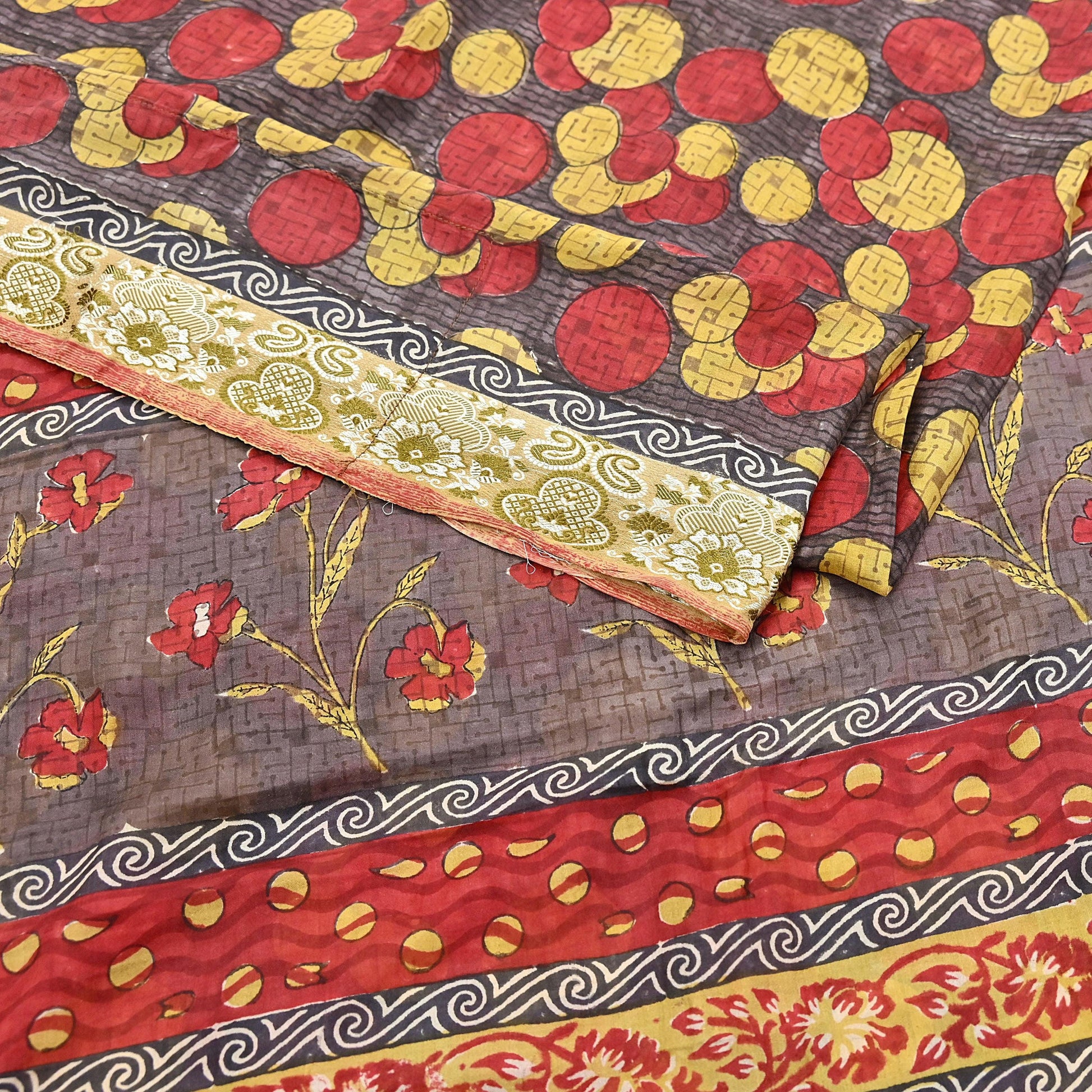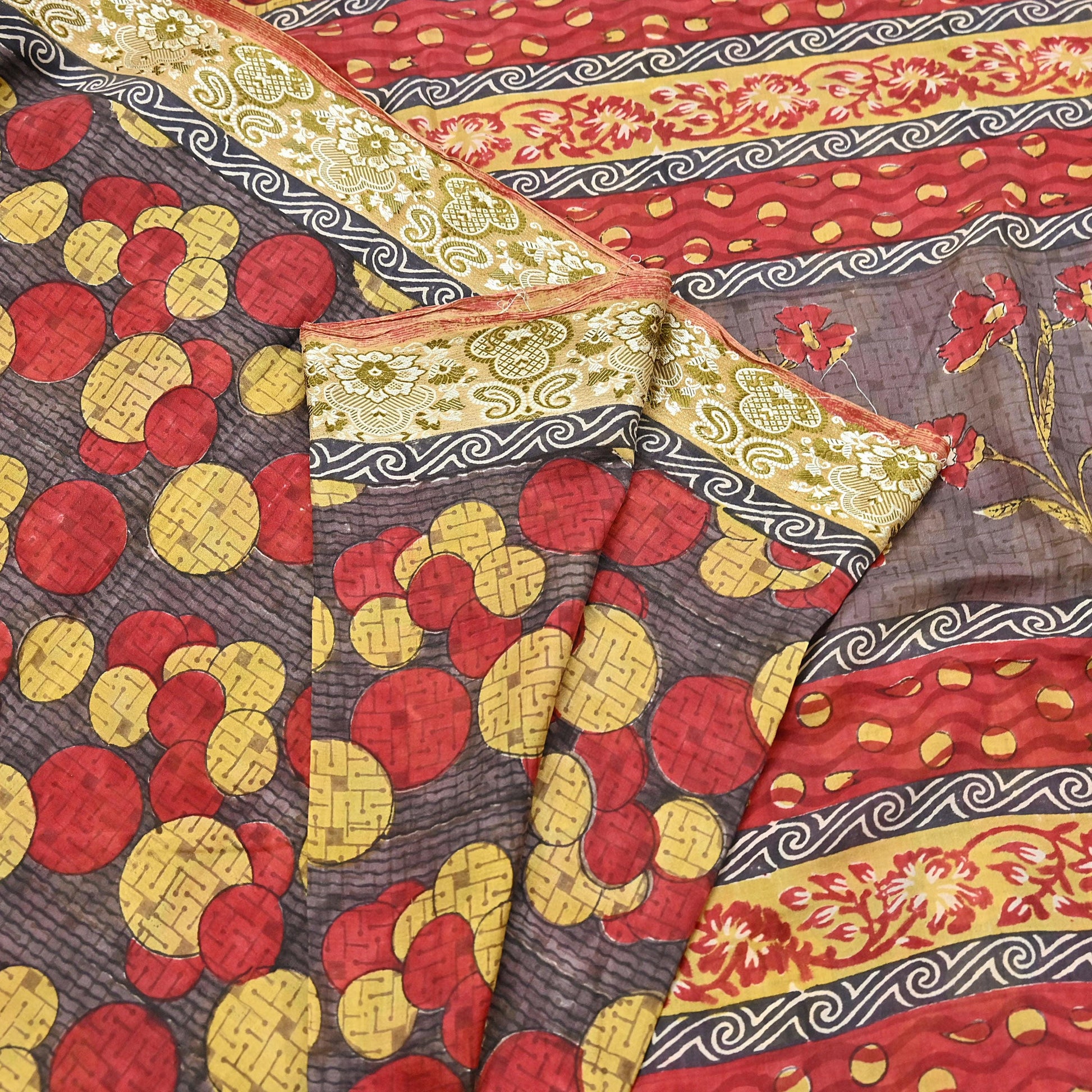 *This unique vintage Brown, Red & Yellow Colored Printed Pure Silk Saree .