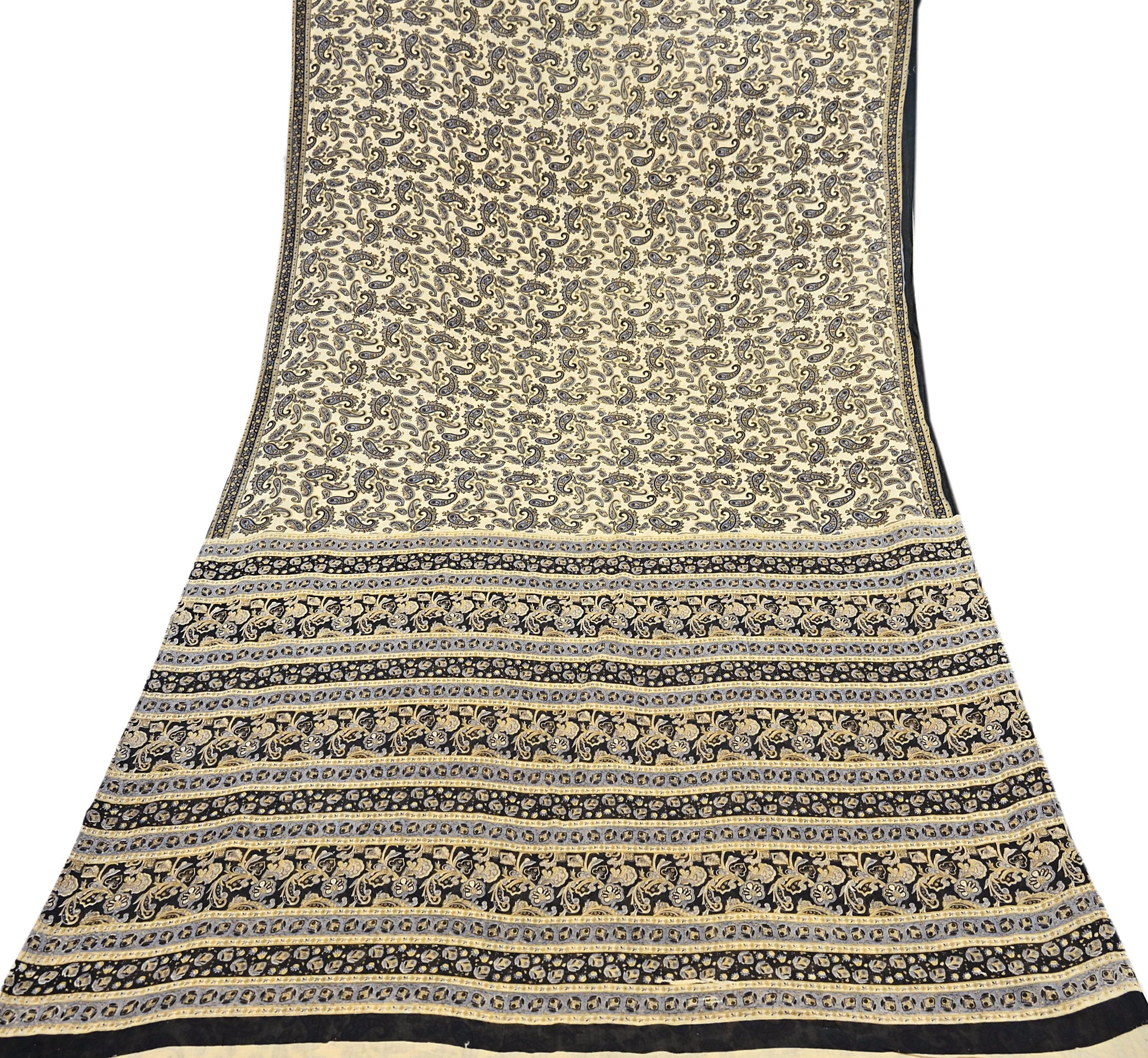 Indian Vintage Sari Beige & Black Printed 100% Pure Cotton Sarees Craft Fabric 5Yard Sewing Sarong Wrap Boho Dress making Quilting Soft